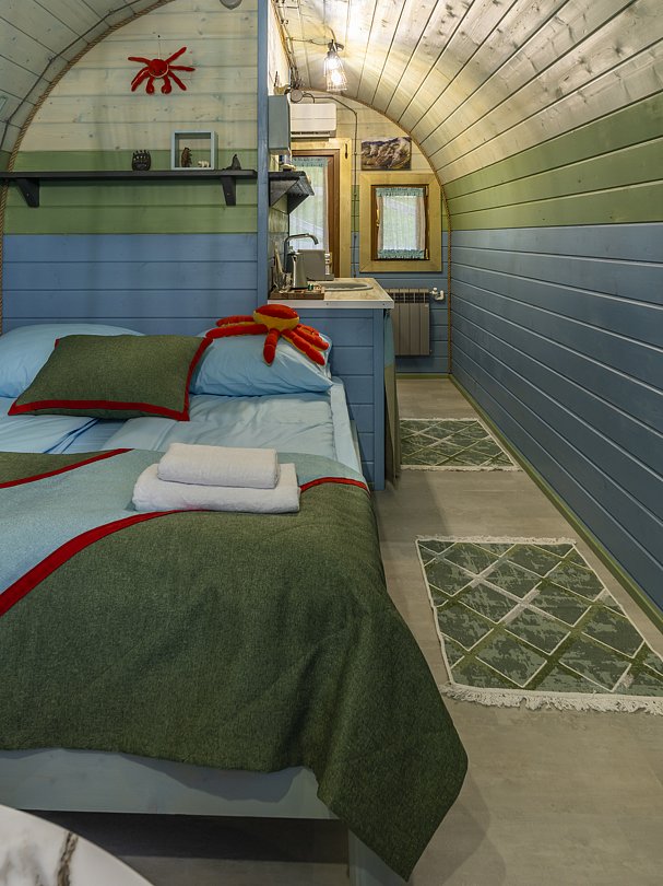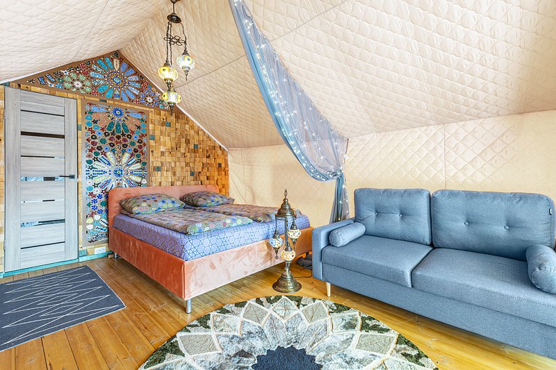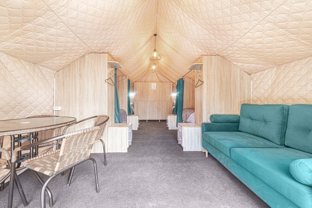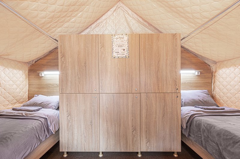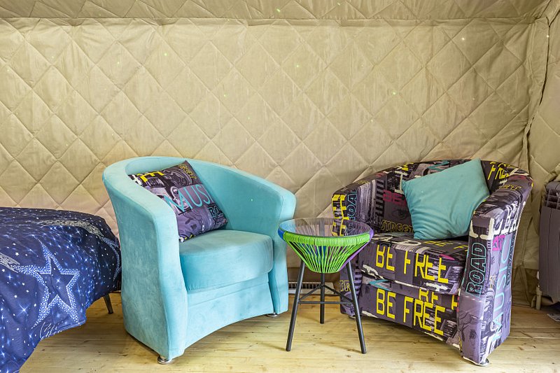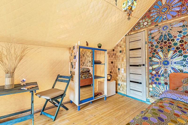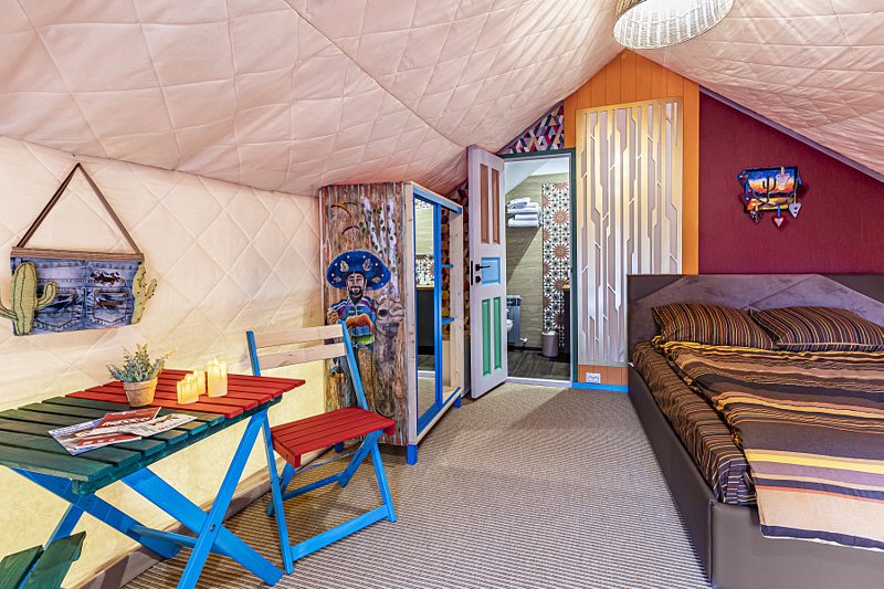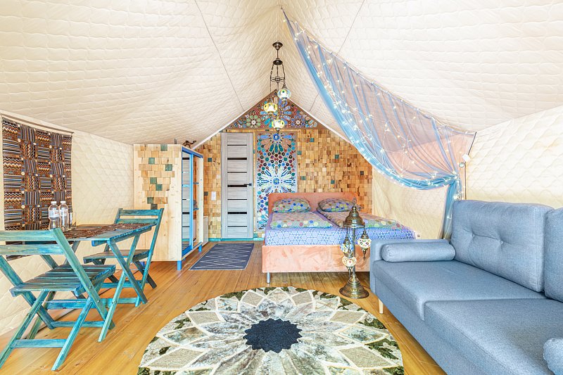 В глэмпинг-парке вас ждут комфортабельные сафари-тенты эконом-класса, рассчитанные на 4 или 6 человек, а также дизайнерские двухместные хаус-тенты. Каждый хаус-тент имеет свою уникальную атмосферу — от горячей Мексики до древнего Китая, от сказочного Марокко до ультрасовременного стиля Нитро. Номер «Веселый ковбой», оформленный в стиле дилижанса, подарит вам незабываемые виды на природу через панорамное окно.