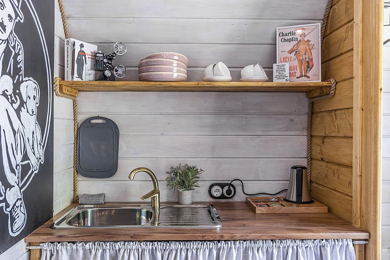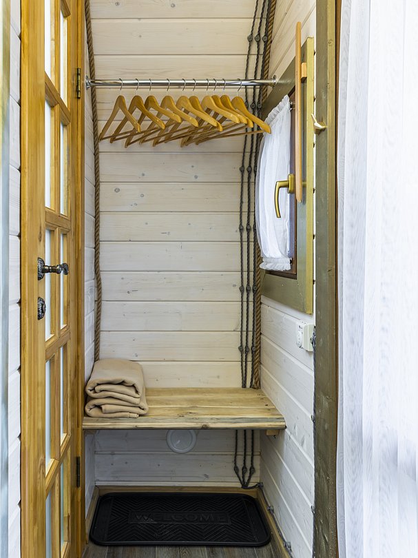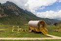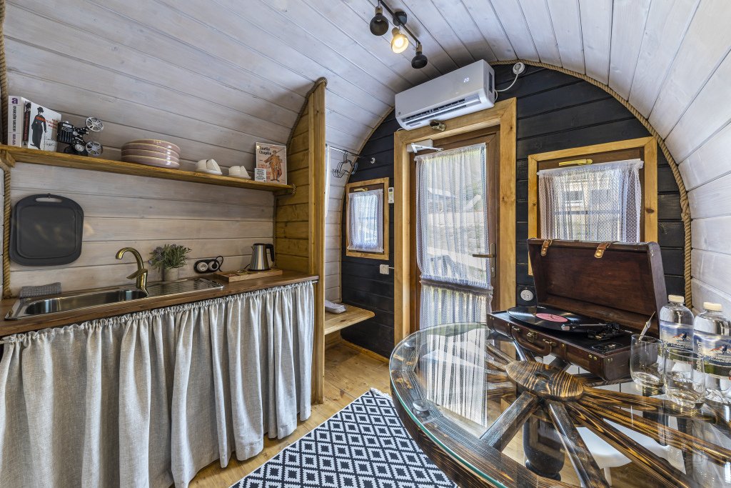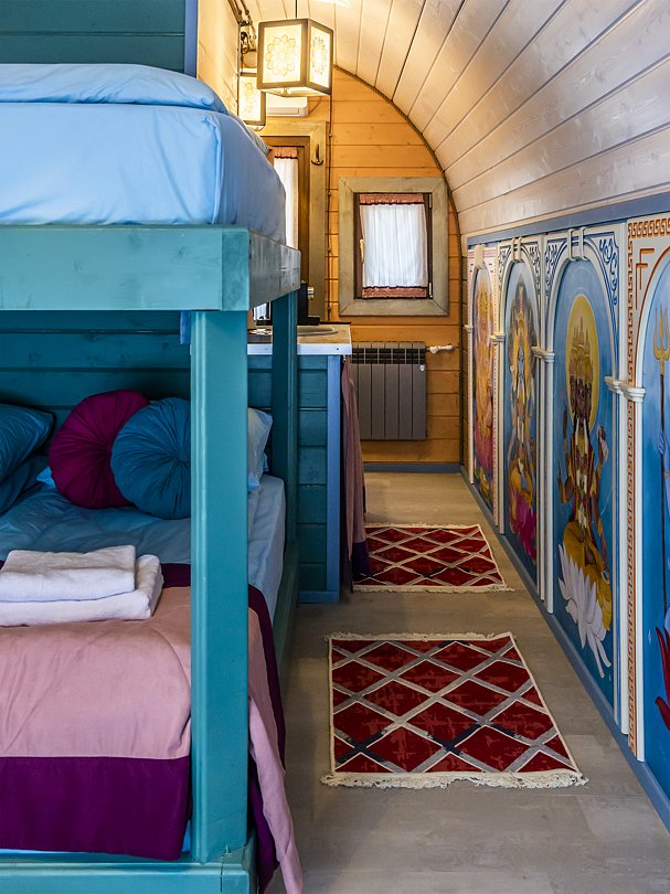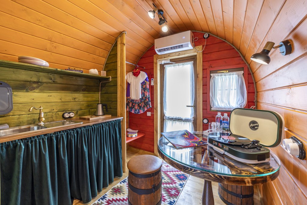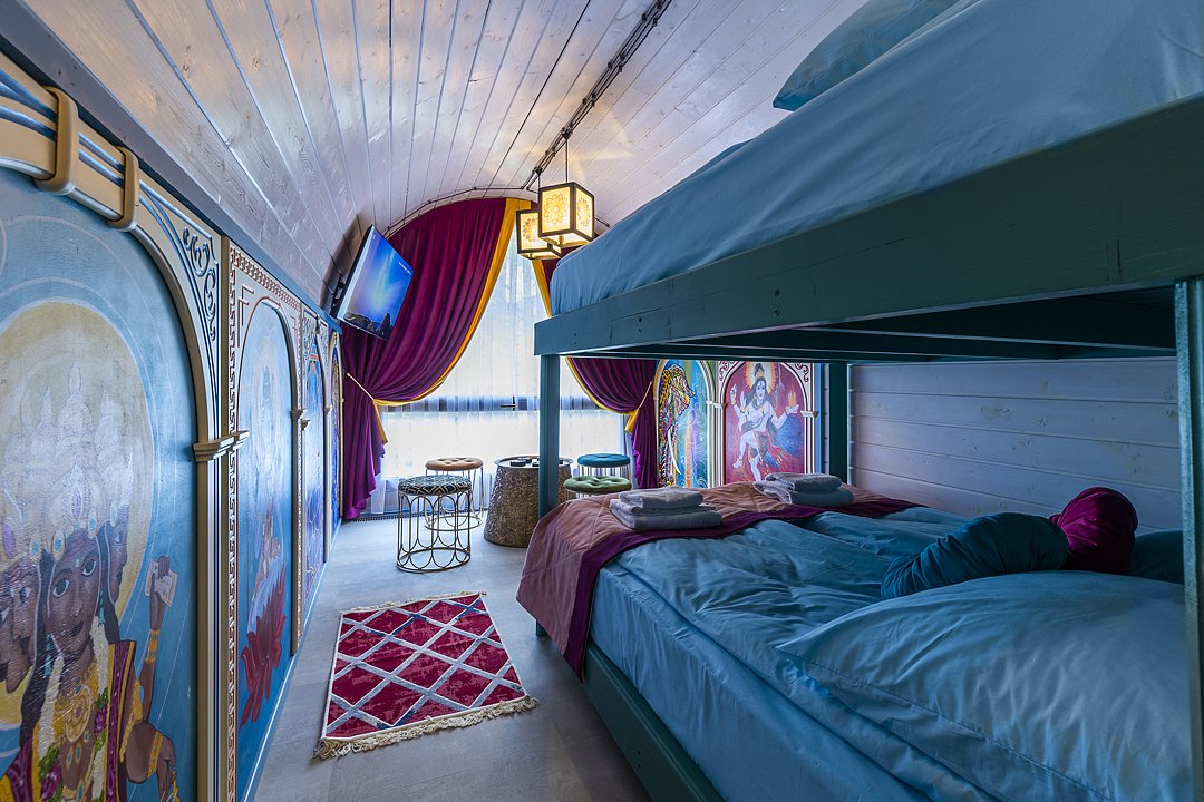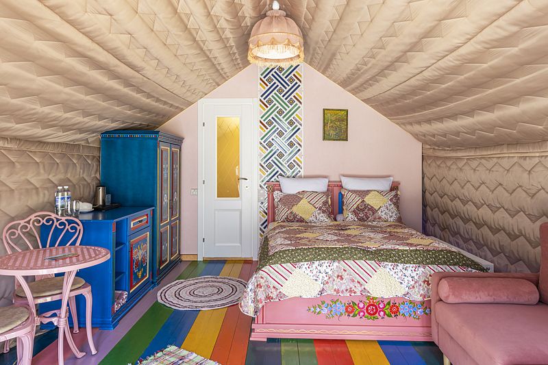 В глэмпинг-парке вас ждут комфортабельные сафари-тенты эконом-класса, рассчитанные на 4 или 6 человек, а также дизайнерские двухместные хаус-тенты. Каждый хаус-тент имеет свою уникальную атмосферу — от горячей Мексики до древнего Китая, от сказочного Марокко до ультрасовременного стиля Нитро. Номер «Веселый ковбой», оформленный в стиле дилижанса, подарит вам незабываемые виды на природу через панорамное окно.