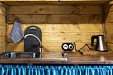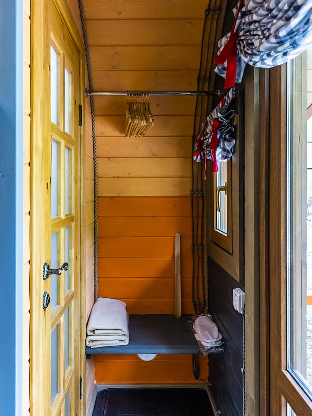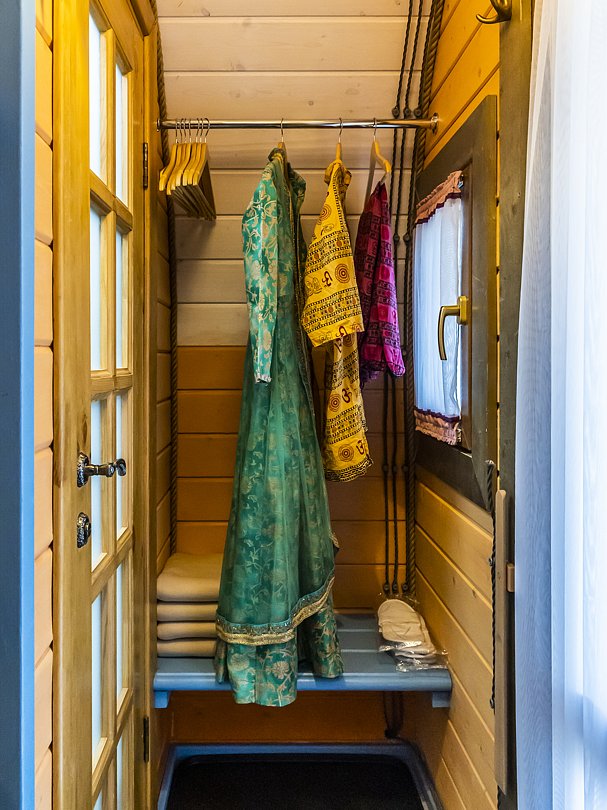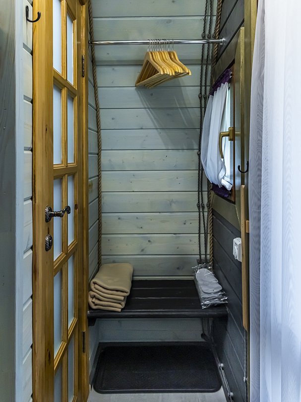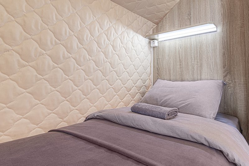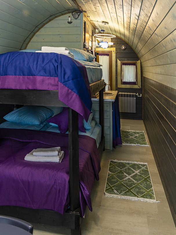 Отделенное шторкой спальное место с розеткой и светильником, личный шкаф, полотенце. В прохладное время предусмотрены электропростыни и обогреватели.
