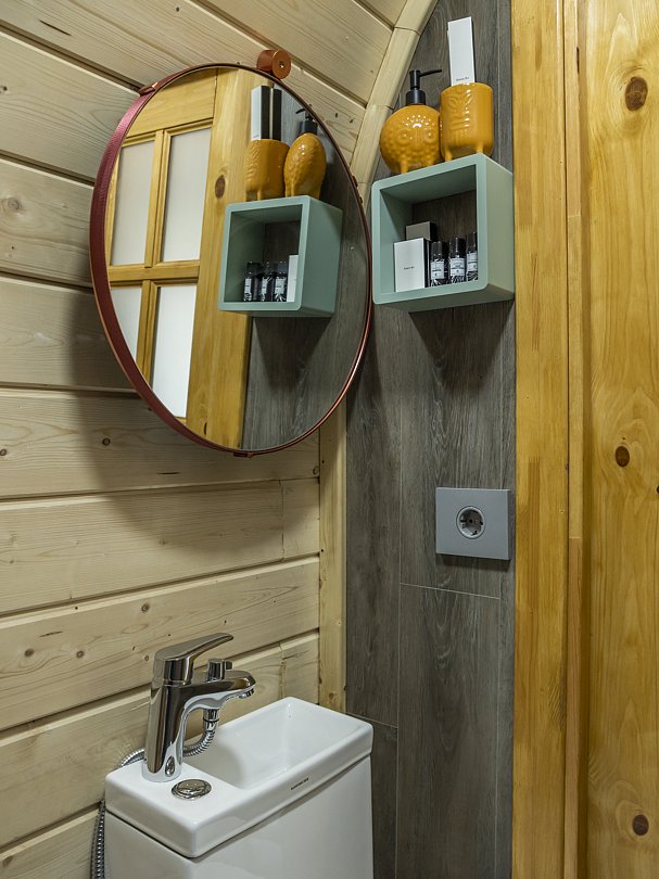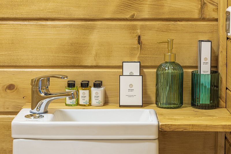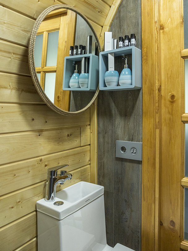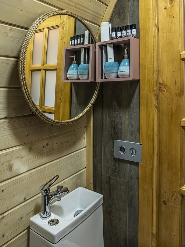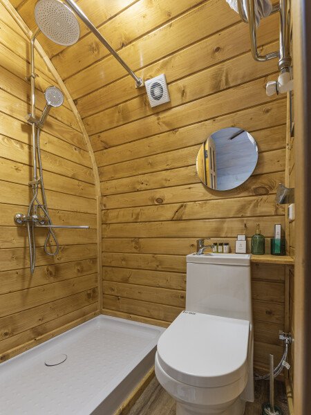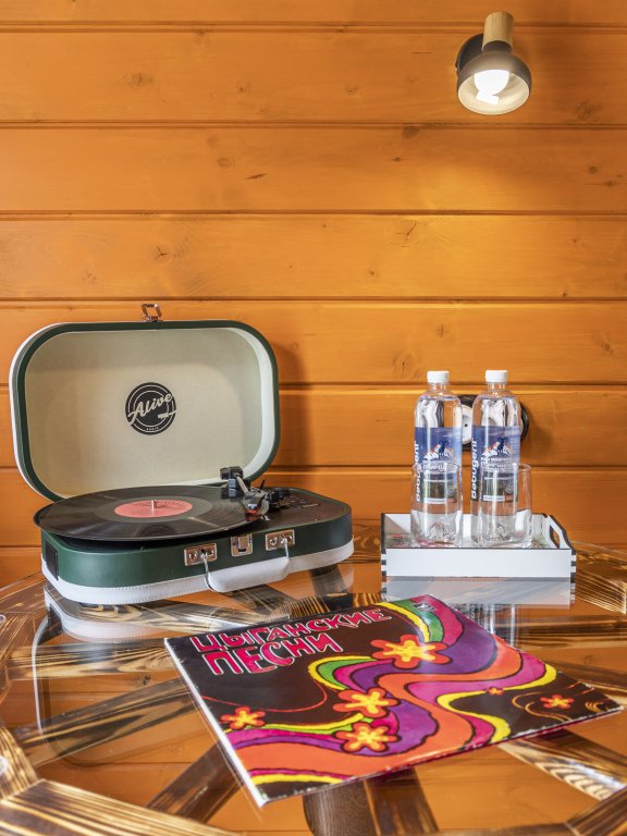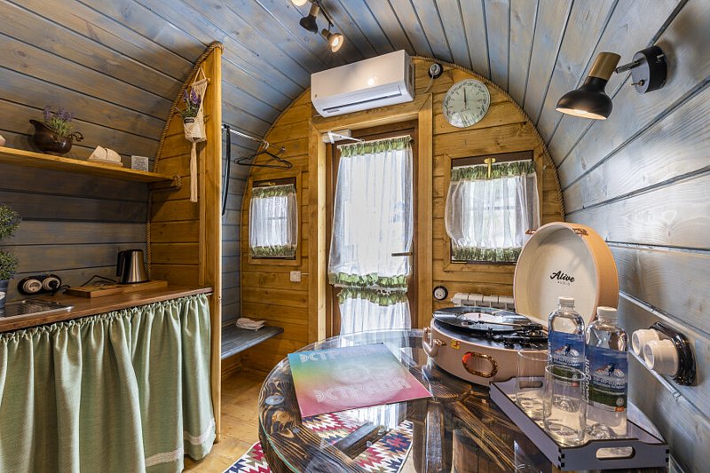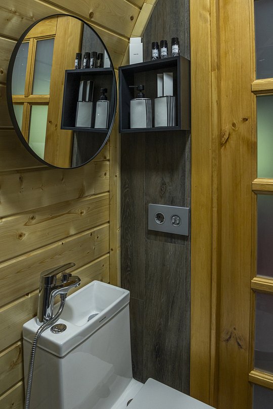 В номере: 2х-спальная кровать, дизайнерская мебель и предметы интерьера, санузел и душ в номере, косметические принадлежности, фен, чайная зона, холодильник, сейф, уличная терраса с мебелью и гамаком, собственная гриль-зона, в холодное время предусмотрено отопление.
