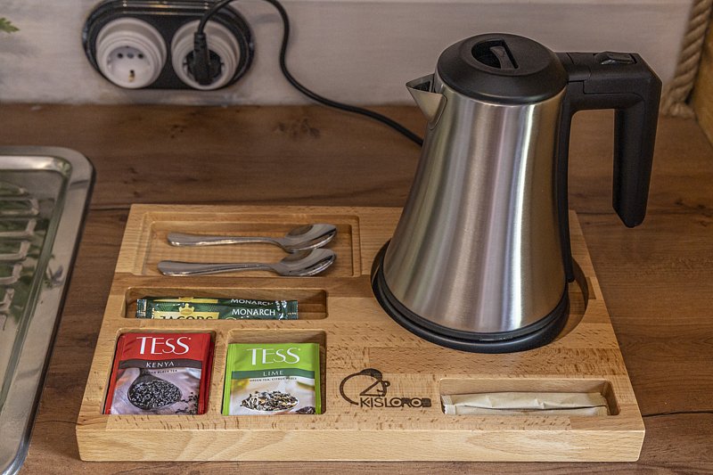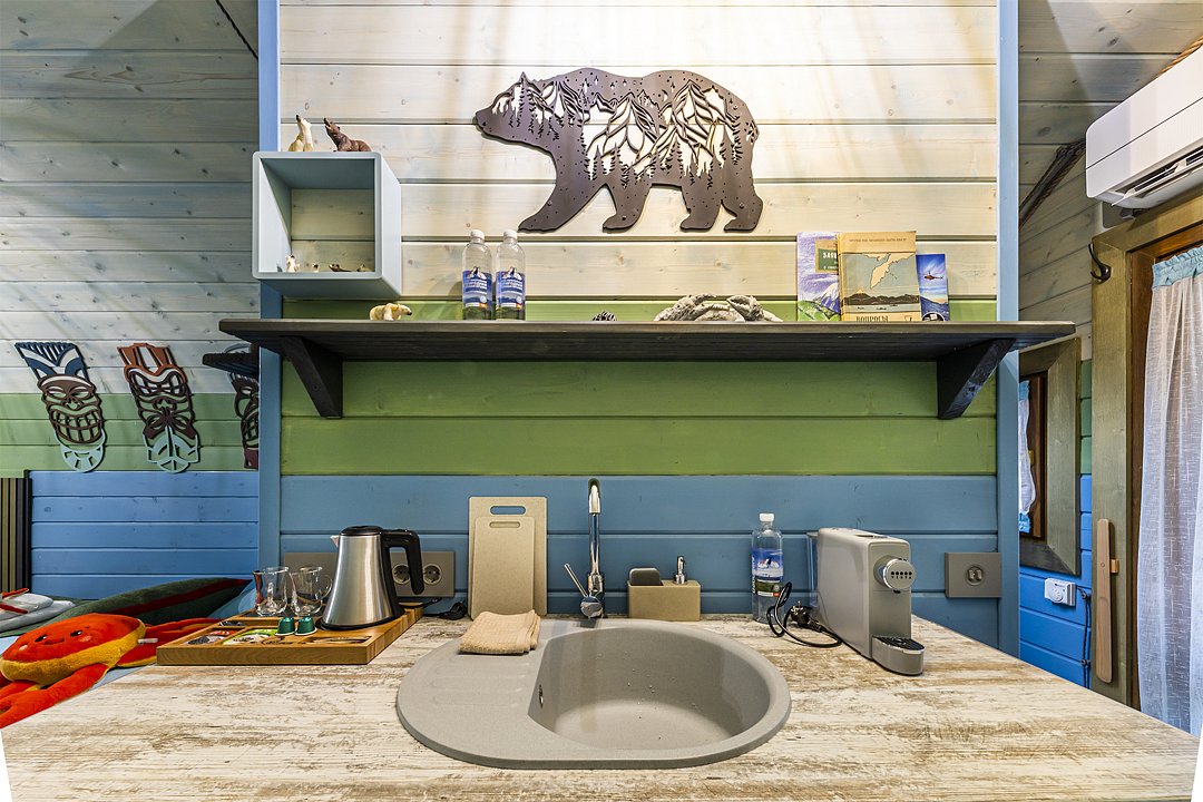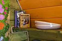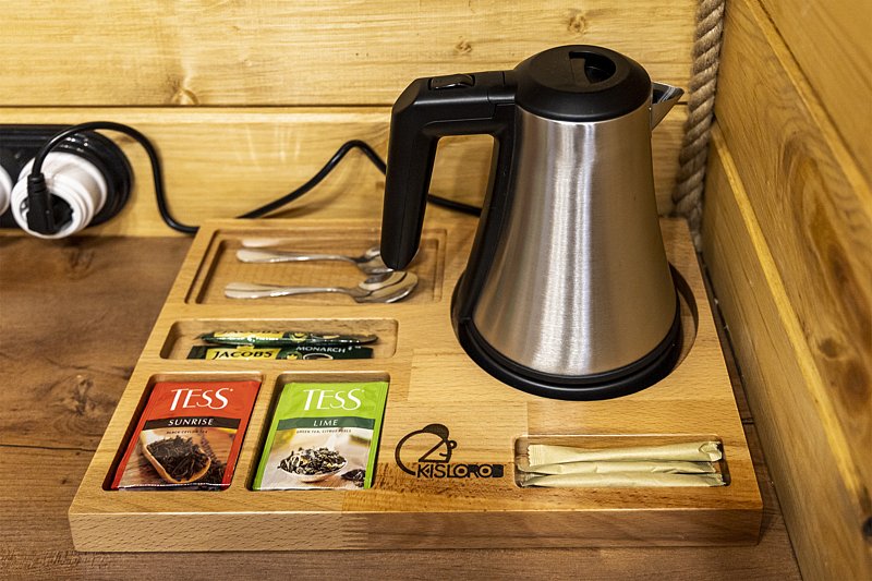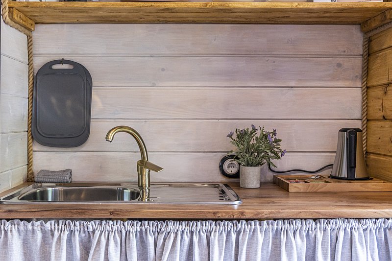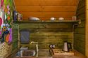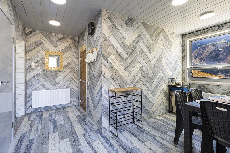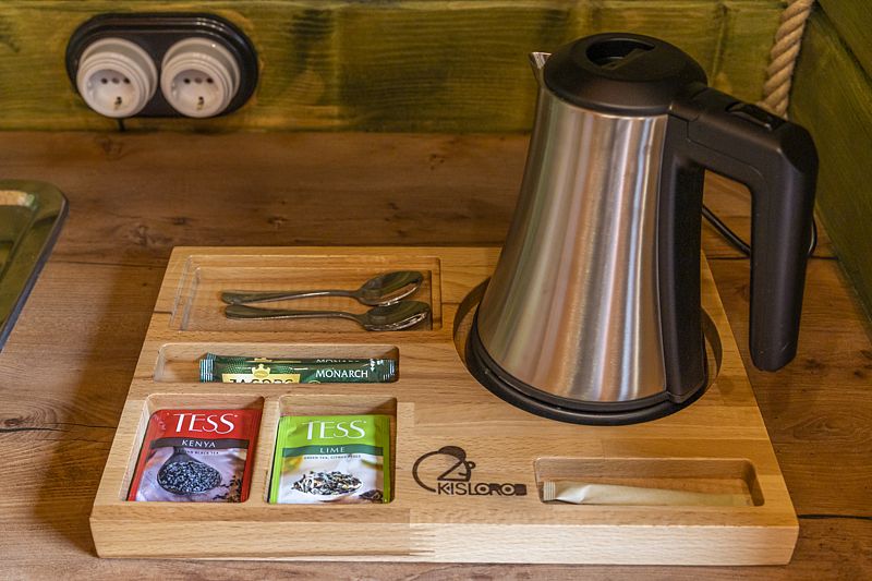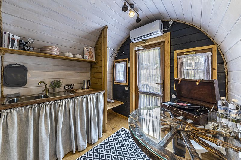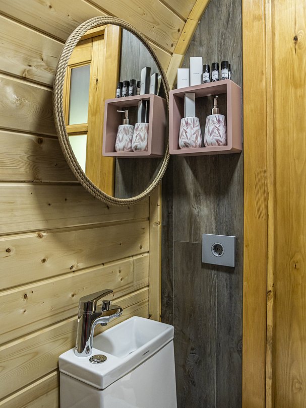 В номере: 2х-спальная кровать, дизайнерская мебель и предметы интерьера, санузел и душ в номере, косметические принадлежности, фен, чайная зона, холодильник, сейф, уличная терраса с мебелью и гамаком, собственная гриль-зона, в холодное время предусмотрено отопление.