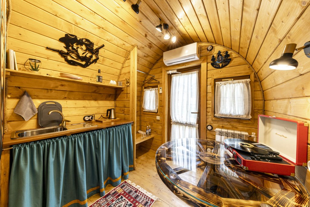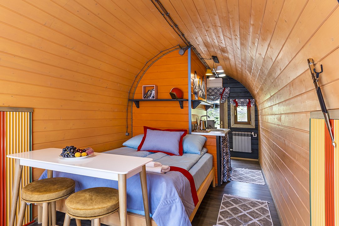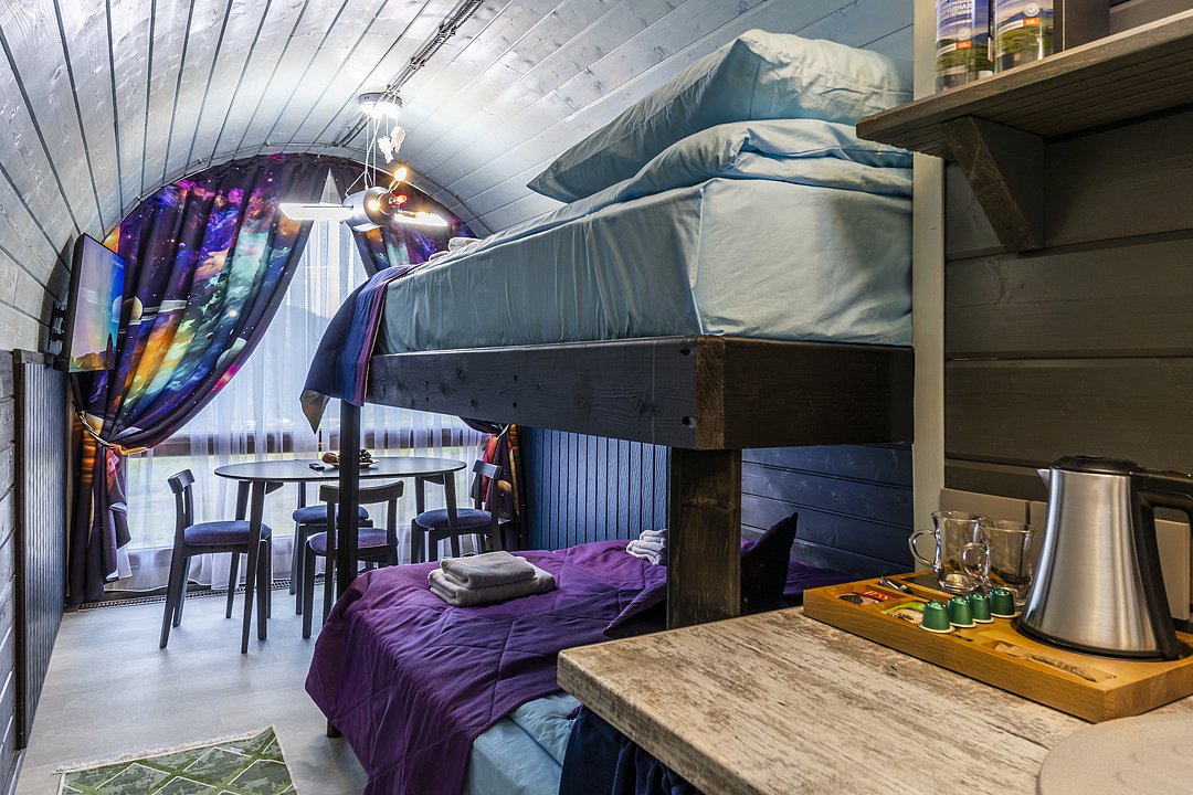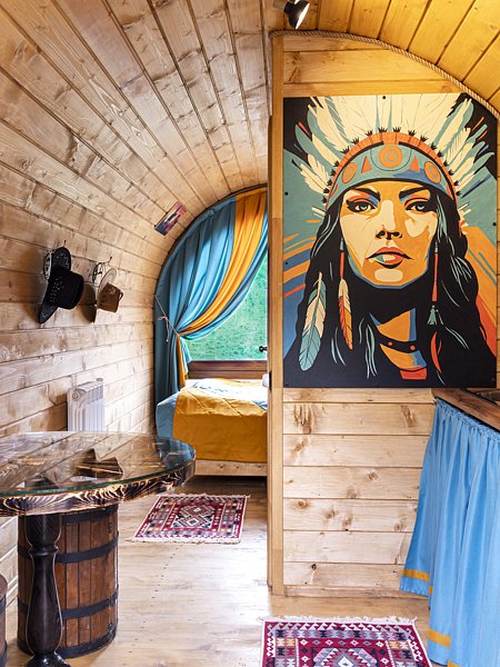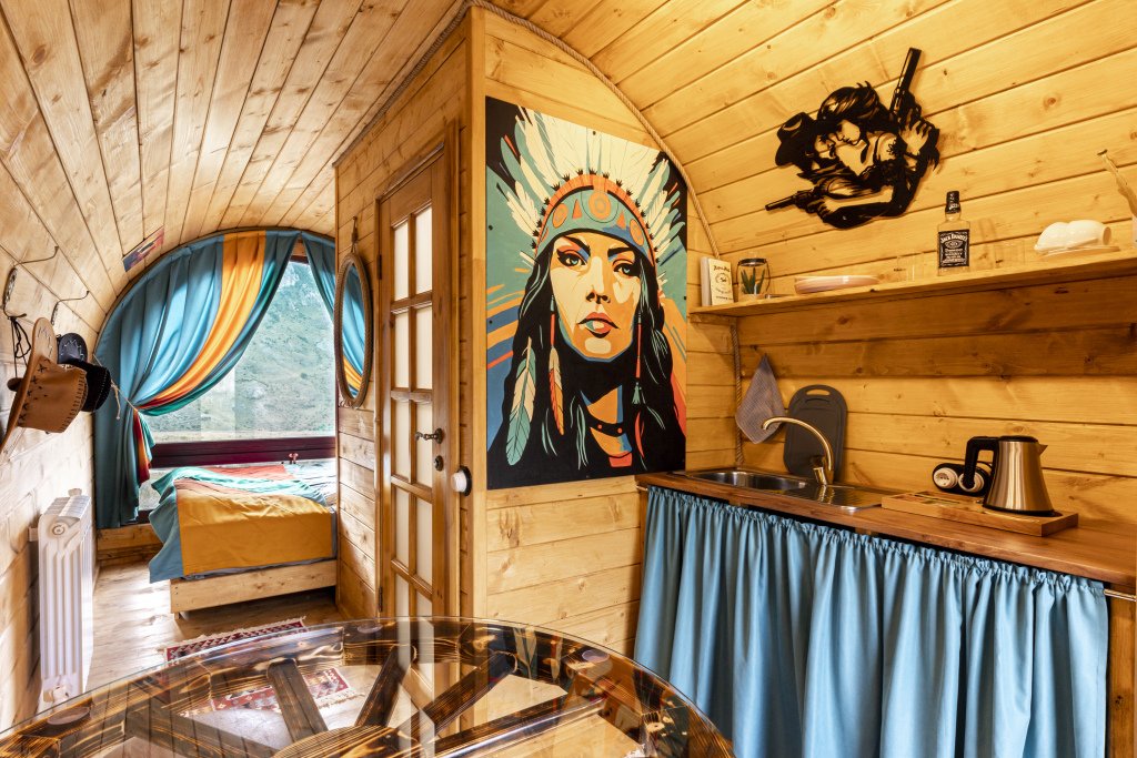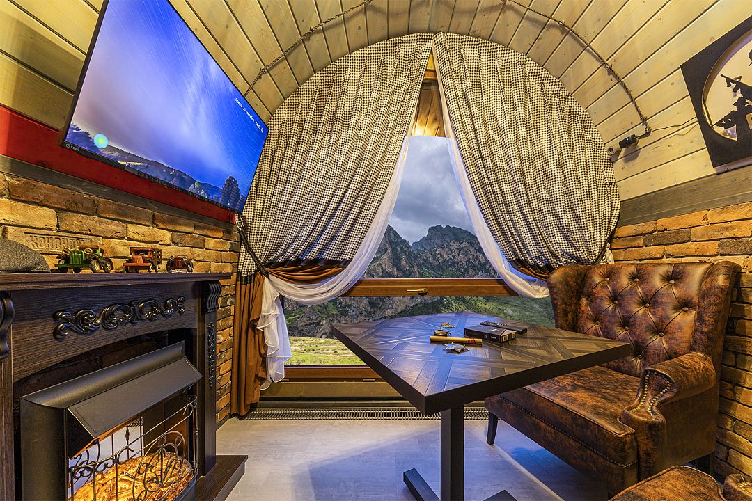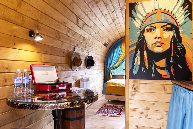 Двухместный жилой модуль номер создан, чтобы погрузить вас в атмосферу романтики времен ковбоев и индейцев. Панорамное окно открывает вид на гору Ржавая.