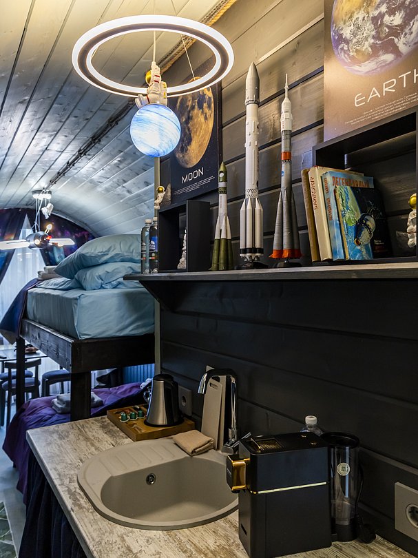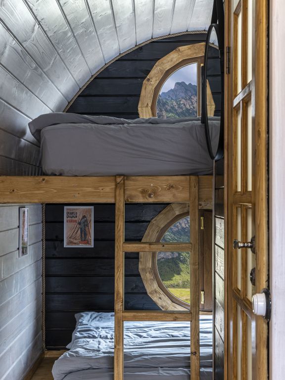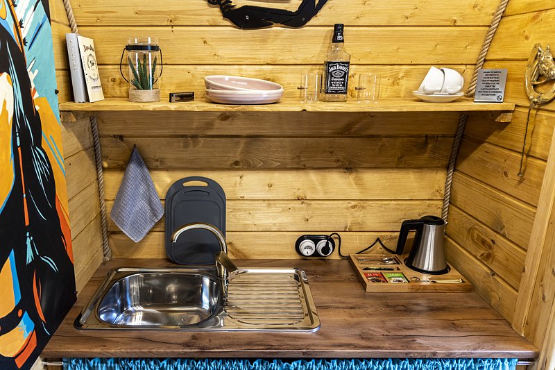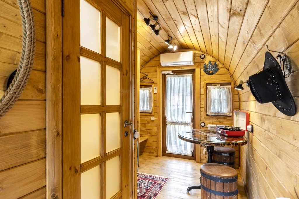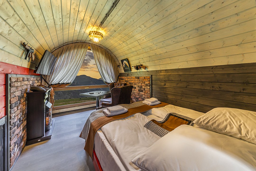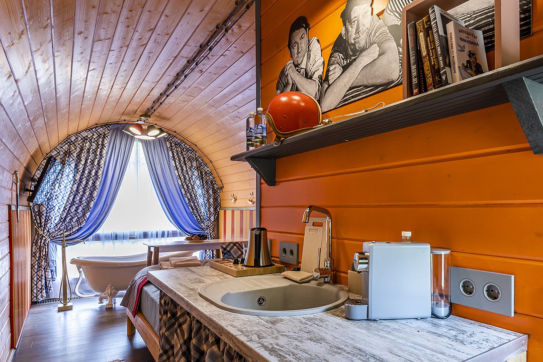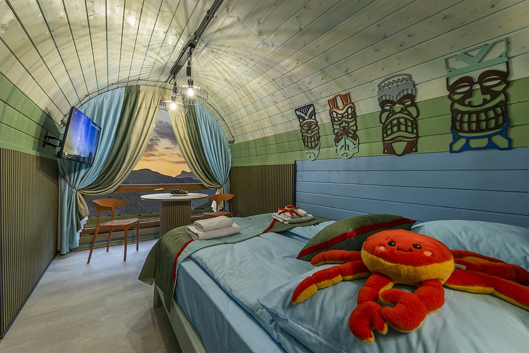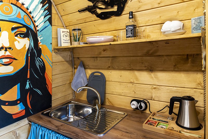 Двухместный жилой модуль номер создан, чтобы погрузить вас в атмосферу романтики времен ковбоев и индейцев. Панорамное окно открывает вид на гору Ржавая.