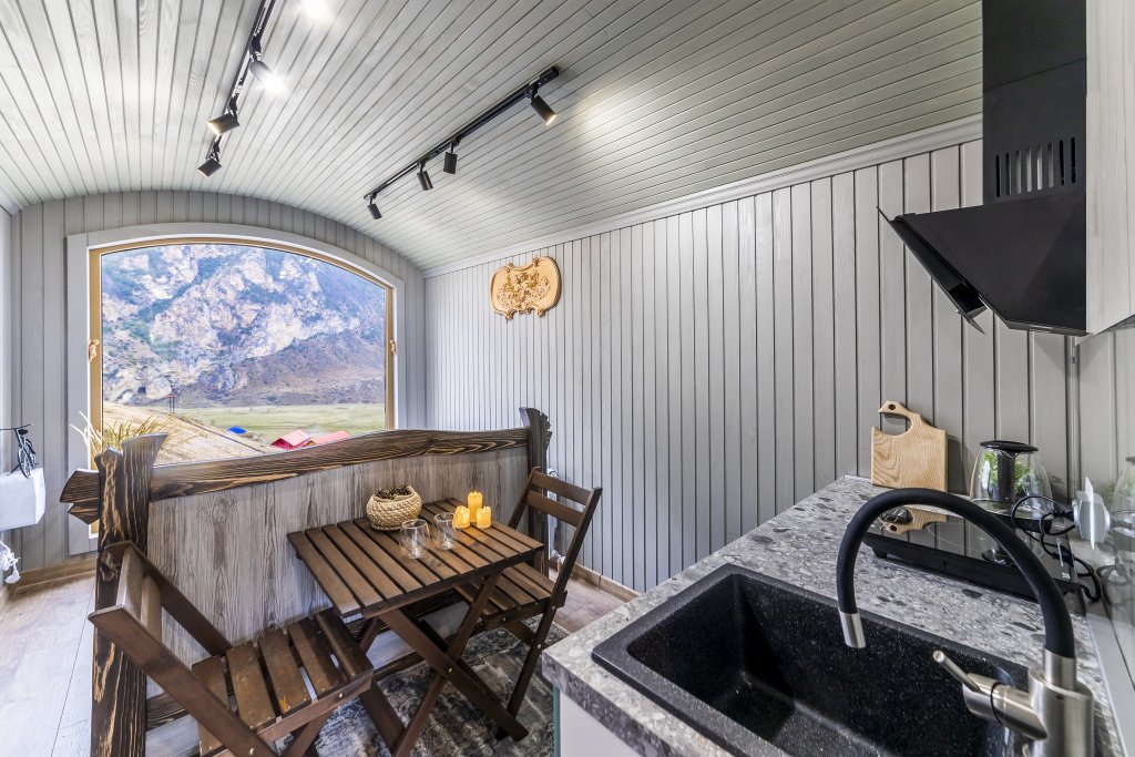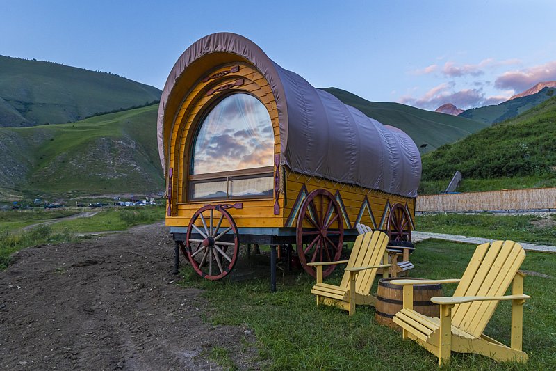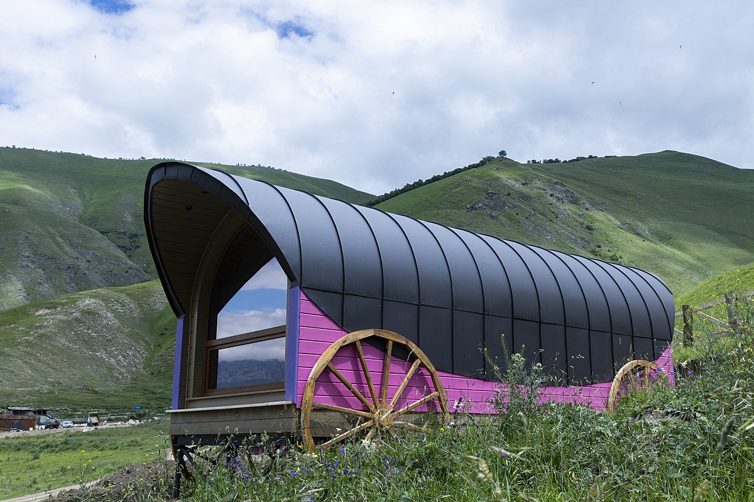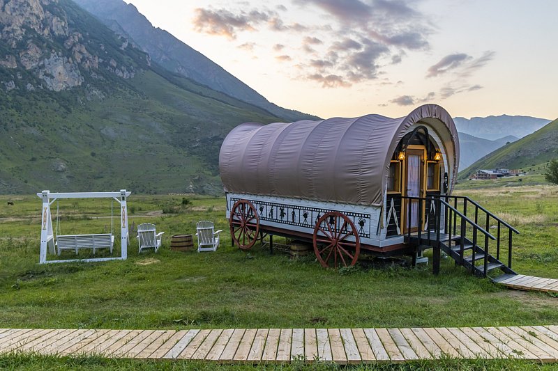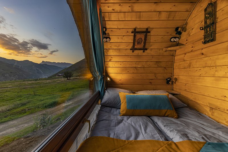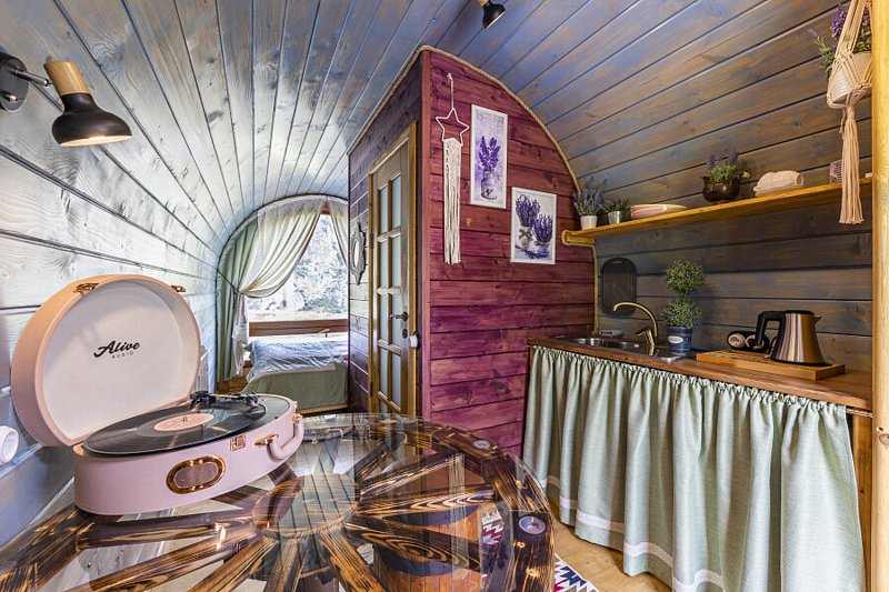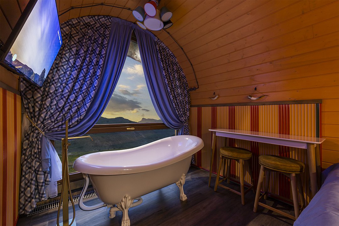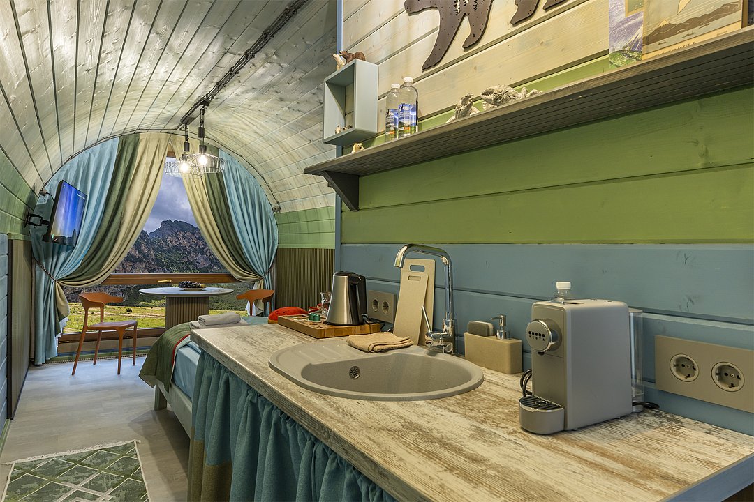 Двухместный дилижанс «Лавандовое Настроение» — это уютное пространство, окутанное нежным ароматом лаванды и обладающее особой атмосферой спокойствия и умиротворения. Панорамное окно открывает взору красоту окружающих гор.