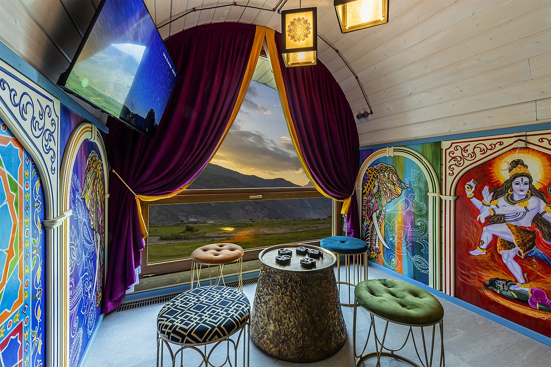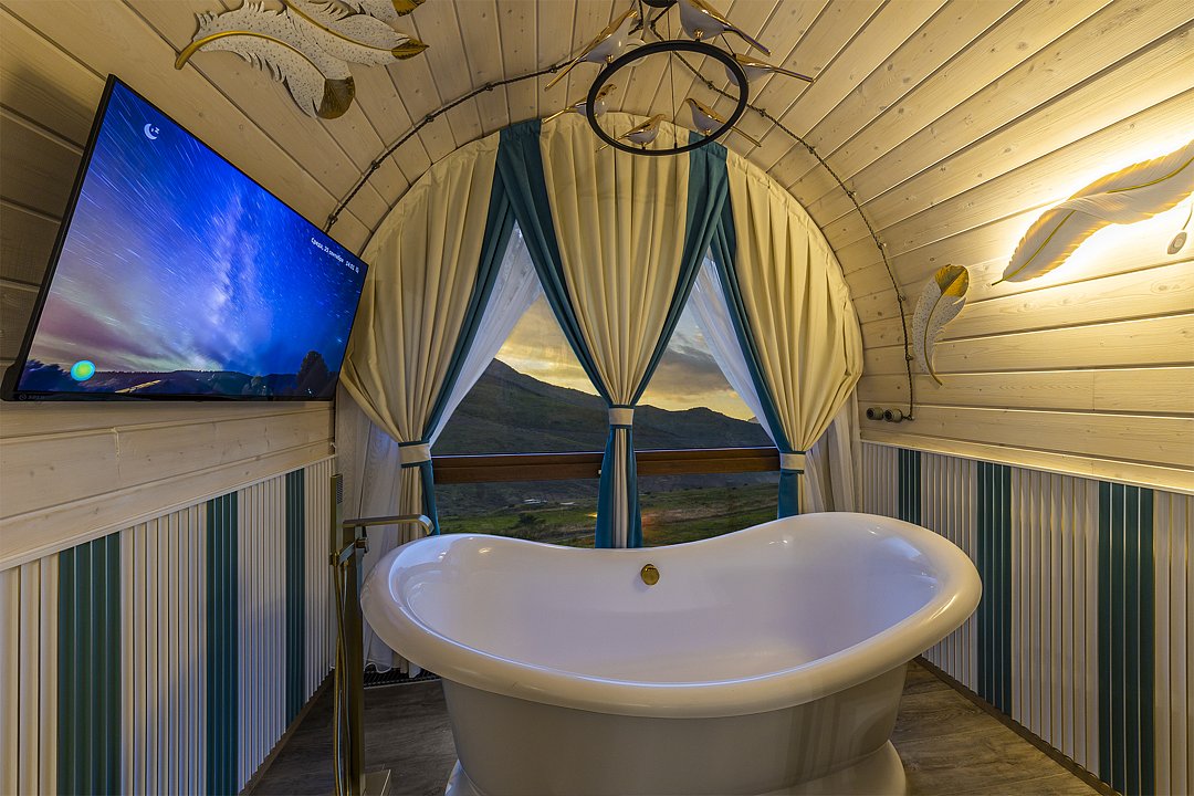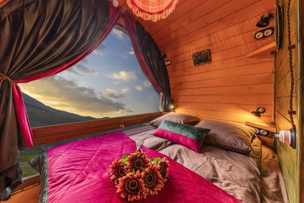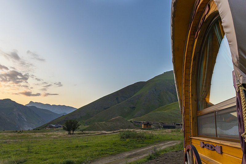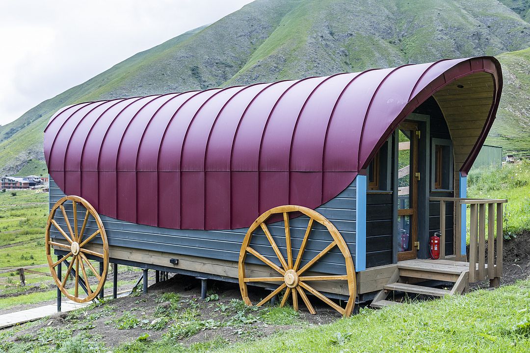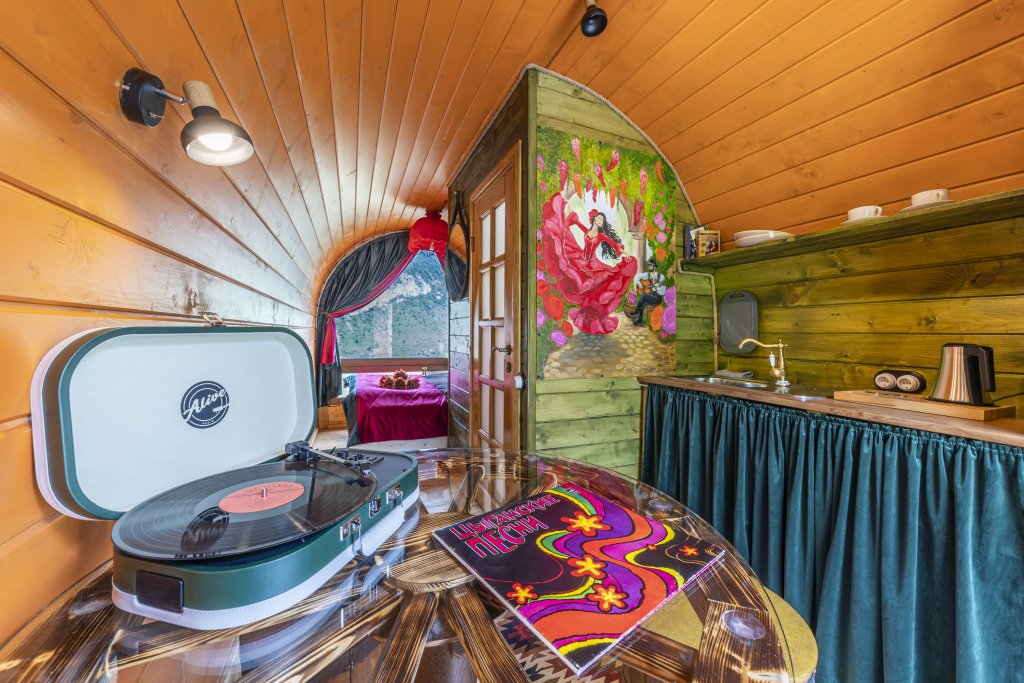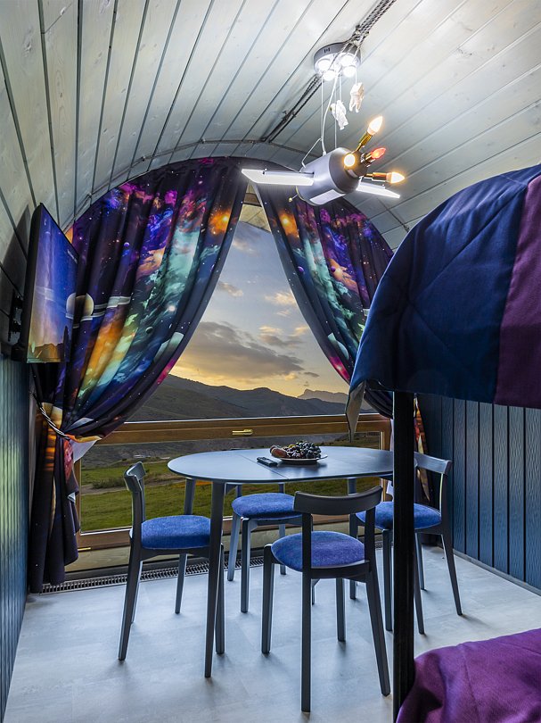 Двухместный дилижанс «Лавандовое Настроение» — это уютное пространство, окутанное нежным ароматом лаванды и обладающее особой атмосферой спокойствия и умиротворения. Панорамное окно открывает взору красоту окружающих гор.