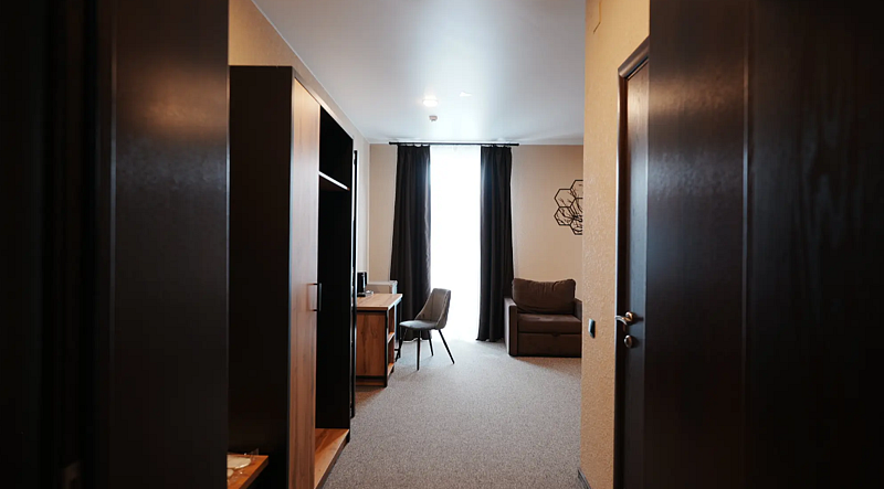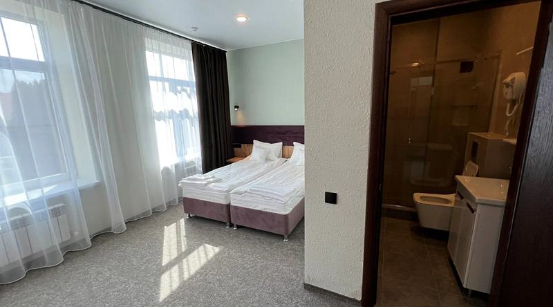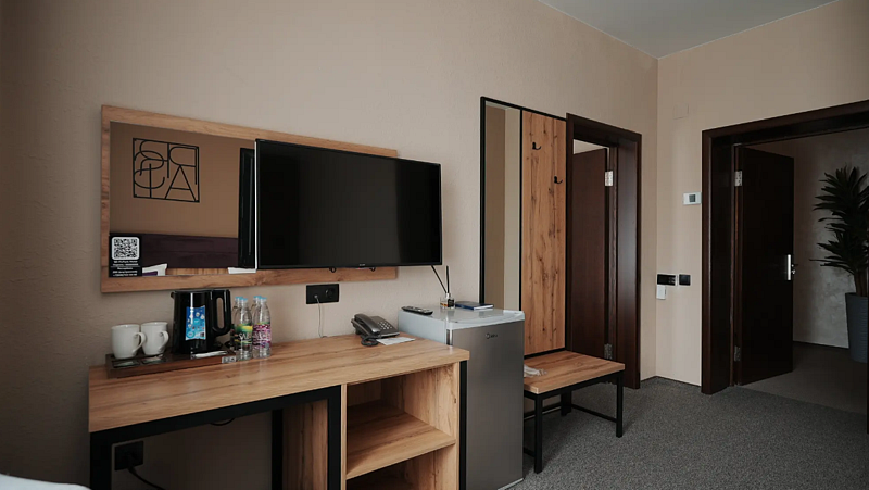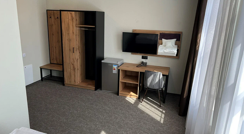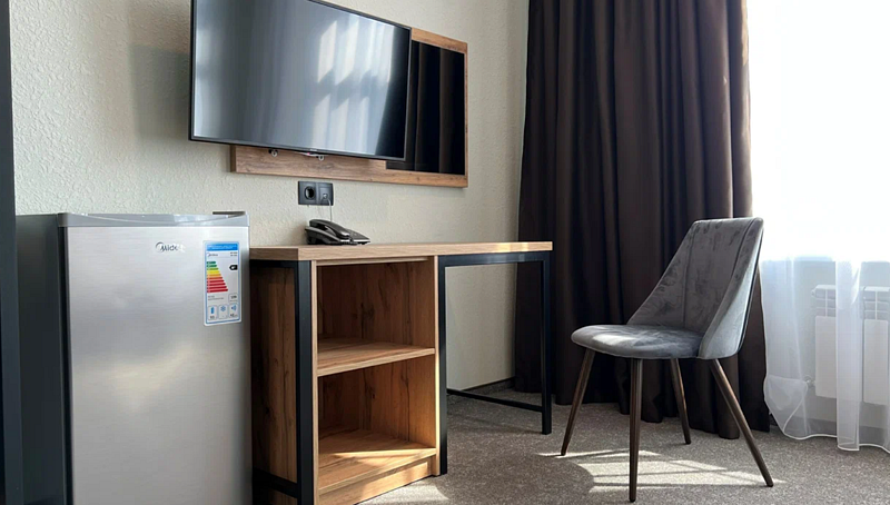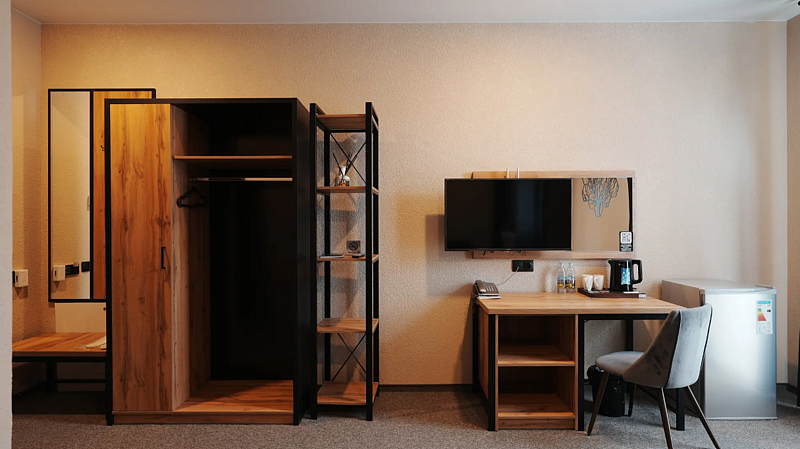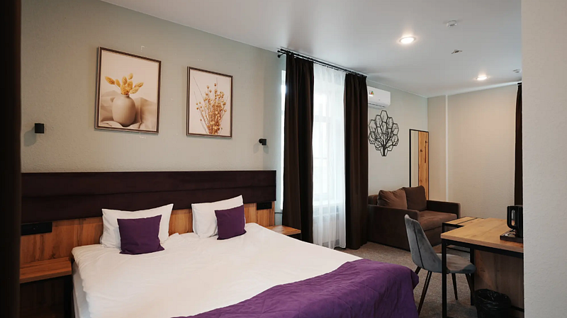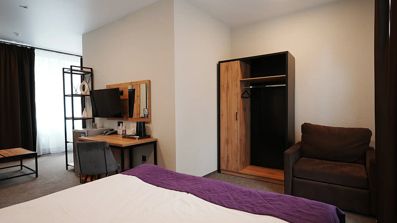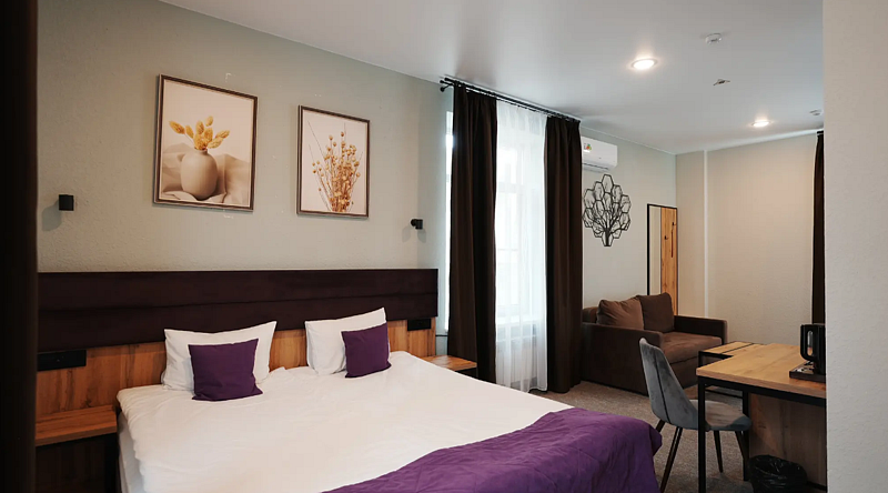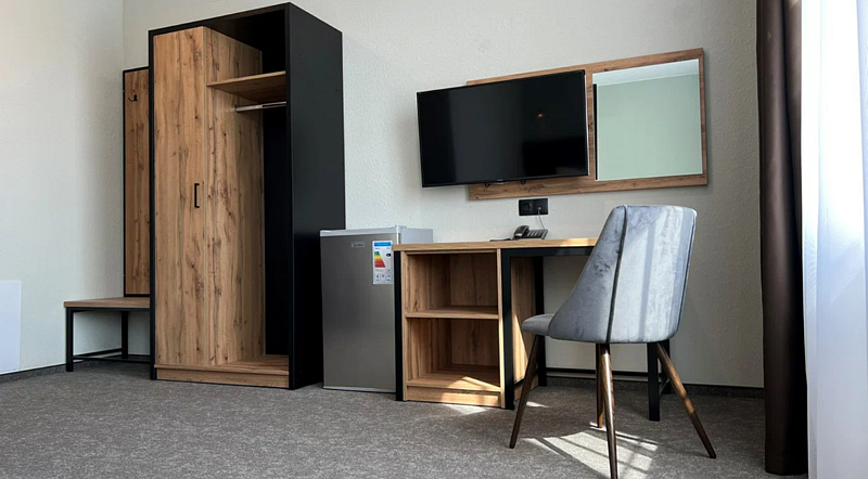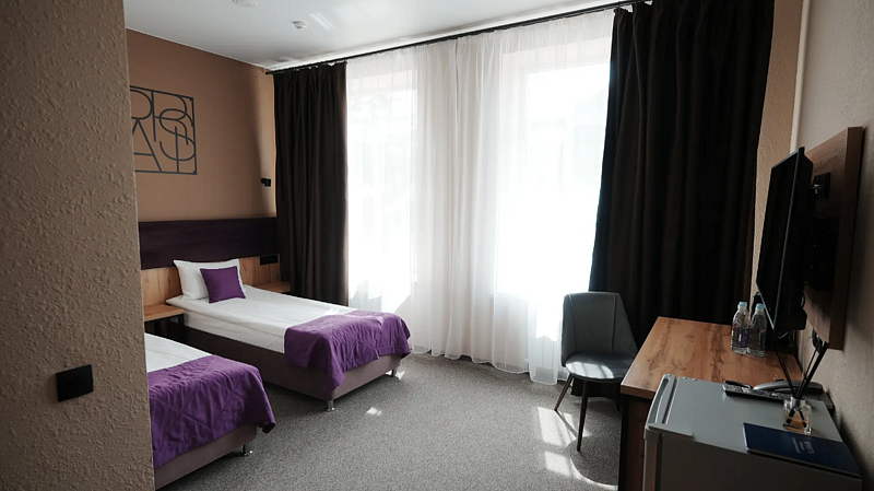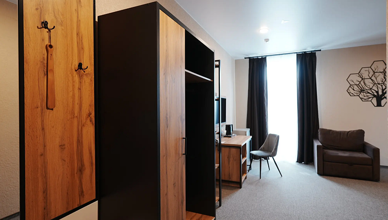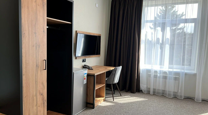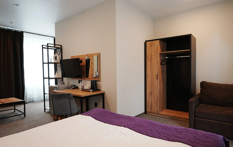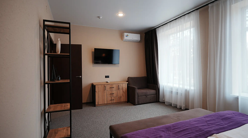 «Стандарт» площадью 20 м² – стильный уютный номер для двоих человек. Здесь двуспальная кровать бокс-спринг (можно раздвинуть) с удобными матрасами, холодильник, чайный набор, электрический чайник, TV с плоским экраном, ковровое покрытие, шторы блэкаут. В ванной комнате: душевая кабина, тропический душ, фен, банные принадлежности (шампунь, гель для душа, жидкое мыло), полотенцесушитель, зеркало с подсветкой, тапочки, полотенца. Халаты предоставляются по запросу.Полулюкс