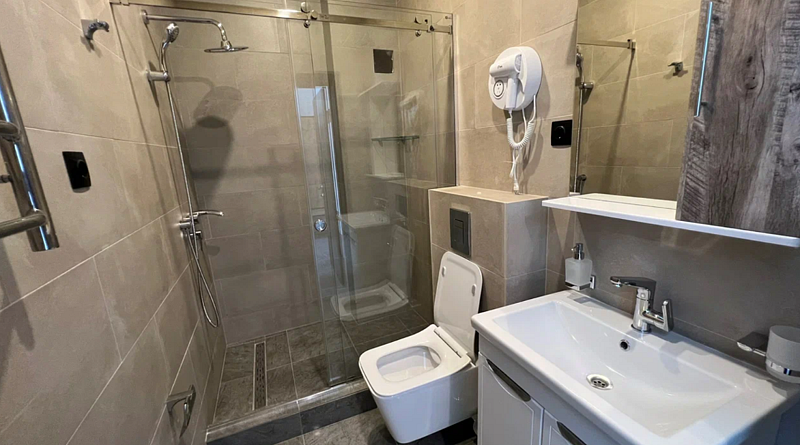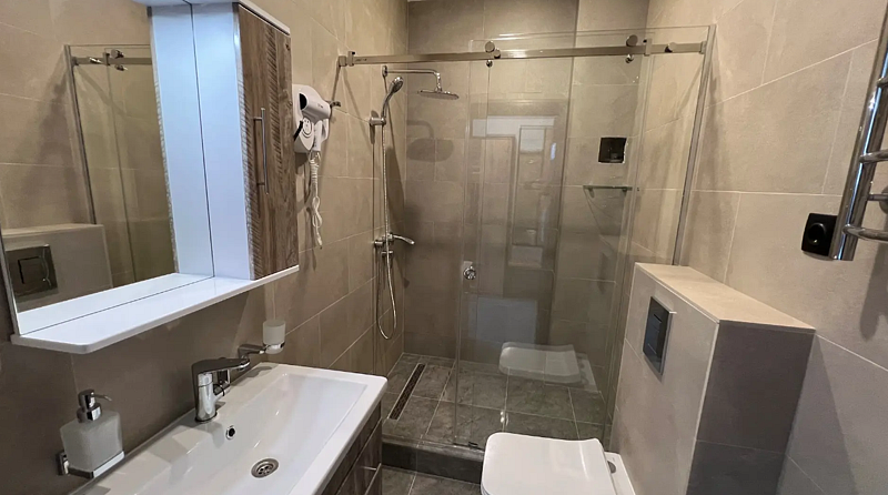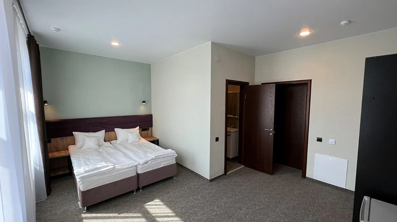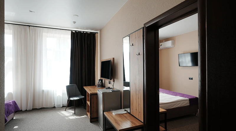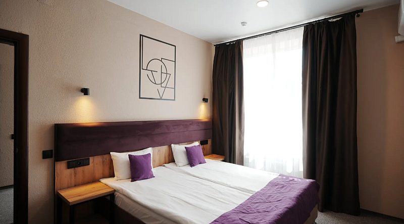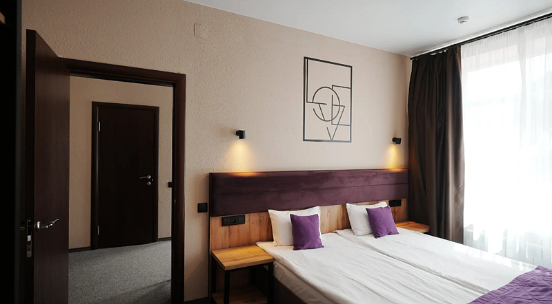 Двухкомнатный «Комфорт» площадью 32 м² вмещает до 4 человек. В каждой комнате – двуспальная кровать бокс-спринг (можно раздвинуть) с удобными матрасами и TV с плоским экраном. Также в номере: холодильник, чайный набор, электрический чайник, ковровое покрытие, шторы блэкаут. В ванной комнате: душевая кабина, тропический душ, фен, банные принадлежности (шампунь, гель для душа, жидкое мыло), полотенцесушитель, зеркало с подсветкой, тапочки, полотенца. Халаты предоставляются по запросу.Люкс двухкомнатный