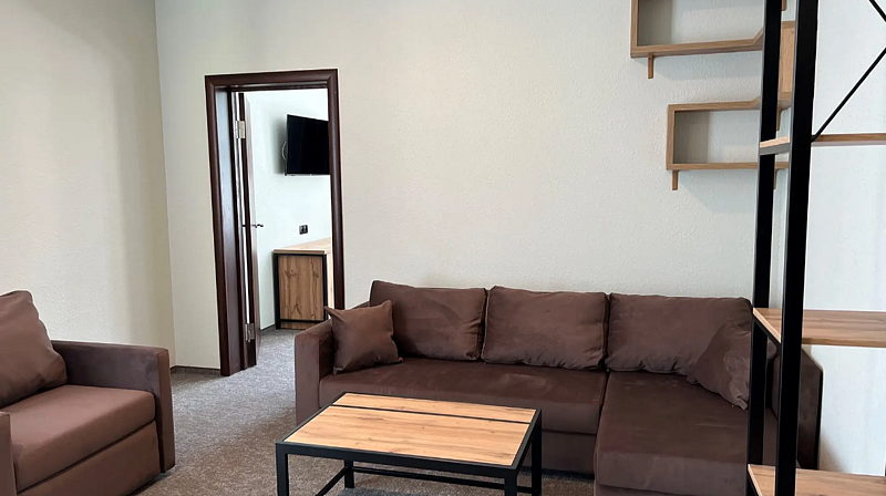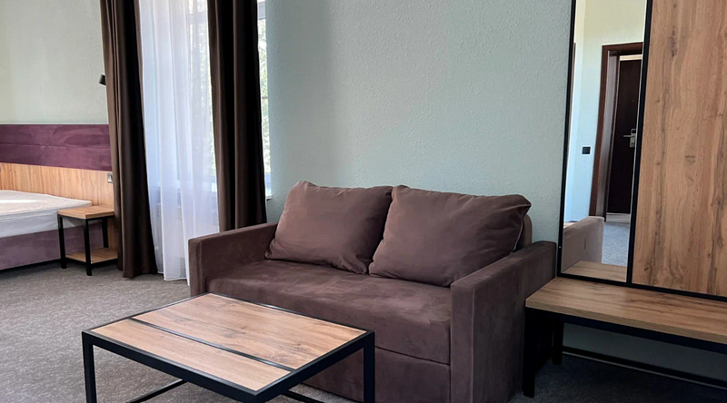 Двухкомнатный «Люкс» площадью 48 м² вмещает до 5 человек. Это отличный выбор для семьи с детьми или большой компании. В номере: двуспальная кровать удобным матрасом, кресло-кровать, большой раскладной диван. TV с плоским экраном в каждой комнате, холодильник, чайный набор, электрический чайник, ковровое покрытие, шторы блэкаут. В ванной комнате: душевая кабина, тропический душ, фен, банные принадлежности (шампунь, гель для душа, жидкое мыло), полотенцесушитель, зеркало с подсветкой, тапочки, полотенца. Халаты предоставляются по запросуПолулюкс