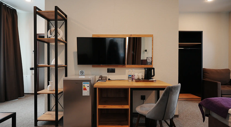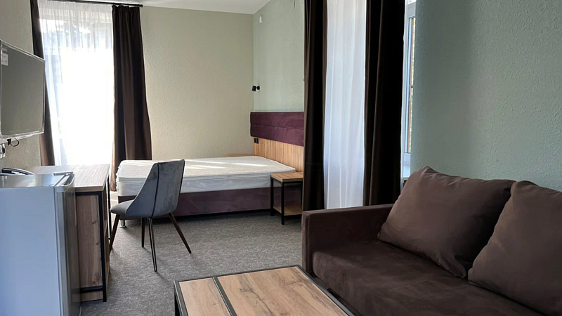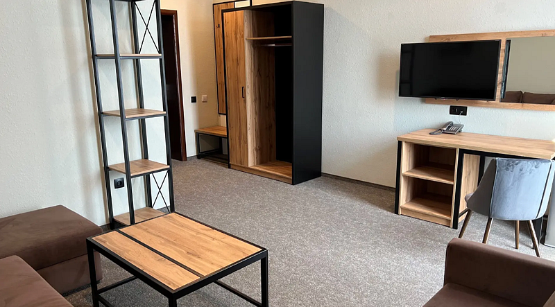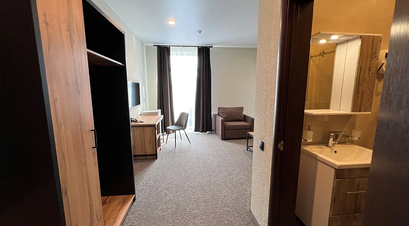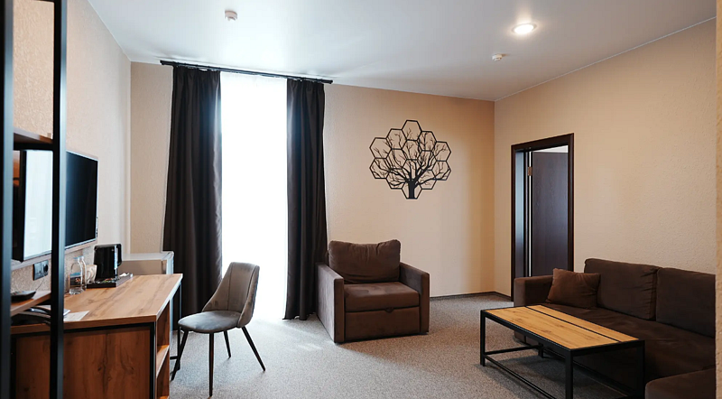 «Полулюкс» площадью 31 м² вмещает до 4 человек. В номере: двуспальная кровать с удобным матрасом, раскладной диван, кресло, TV с плоским экраном, холодильник, чайный набор, электрический чайник, ковровое покрытие, шторы блэкаут. В ванной комнате: душевая кабина, тропический душ, фен, банные принадлежности (шампунь, гель для душа, жидкое мыло), полотенцесушитель, зеркало с подсветкой, тапочки, полотенца. Халаты предоставляются по запросу.Комфорт двухкомнатный с 2 спальнями