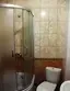 В ванной комнате: душевая кабина, раковина, санузел, полотенца и косметический набор.