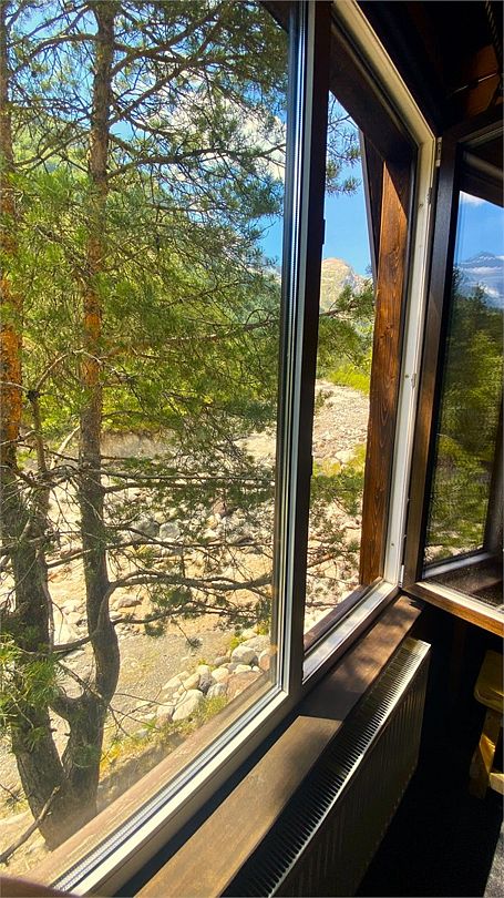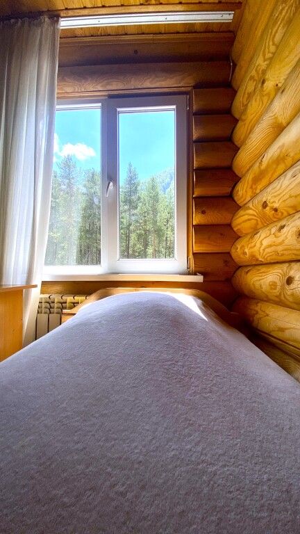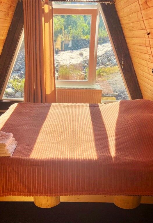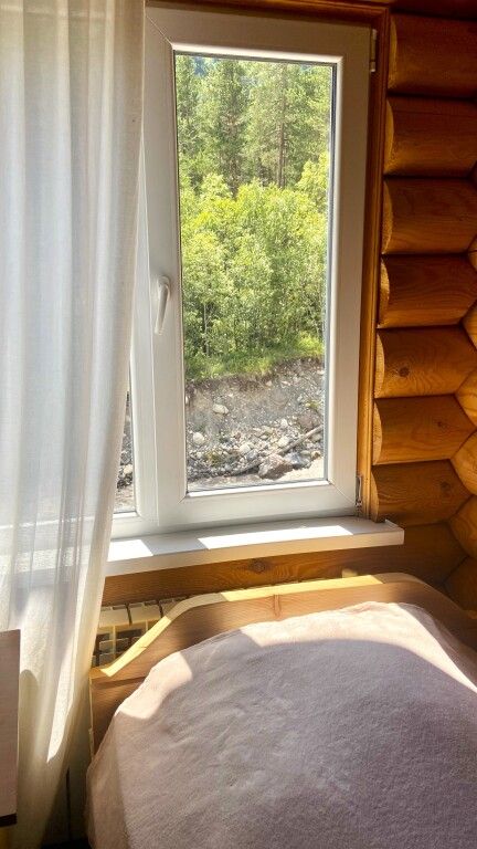 Уютный, светлый двухместный номер с раздельными кроватями с видом на реку и горы.