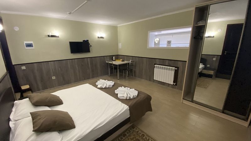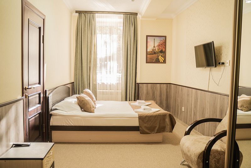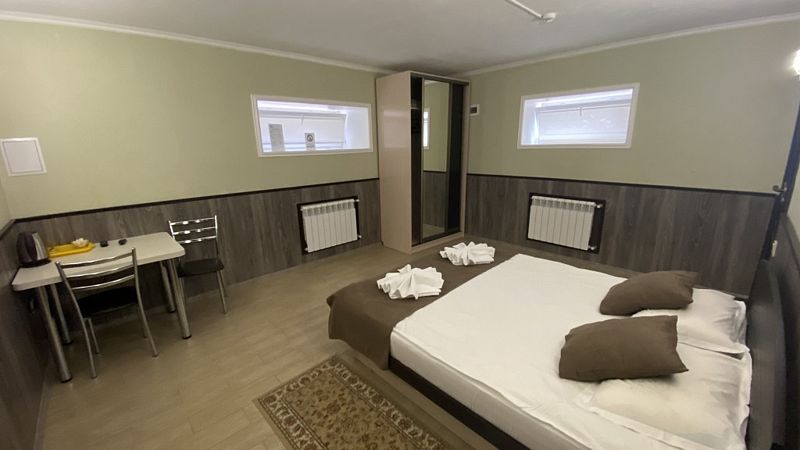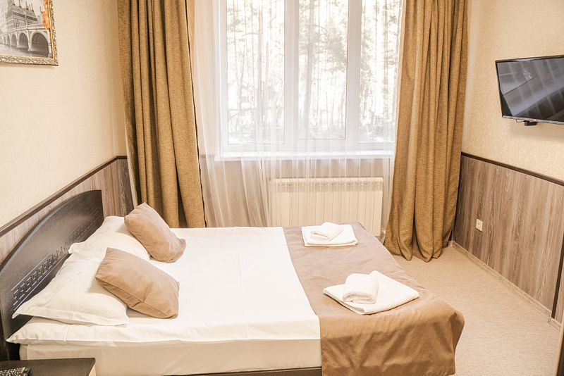 В номере есть все необходимое для Вашего комфортного проживания: удобная двуспальная кровать с чистым и свежим постельным бельем, душевая с гигиеническими средствами (одноразовые шампунь и гель для душа, а также жидкое мыло в дозаторе).