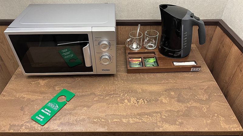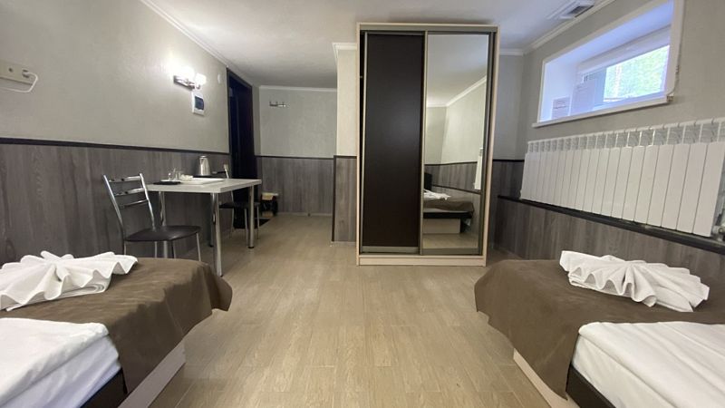 Стандарт улучшенный с двумя раздельными кроватями. Окна номера выходят на горы. Также одним из существенных плюсов является наличие полноценной кухни со всей необходимой посудой.