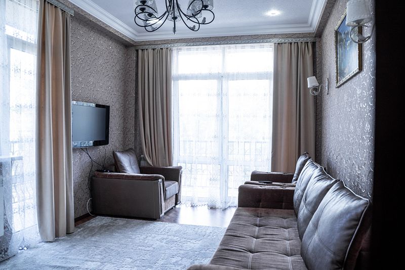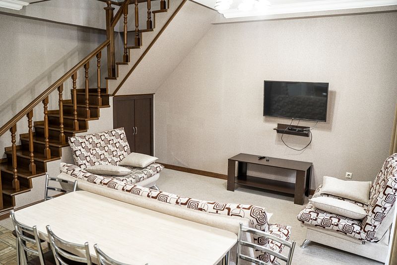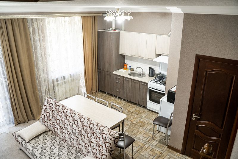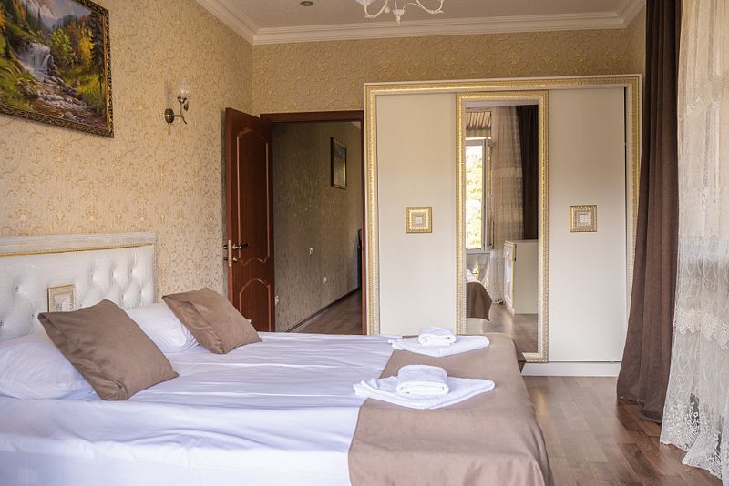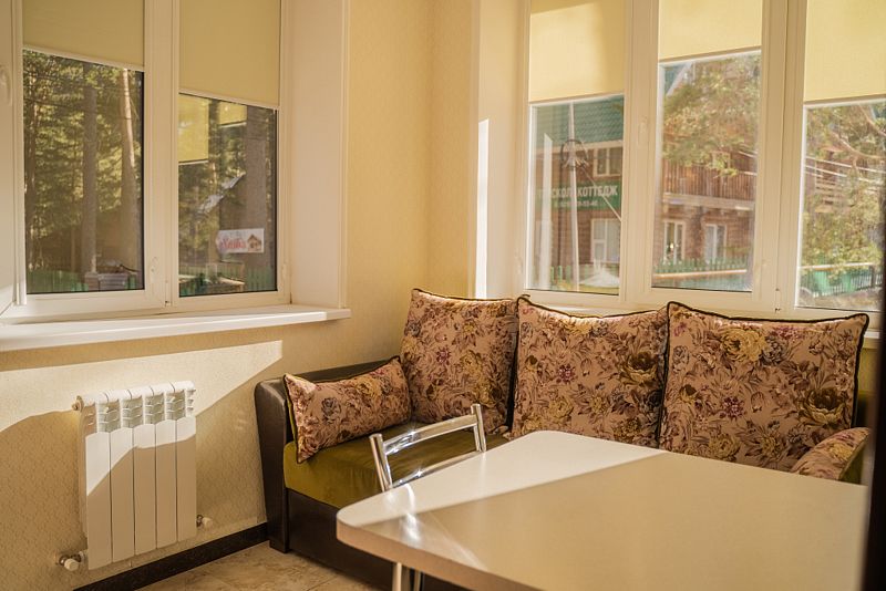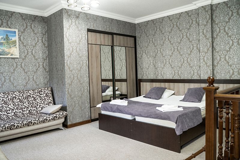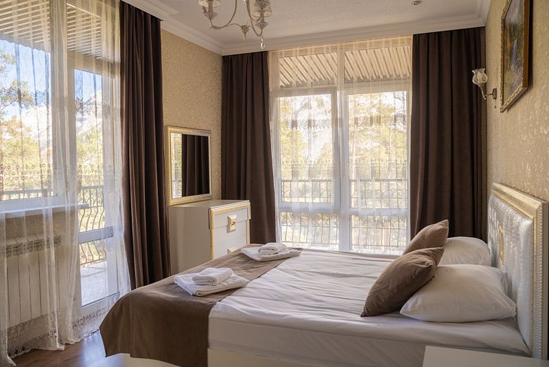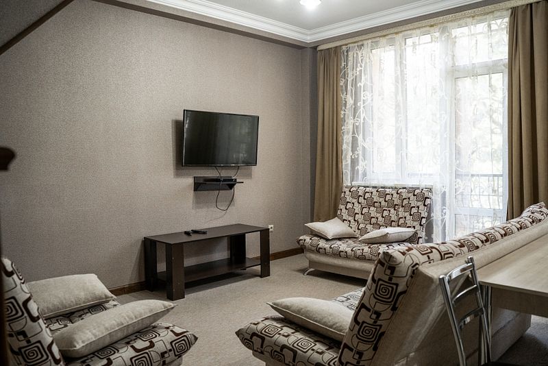 Комфорт с двуспальной кроватью и диваном-кроватью позволяет с удобством разместить троих взрослых или семью с двумя детьми. Окна номеров выходят на горы. Также одним из существенных плюсов является наличие полноценной кухни со всей необходимой посудой.