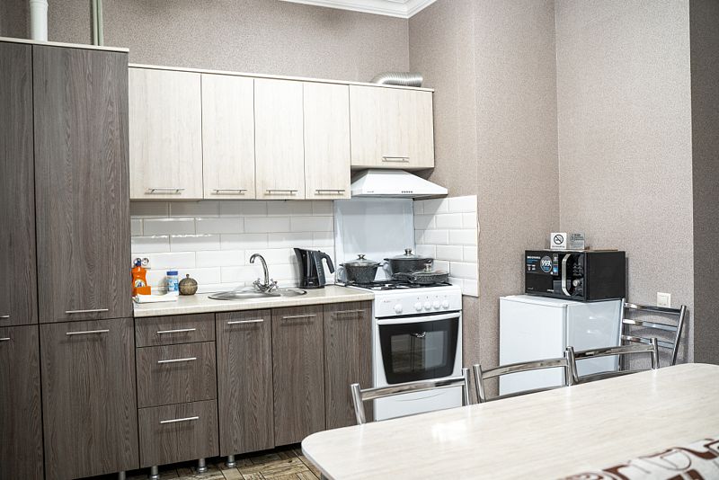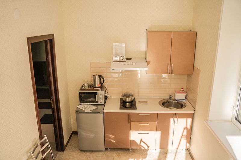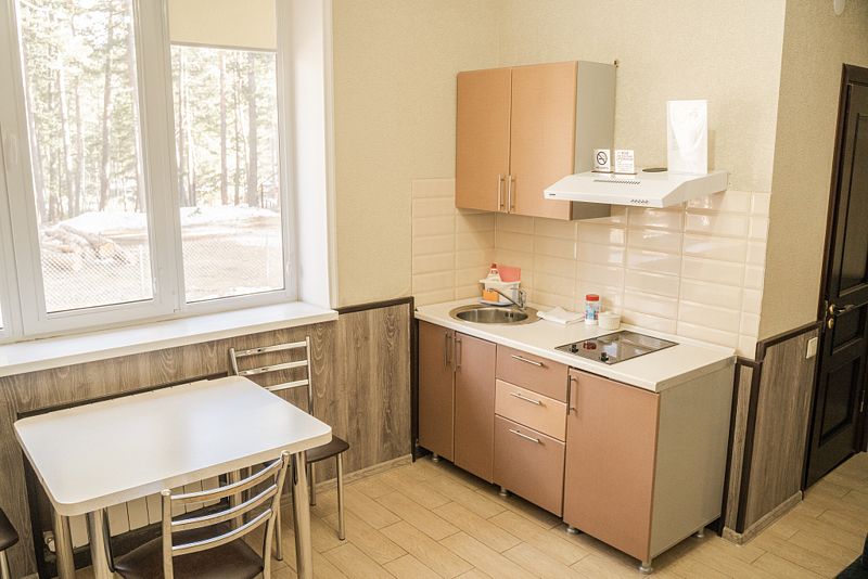 Трехместная студия хорошо подходит для проживания компании друзей из четырех–пяти человек. Одним из основных преимуществ большинства наших номеров является наличие полноценной кухни со всей необходимой посудой, и трехместная Студия относится к таким номерам.