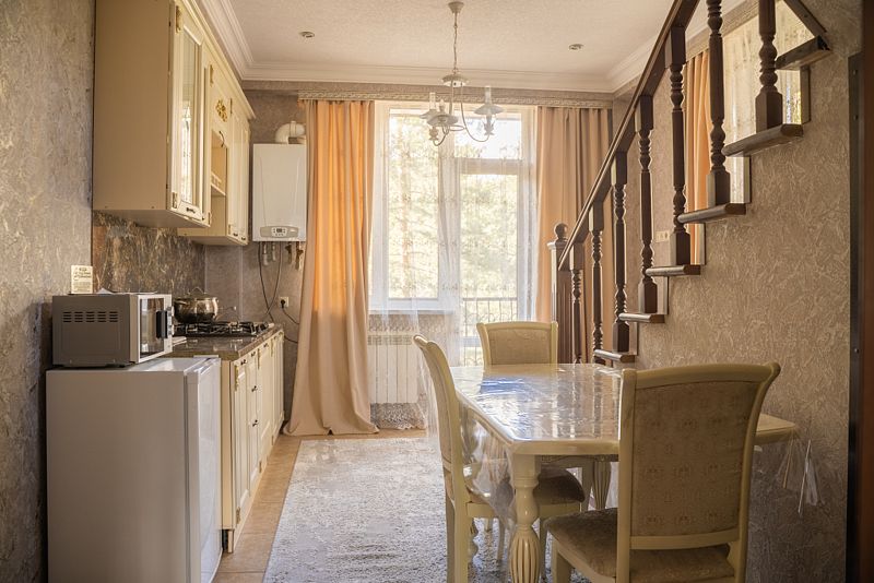 Окна номера выходят во двор, откуда видны горы. Также одним из существенных плюсов является наличие полноценной кухни со всей необходимой посудой.