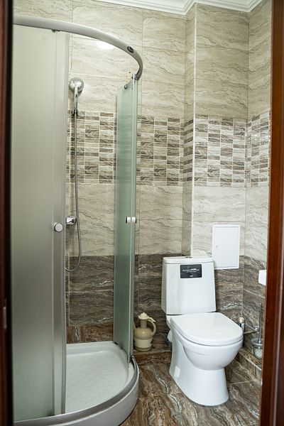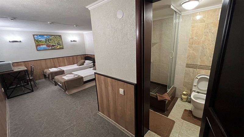 В номере есть все необходимое для Вашего комфортного проживания: две удобные односпальные кровати с чистым и свежим постельным бельем, диван-кровать, душевая с гигиеническими средствами (одноразовые шампунь и гель для душа, а также жидкое мыло в дозаторе).
