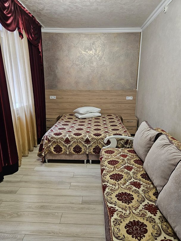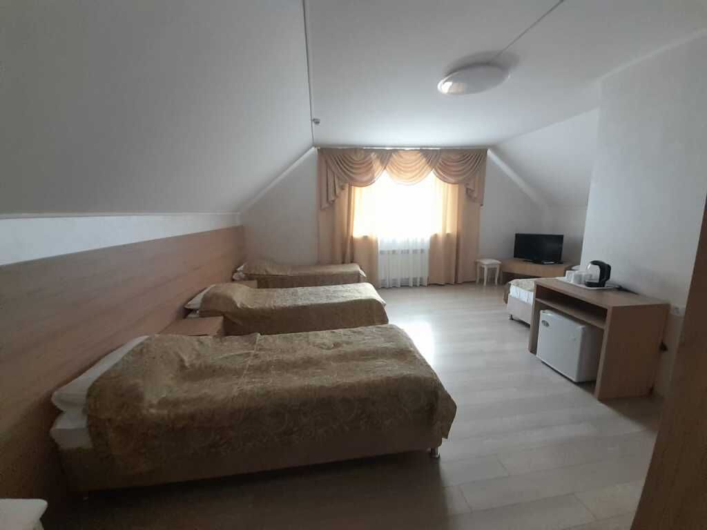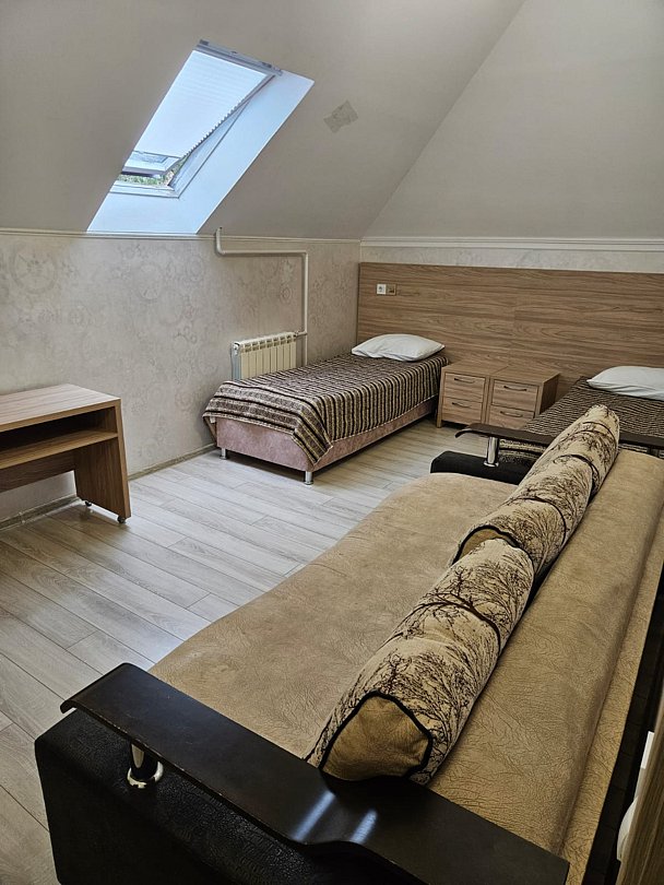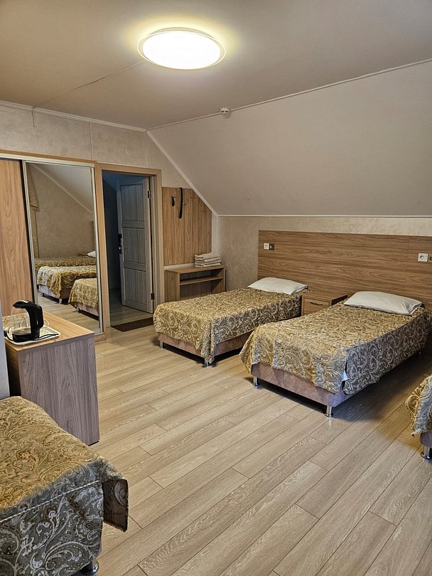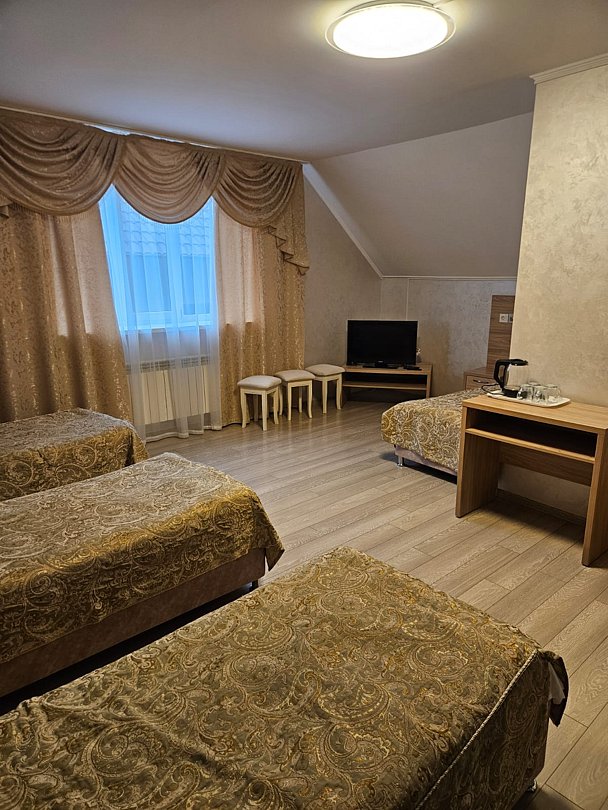 Вместительный номер со всеми удобствами: Wi-Fi, телевизор, четыре односпальные кровати, диван. Шикарный интерьер с декоративными элементами, современной мебелью. Рядом с отелем есть удобная парковка. Из окна открывается прекрасный вид на горы, местные достопримечательности. В номере созданы все условия для комфортного проживания, регулярно проводится уборка. В ванной находятся полотенца и гигиенические принадлежности. В номере есть тумбочки для хранения вещей, шкаф для одежды, компактный столик.