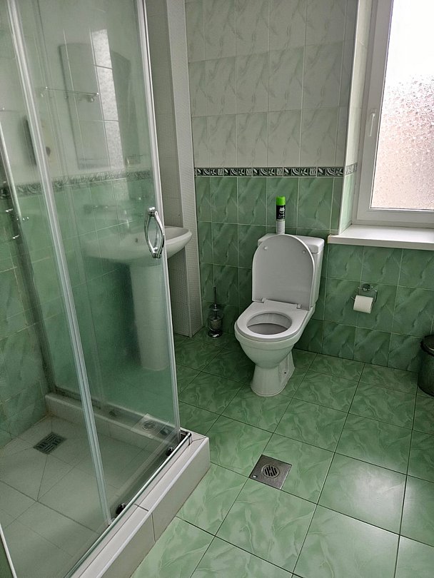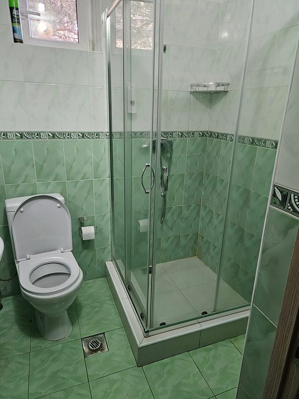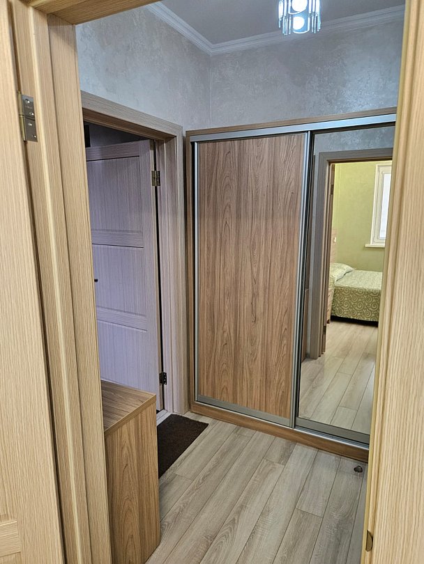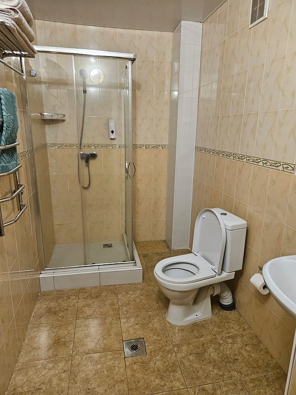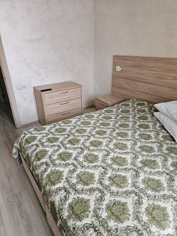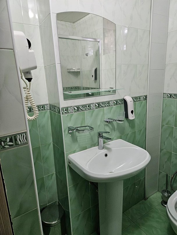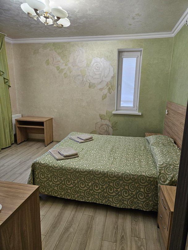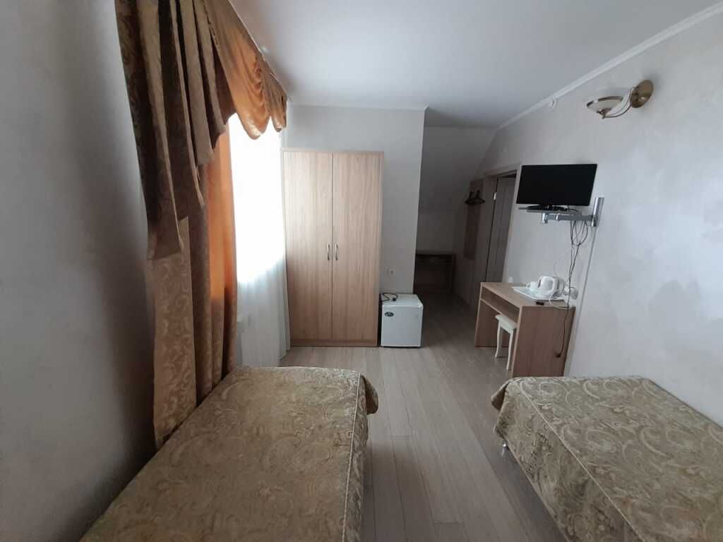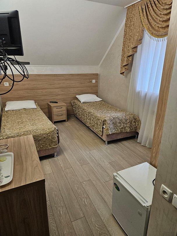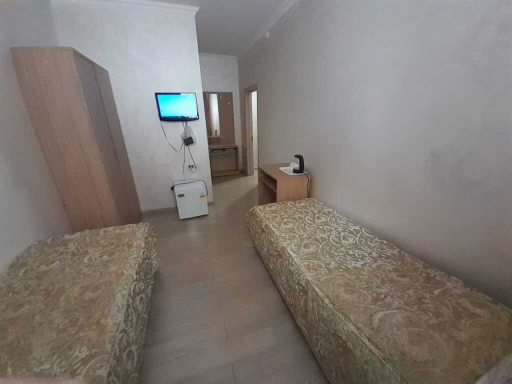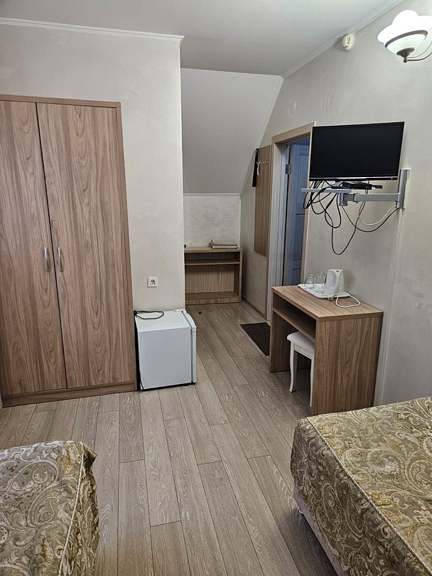 Однокомнатный номер: 2 кровати, шкаф для вещей, 2 тумбочки, зеркало, журнальный стол, ТВ, диван-кровать на двоих, комод с зеркалом, санузел (душевая кабина), холодильник. Есть номера с балконом.