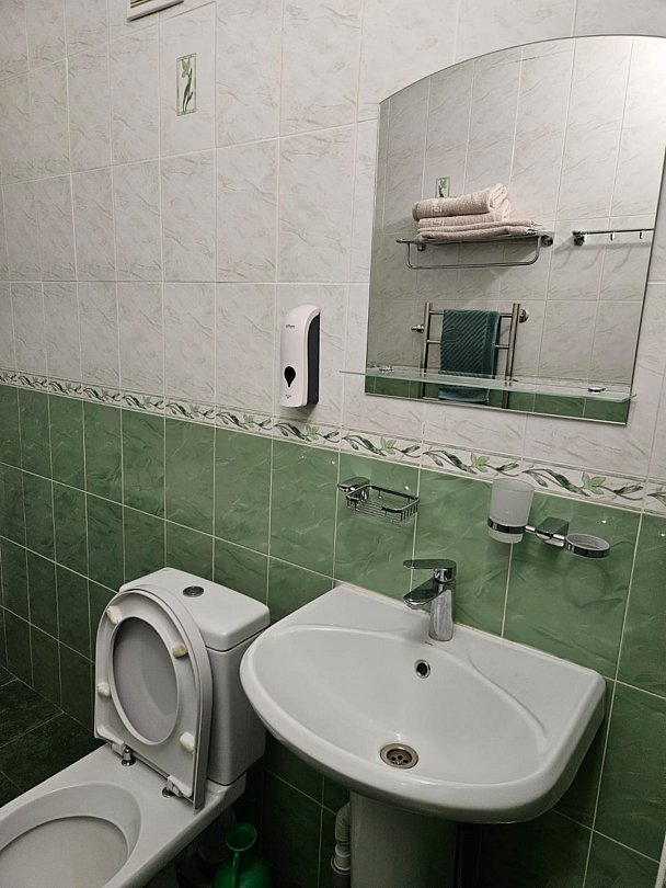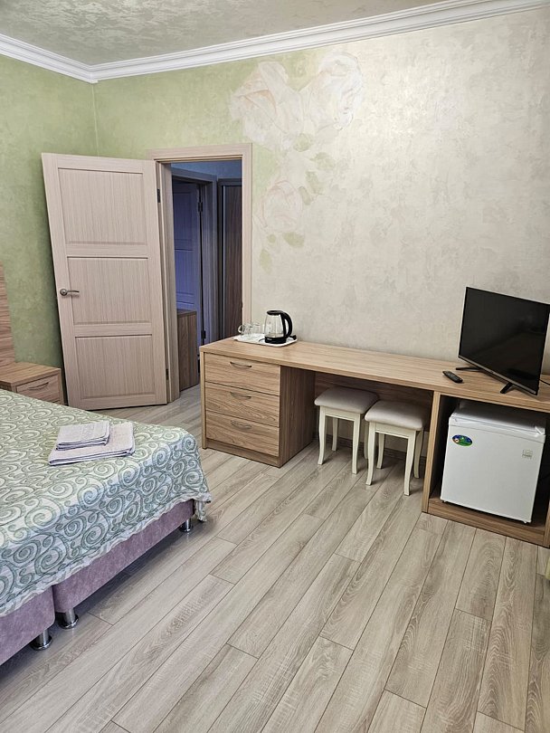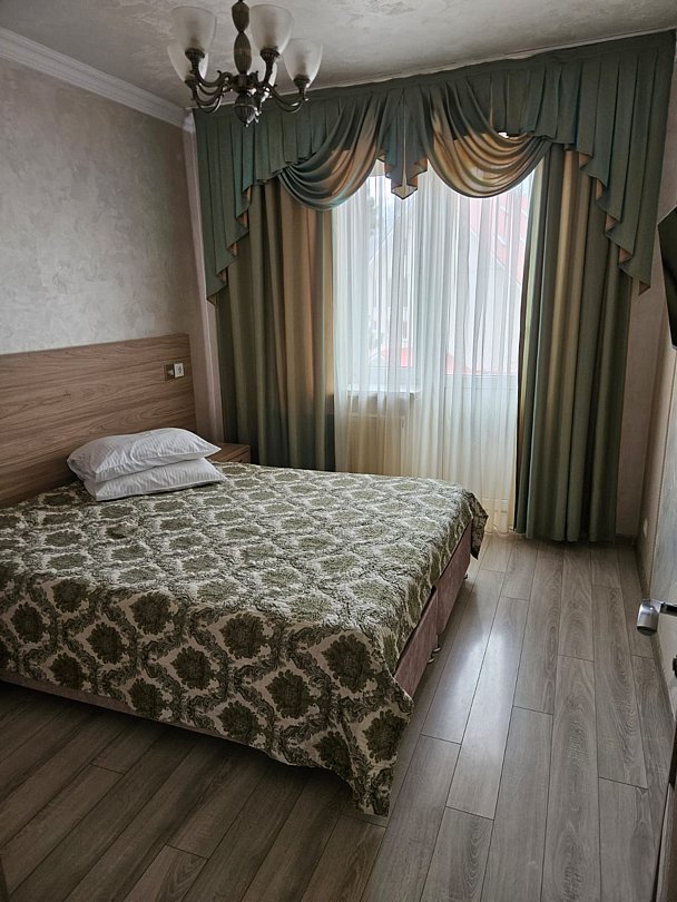 Вместительный двухкомнатный номер со всеми удобствами: Wi-Fi, телевизор, двуспальная кровать, диван. Шикарный интерьер с декоративными элементами, современной мебелью. Рядом с отелем есть удобная парковка. Из окна открывается прекрасный вид , местные достопримечательности. В номере созданы все условия для комфортного проживания, регулярно проводится уборка. В ванной находятся полотенца и гигиенические принадлежности. В номере есть тумбочки для хранения вещей, шкаф для одежды, компактный столик.