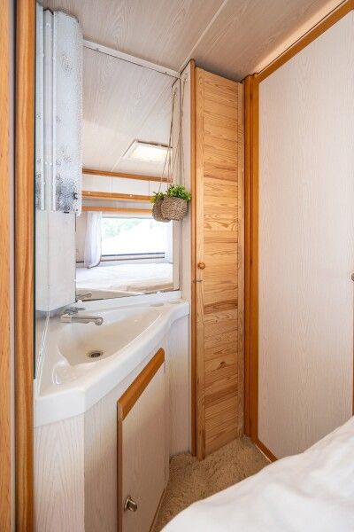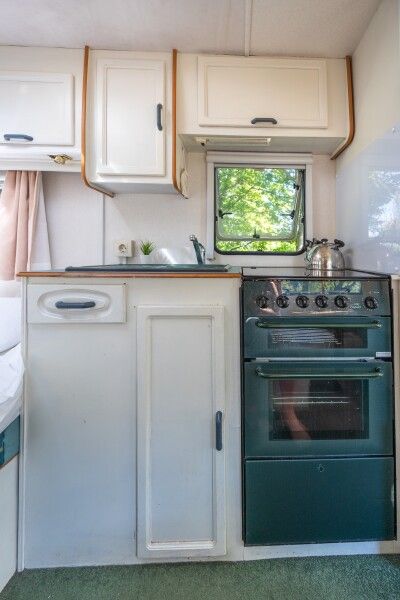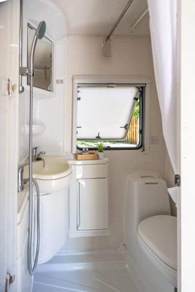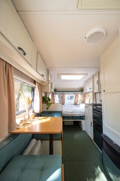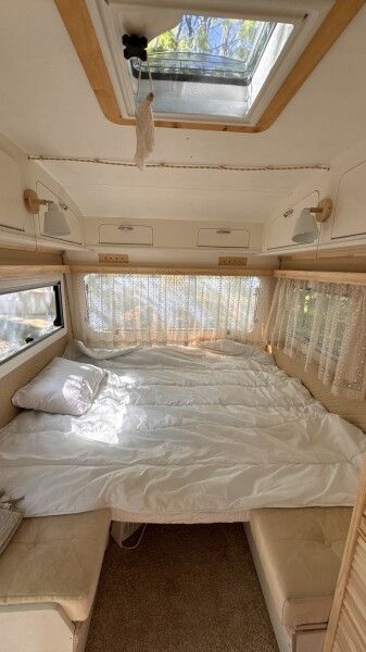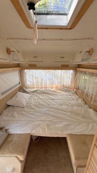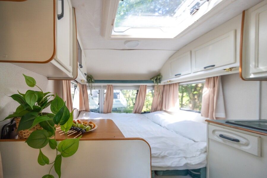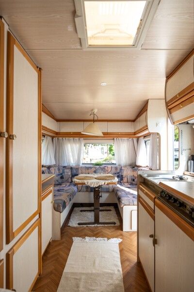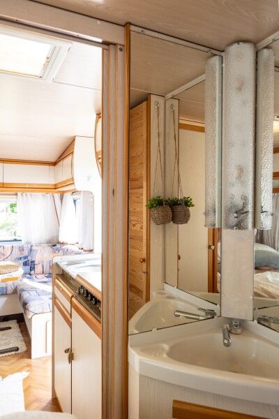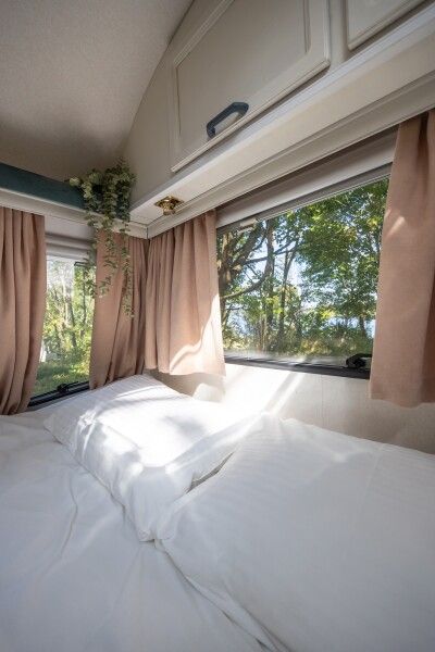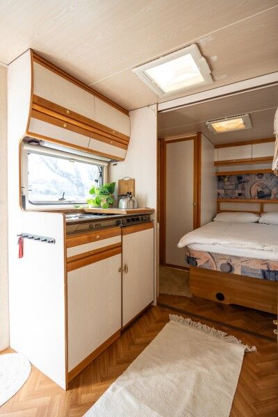 Автодомик имеет две зоны: спальня (кровать 150*200) и кухня, которые разделяются сдвижной перегородкой. Кухонная зона преобразовывается в диван — спальное место. На этом спальном месте может расположиться взрослый и ребенок. Душ и биотуалет внутри домика совмещены, небольшого размера. Есть горячая вода и отопление. В кухонной зоне есть плита, холодильник, вся необходимая посуда, чай, кофе, сахар, соль.