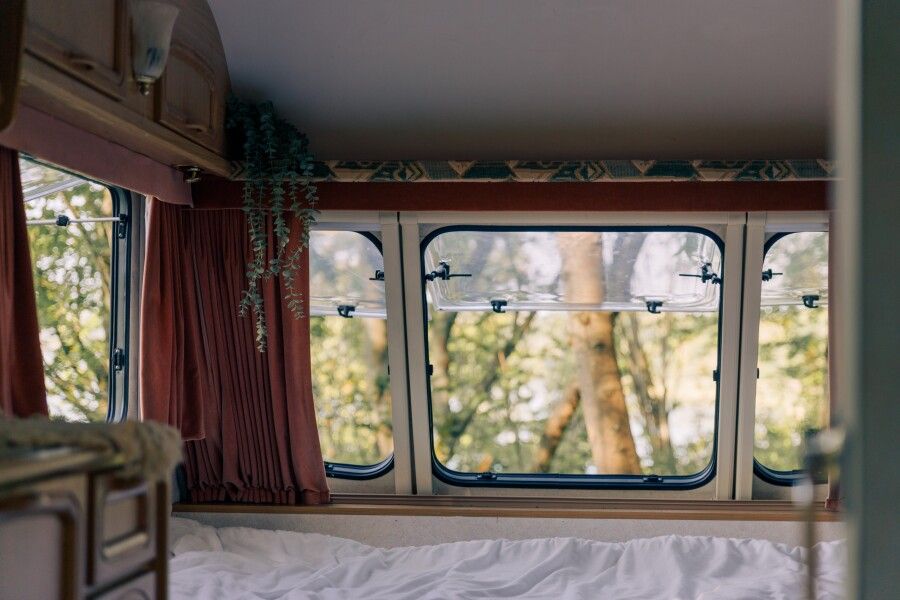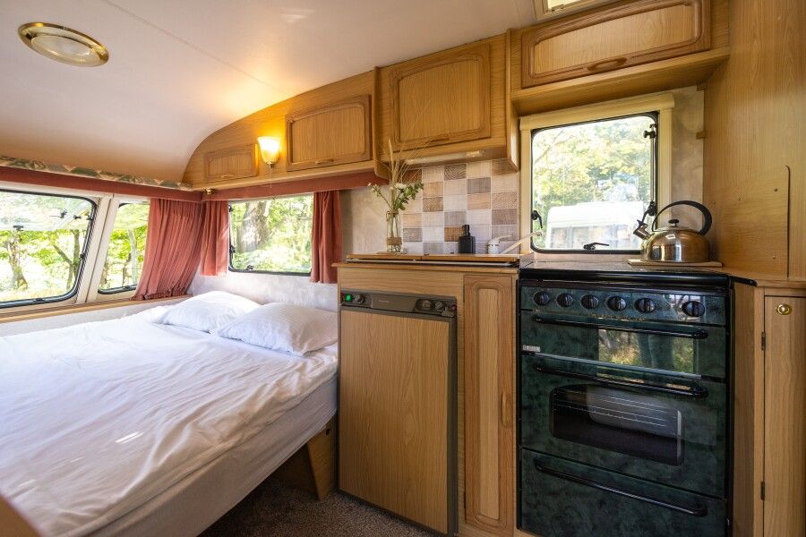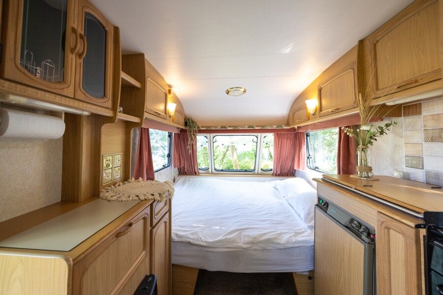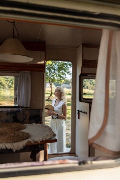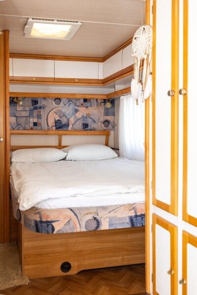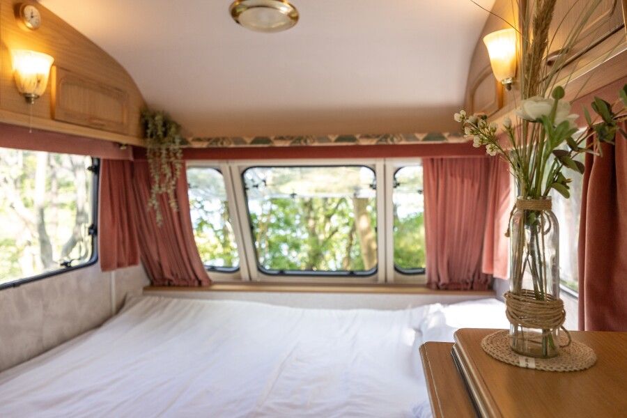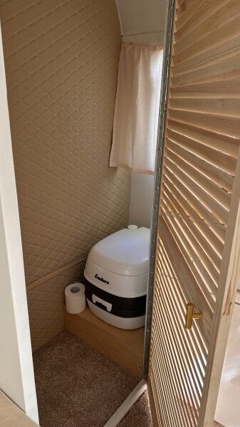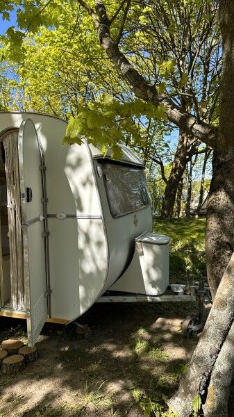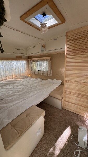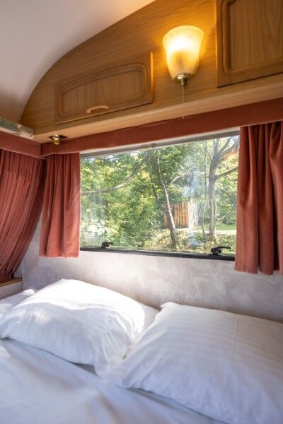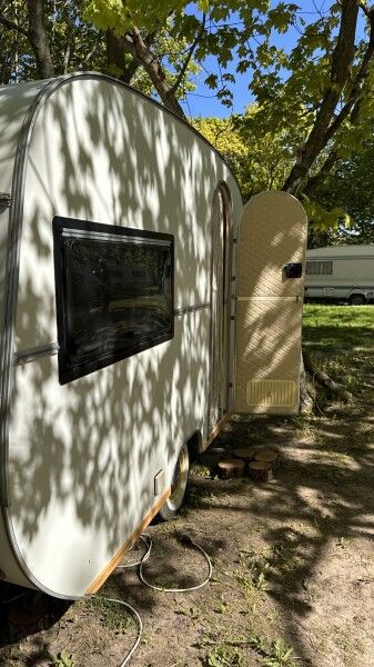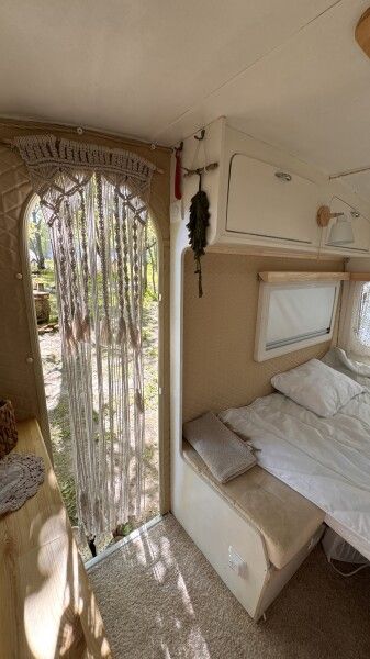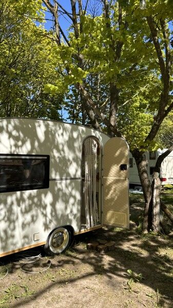 Отдых в этом домике перенесет вас во времена хиппи, пацифистов и The Beatles. Он изготовлен в 1969 году, а сейчас, полностью реставрирован. Идеально подходит для фотосессий. Внутри домика есть большая двуспальная кровать (160*190), тёплый пол, кухонная зона с плитой и холодильником. Биотуалет внутри домика есть, но нет душа. Вода внутри домика только холодная. Душ с горячей водой находится рядом на полянке.