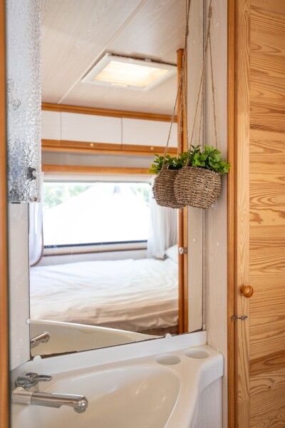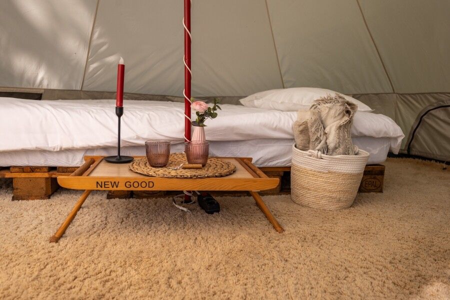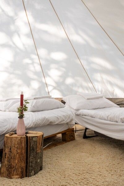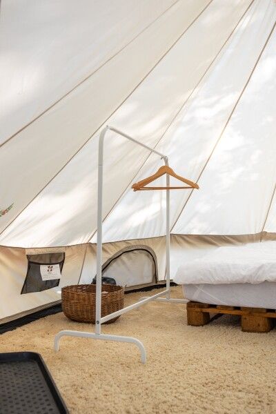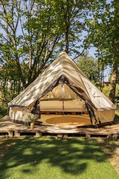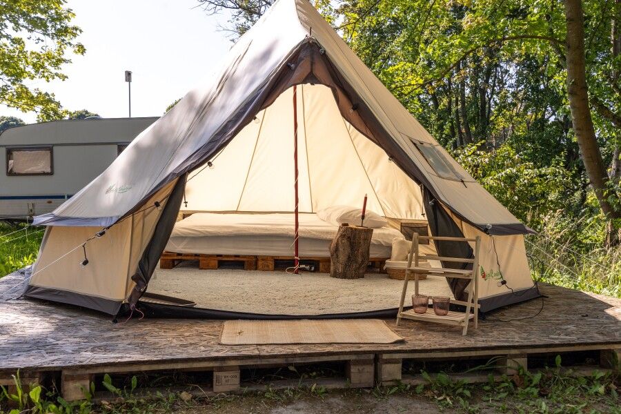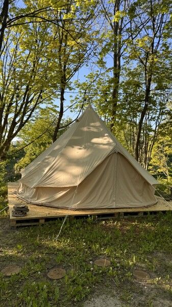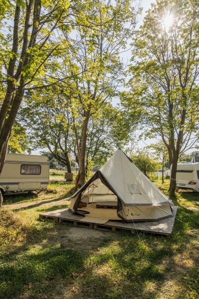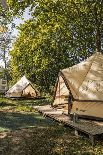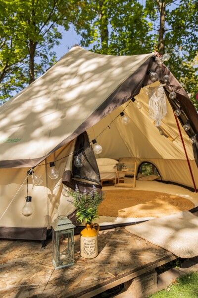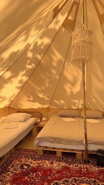 Очень просторный шатер для 4 человек располагается на лесной опушке кемпинга вблизи озера в тени деревьев. Внутри шатра двуспальная кровать 160*200 и две односпальные кровати 80*190. Возможно размещение дополнительно до 2-х детей до 3-х лет без дополнительного места. На полу — ковровое покрытие. Постельное белье и полотенца. Есть теплые пледы, обогреватель, электричество. Вентиляция со всех сторон обеспечивает правильную циркуляцию воздуха. Есть вешалка для одежды, питьевая вода, бокалы. Туалет и душ — общие (150 метров от шатра). До моря 770 метров.