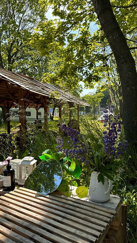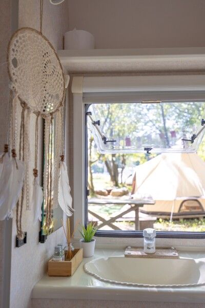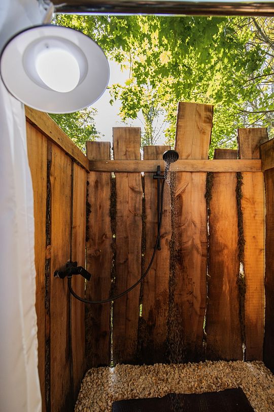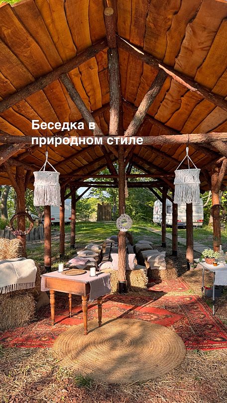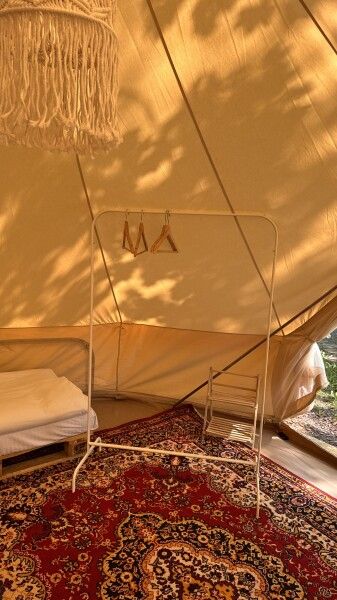 Все шатры и автодома оформлены в стиле бохо. Дружелюбная атмосфера располагает к знакомствам и общению у костра. Уличный душ с горячей водой под деревом и видом на звёзды не оставит равнодушным никого.