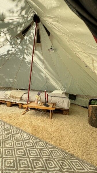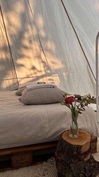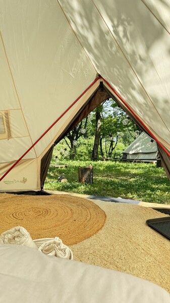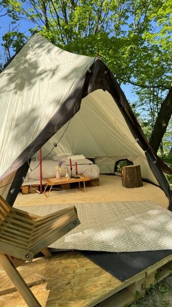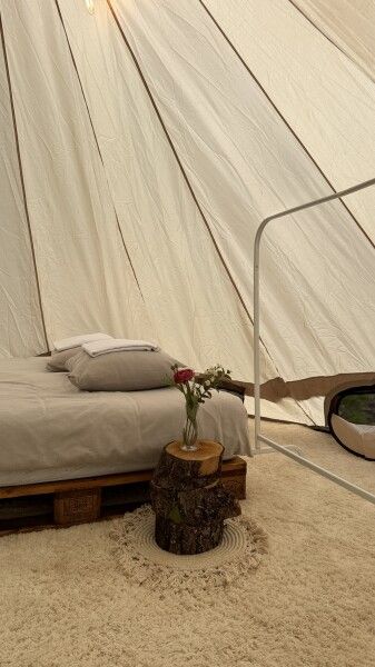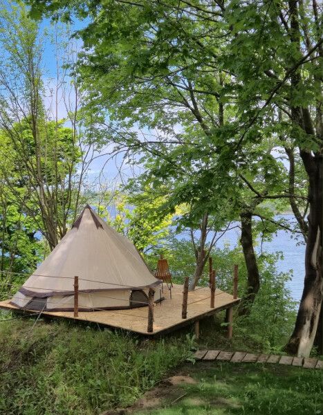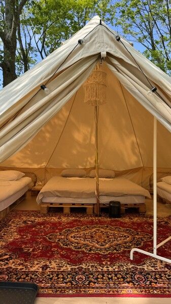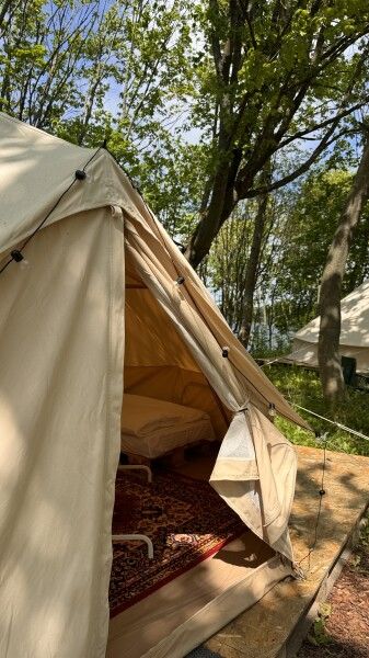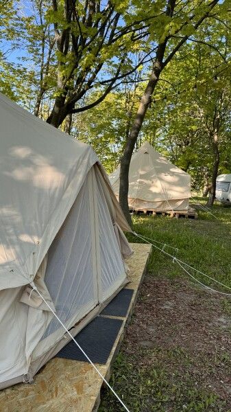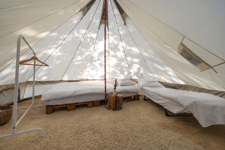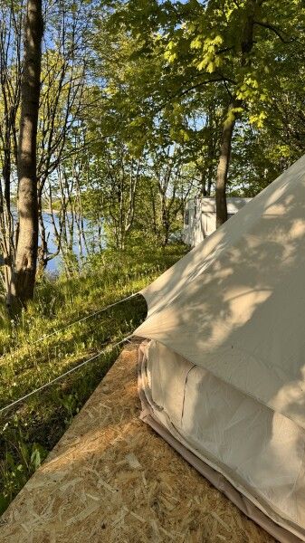 Палатка-шатер для 2-4 человек располагается на лесной полянке возле озера в тени деревьев. Внутри есть двуспальная кровать, возможно установить до 2-х дополнительных мест — раскладушек с матрасами. На полу — ковровое покрытие. Постельное белье и полотенца. Есть теплые пледы, обогреватель, электричество. Вентиляция со всех сторон обеспечивает правильную циркуляцию воздуха. Есть вешалка для одежды, питьевая вода, бокалы. Туалет и душ — общие (70 метров от шатра). До озера 100 метров; До моря 770 метров.