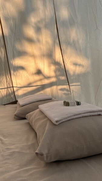 Вентиляция со всех сторон обеспечивает правильную циркуляцию воздуха. Есть вешалка для одежды, питьевая вода, бокалы. Туалет и душ — общие (150 метров от шатра). До моря 770 метров.