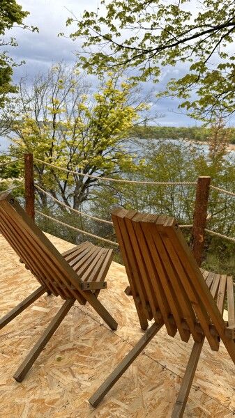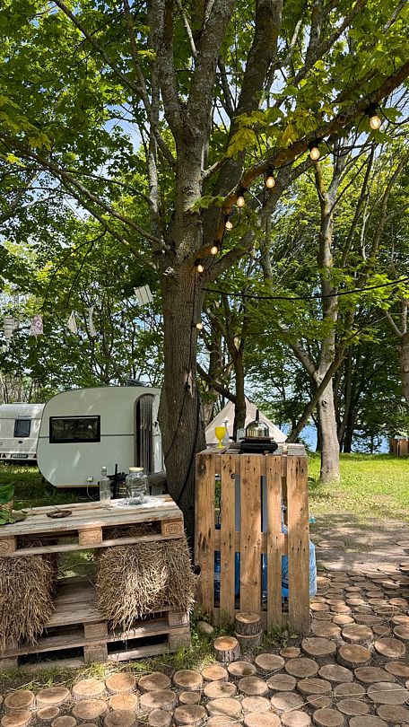 Атмосферный кемпинг на зелёной лужайке в тени деревьев у берега чистого и прозрачного озера «Синявинское» — бывшего карьера по добыче янтаря. Здесь есть автодома, шатры для проживания, зона барбекю, костёр, уличная кухня и чилл-зона.
