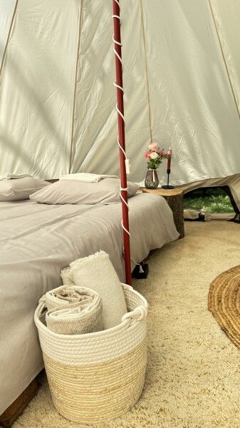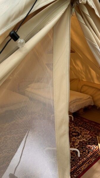 Внутри шатра двуспальная кровать 160*200, возможно размещение только взрослых, без детей. На полу — ковровое покрытие. Постельное белье и полотенца. Есть теплые пледы, обогреватель, электричество.