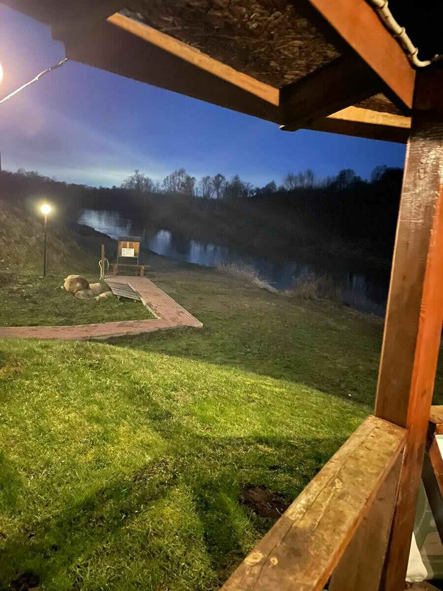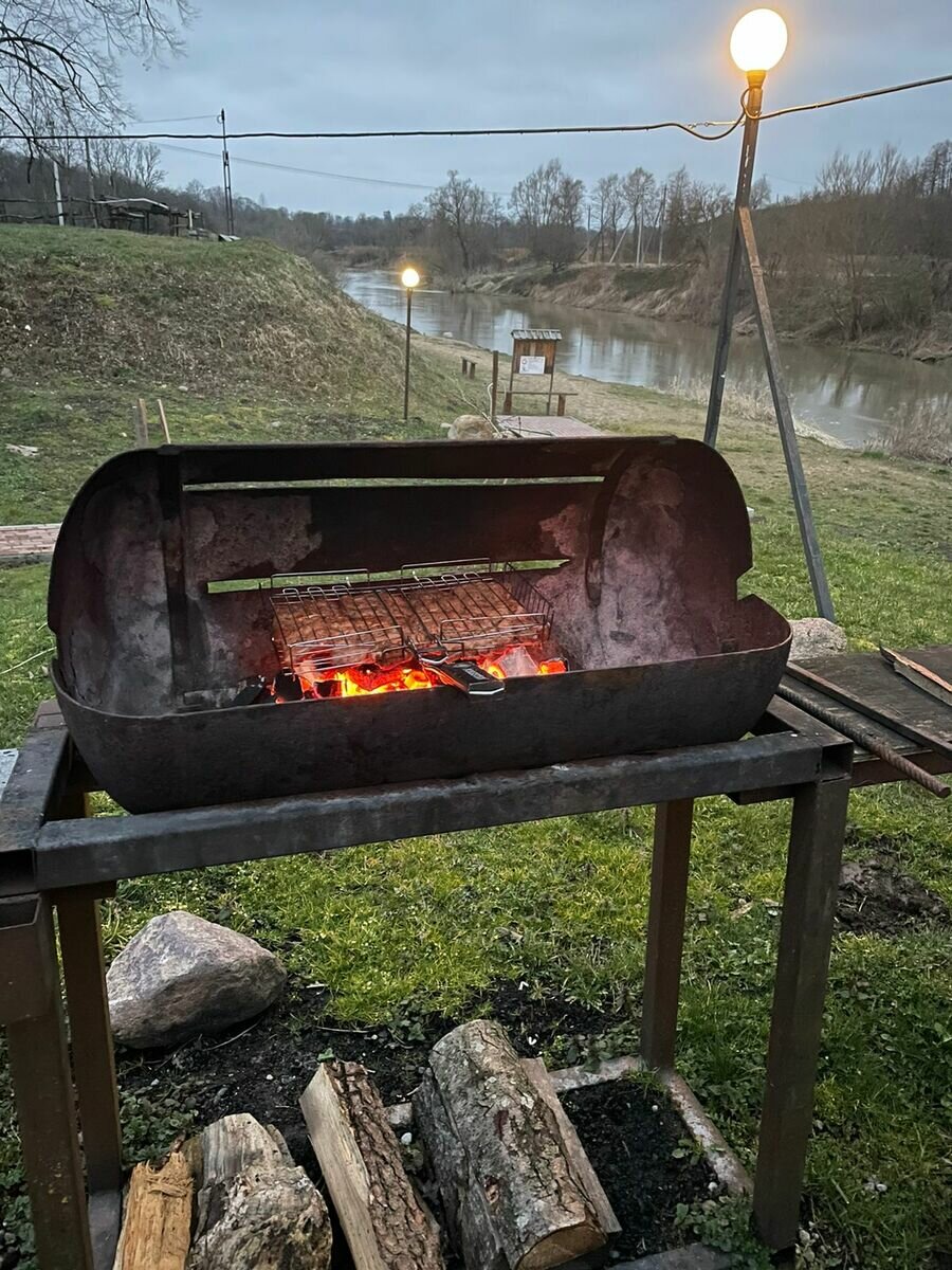 Черная (мягкая): беседка, мангал, дрова, свой спуск в реку, освещение, розетки, бак с водой, таз.