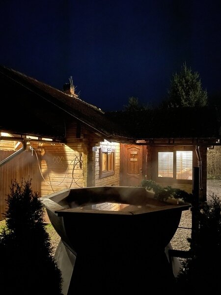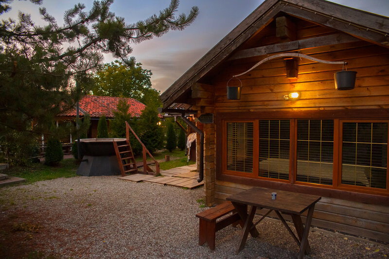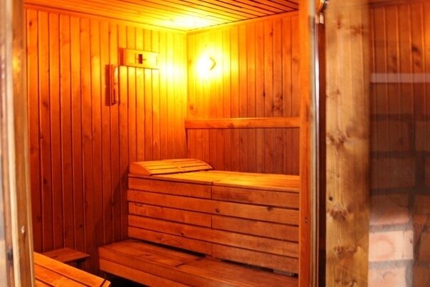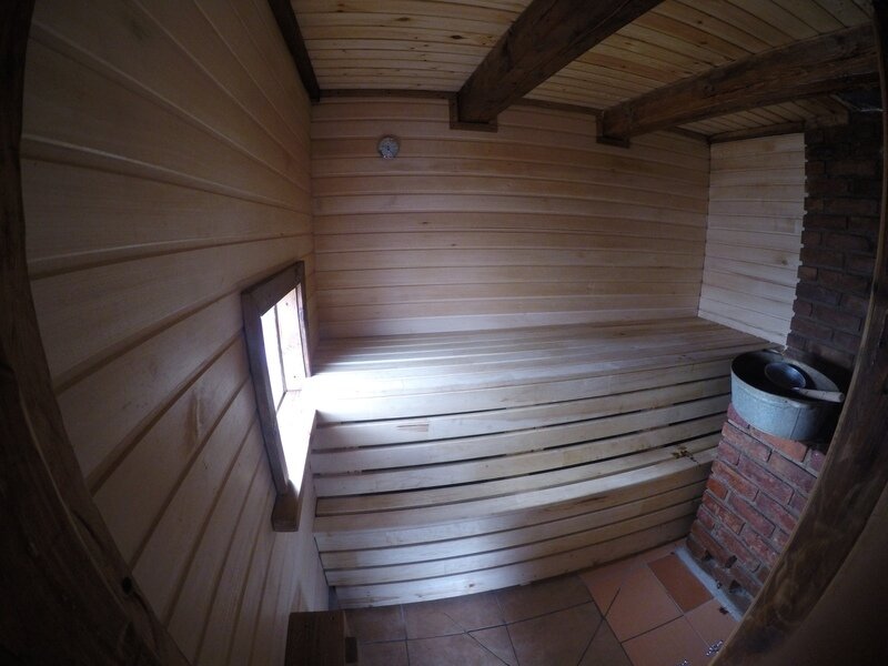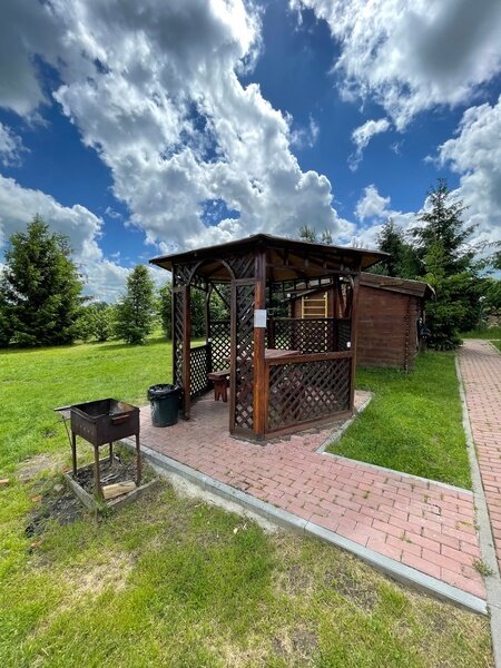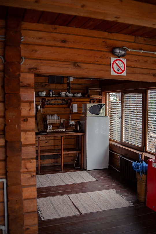 Зона барбекю, холодильник, микроволновка, 2 душа, 3 санузла, купель, каминный зал для отдыха, посуда, чайник.