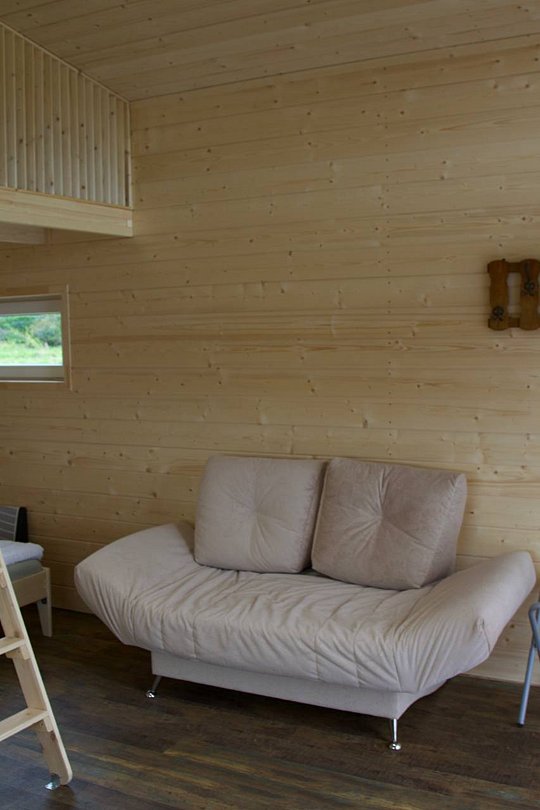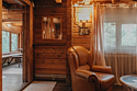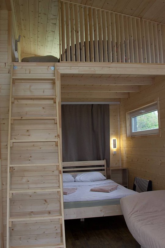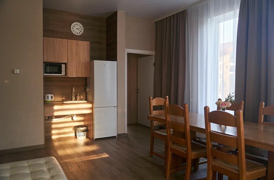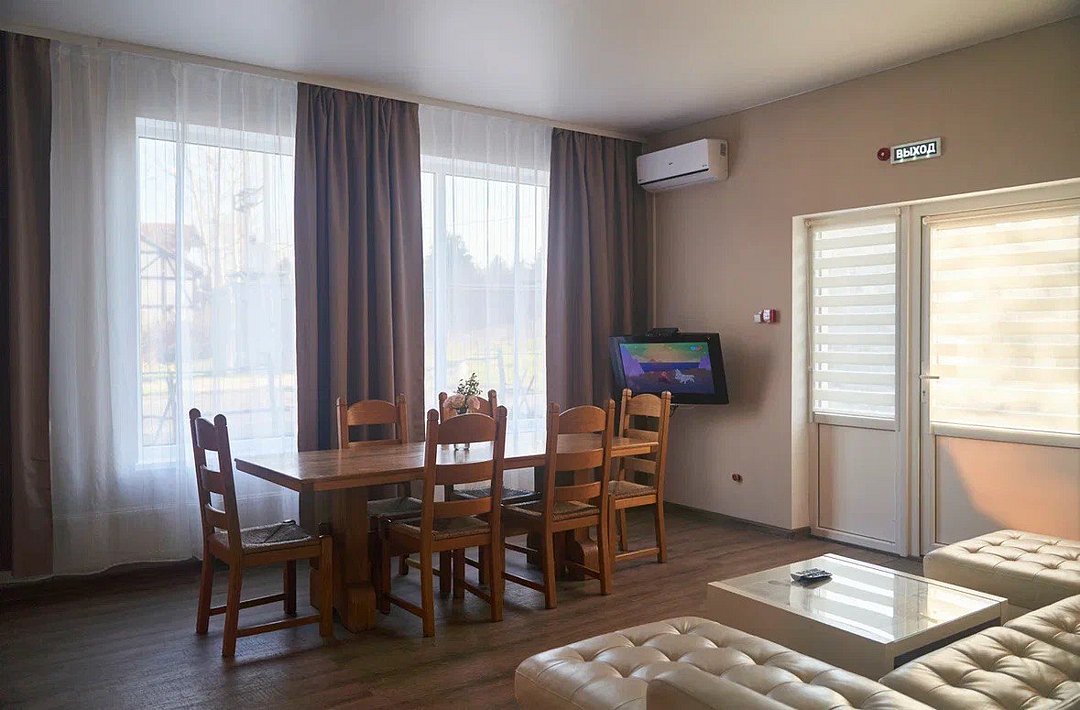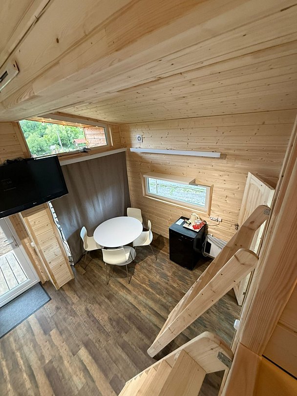 Деревянный дом, со своей мини кухней, гостиной и спальней. состоит из трех комнат: общая спальня, гостиная с раскладным диваном и зона кухни со столом. В домике есть: тв, холодильник, русская баня на дровах, санузел, банный чан оплачивается дополнительно.