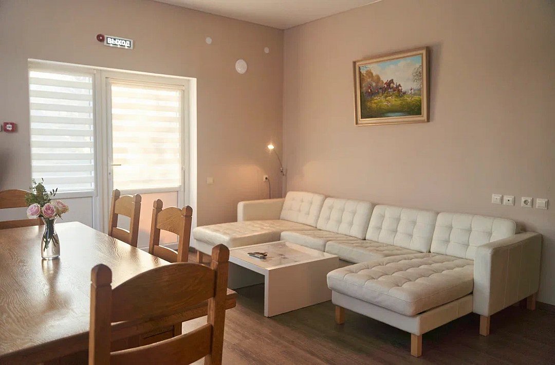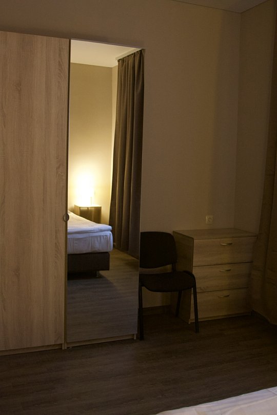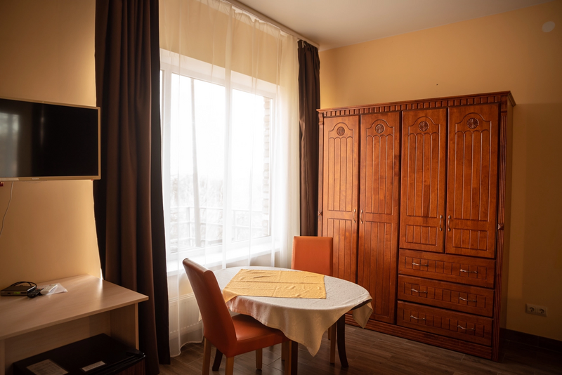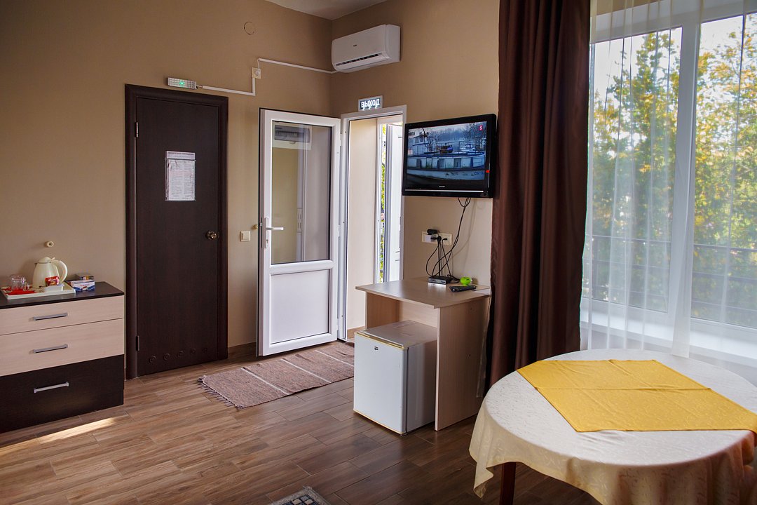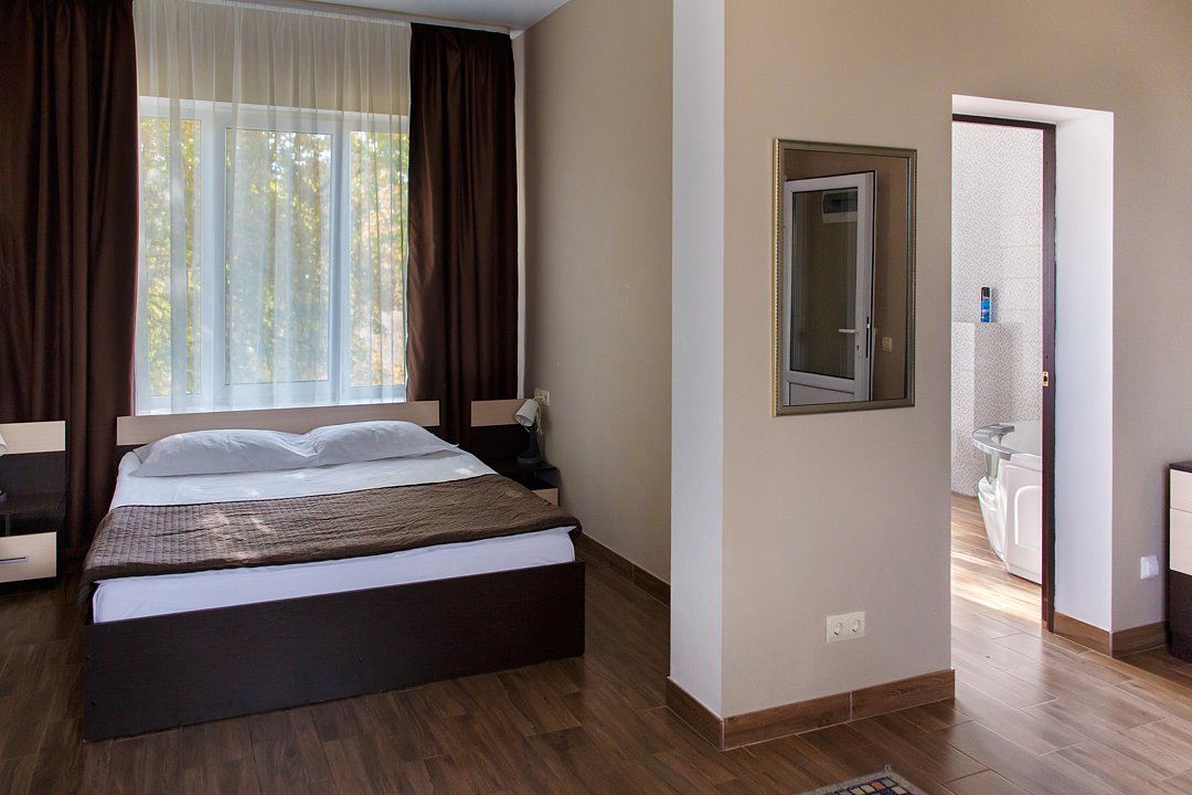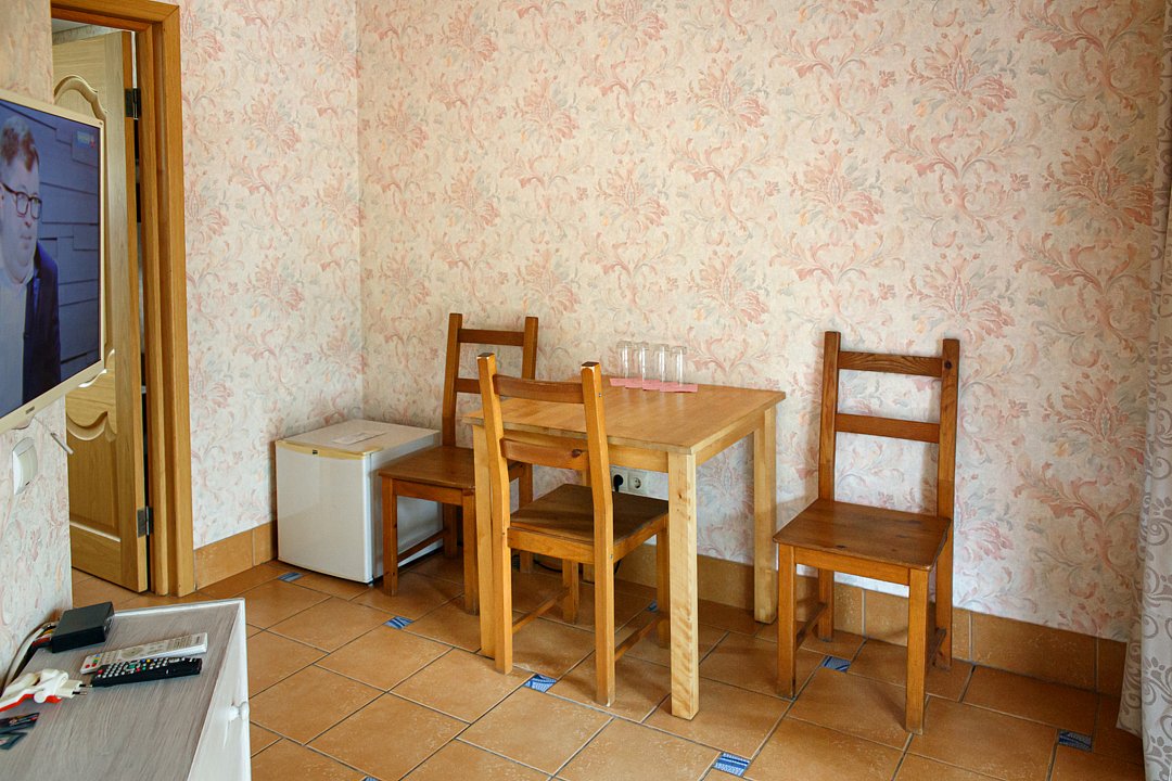 В номере двуспальная кровать, диван, 2 мини-бара, 4 стакана, TV плоский экран. Wi-Fi, шкаф, приставка цифровая ТВ, стол, стулья, зеркало.