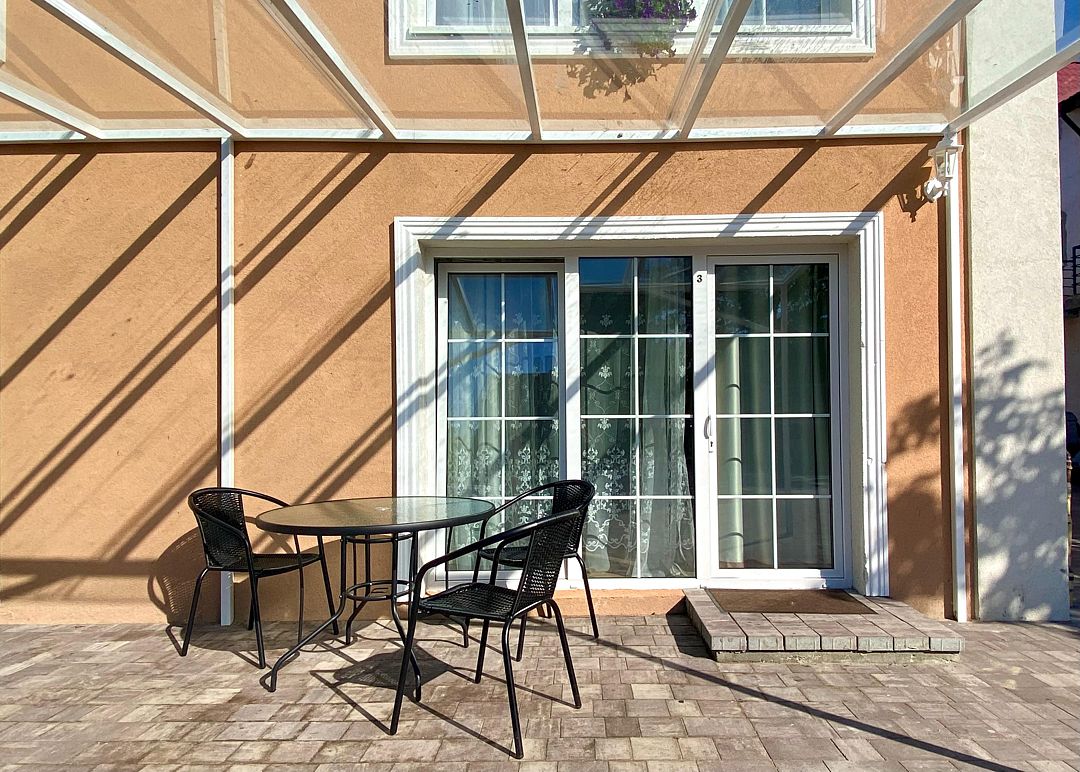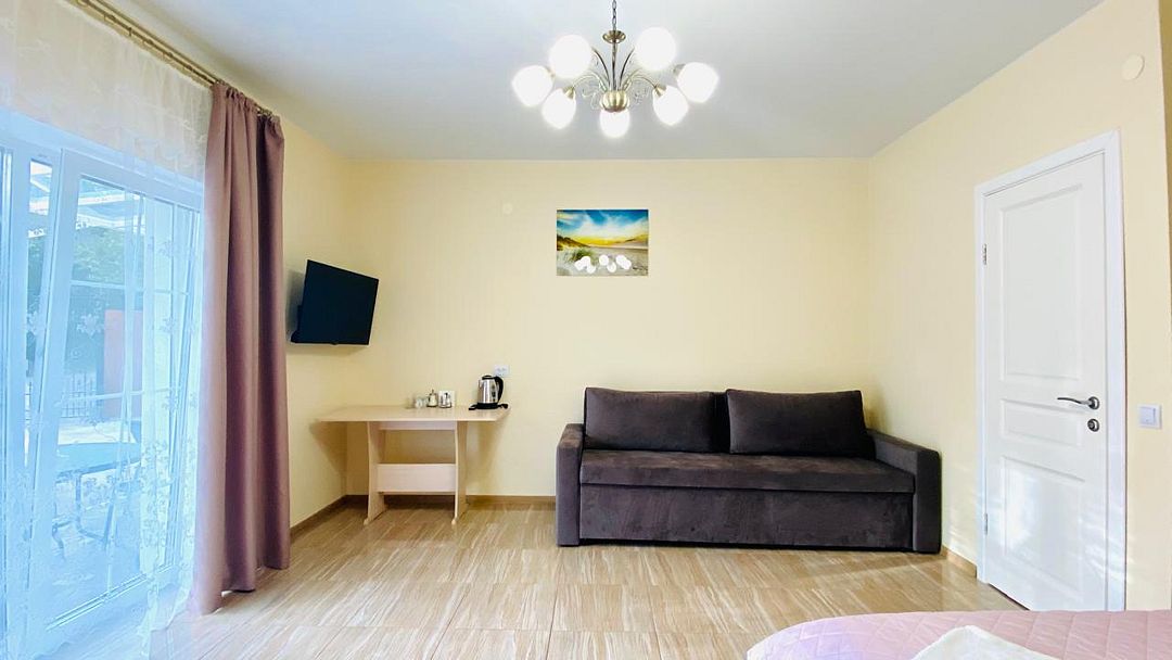 Однокомнатный номер с отдельным входом, расположенный на первом этаже двухэтажного дома.