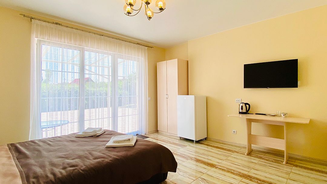 Однокомнатный номер с отдельным входом, расположенный на первом этаже двухэтажного дома.