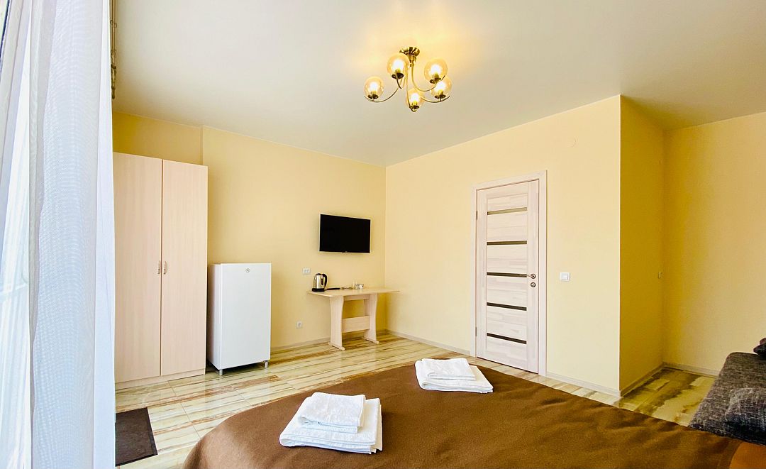 Номер обставлен новой мебелью и оборудован современной техникой. В вашем распоряжении телевизор, чайник, холодильник, микроволновая печь, посуда и фен.