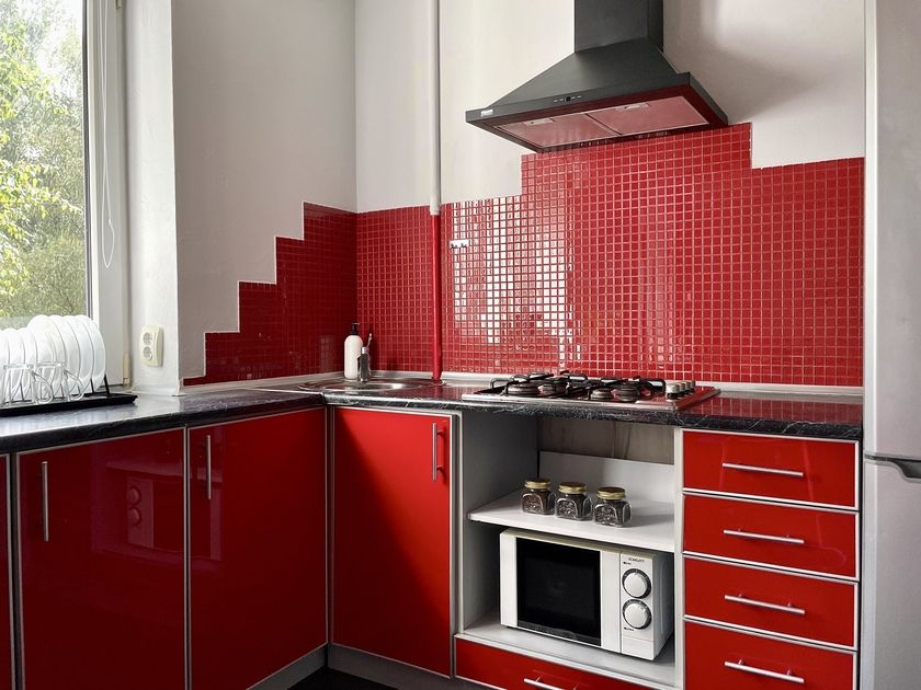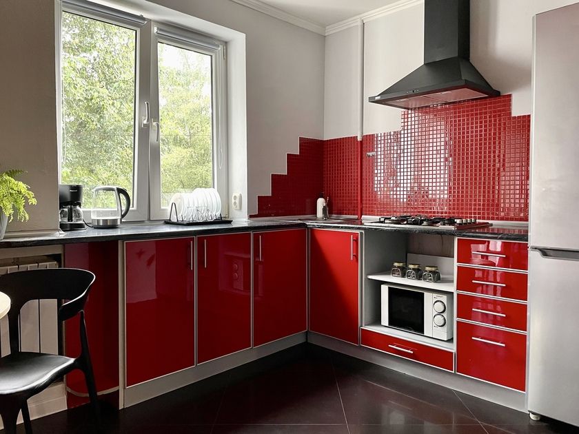 Кухня оборудована всем необходимым: микроволновой печью, холодильником, плитой и посудой.