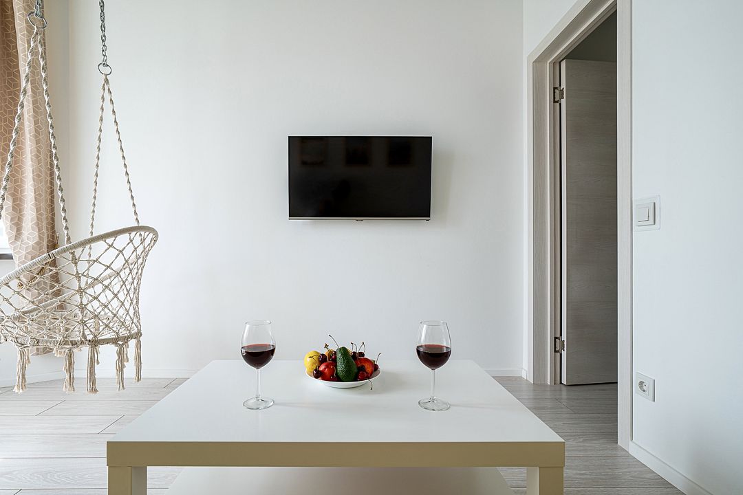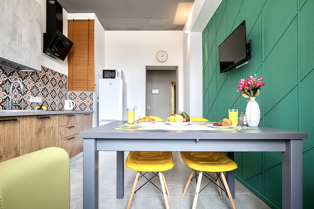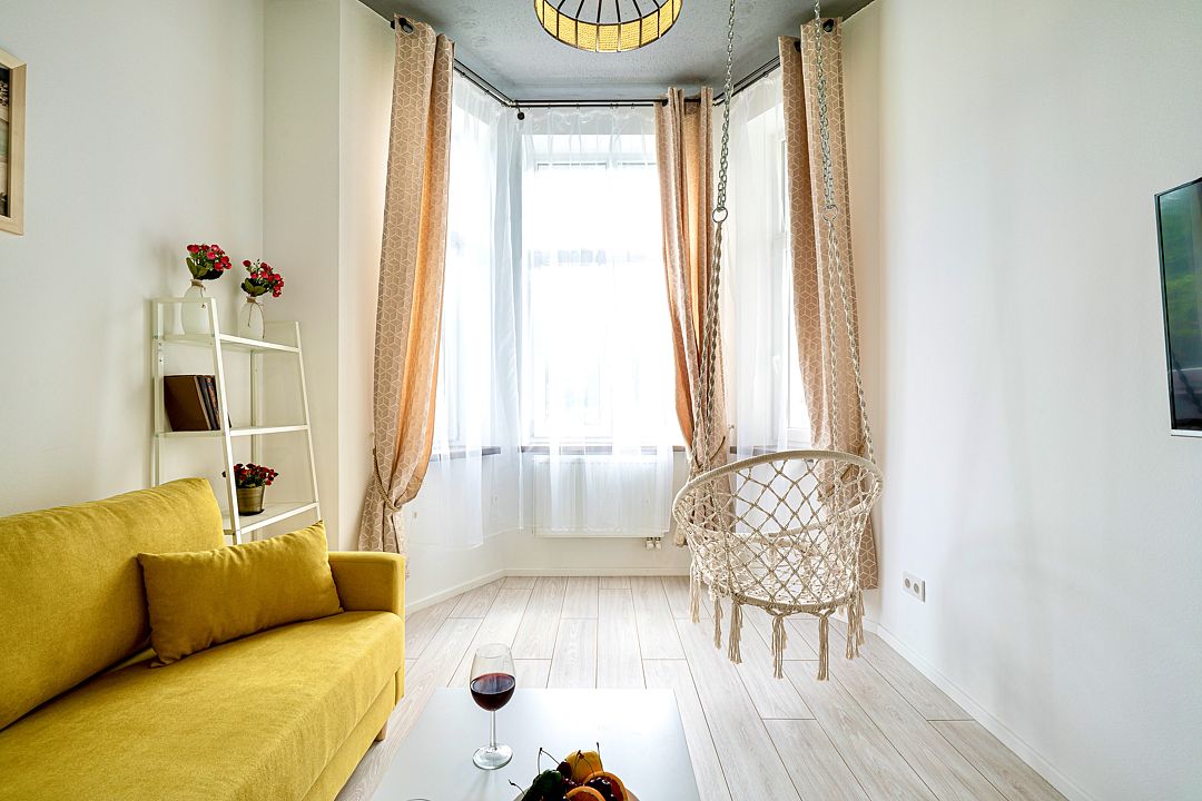 Апартаменты-это просторная квартира с полноценной кухней, отдельной спальней, гостиной с качелью и удобной ванной комнатой.