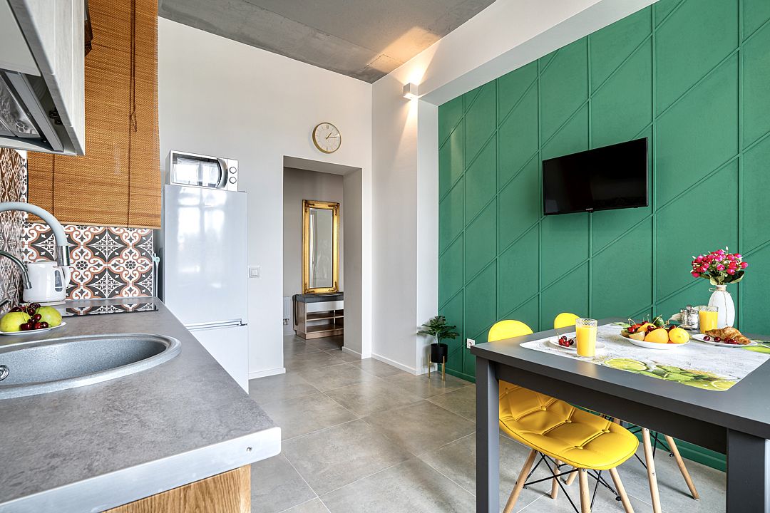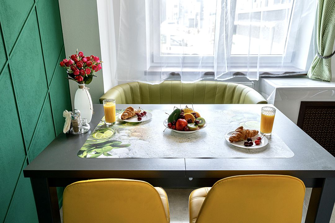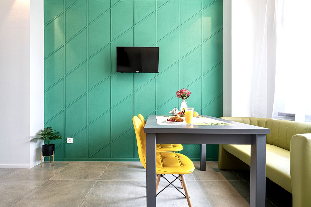 Яркие, комфортабельные апартаменты с удобной кроватью, раскладным диваном, прикроватными тумбочками и вместительным шкафом.
