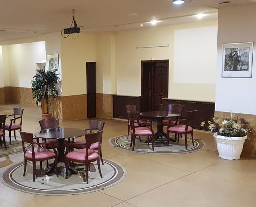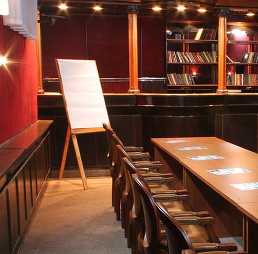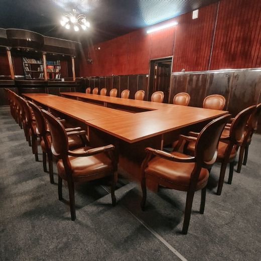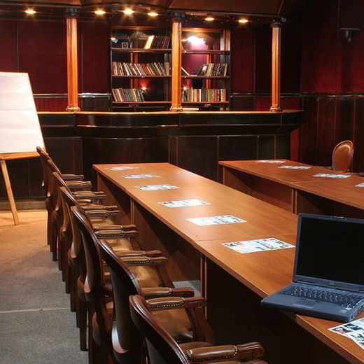 В вашем распоряжении комната переговоров на 20 человек, в которой стены обшиты тканью вишневого цвета, что создает торжественную атмосферу, столы расставлены в П-образной форме.