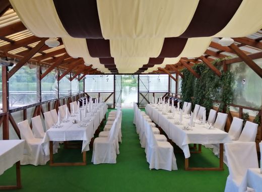 - летнее крытое кафе у озера;