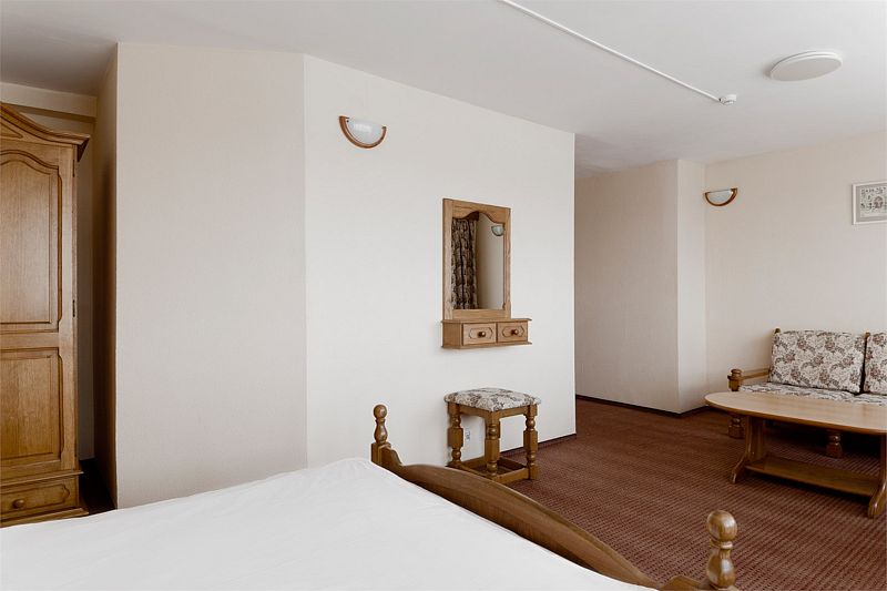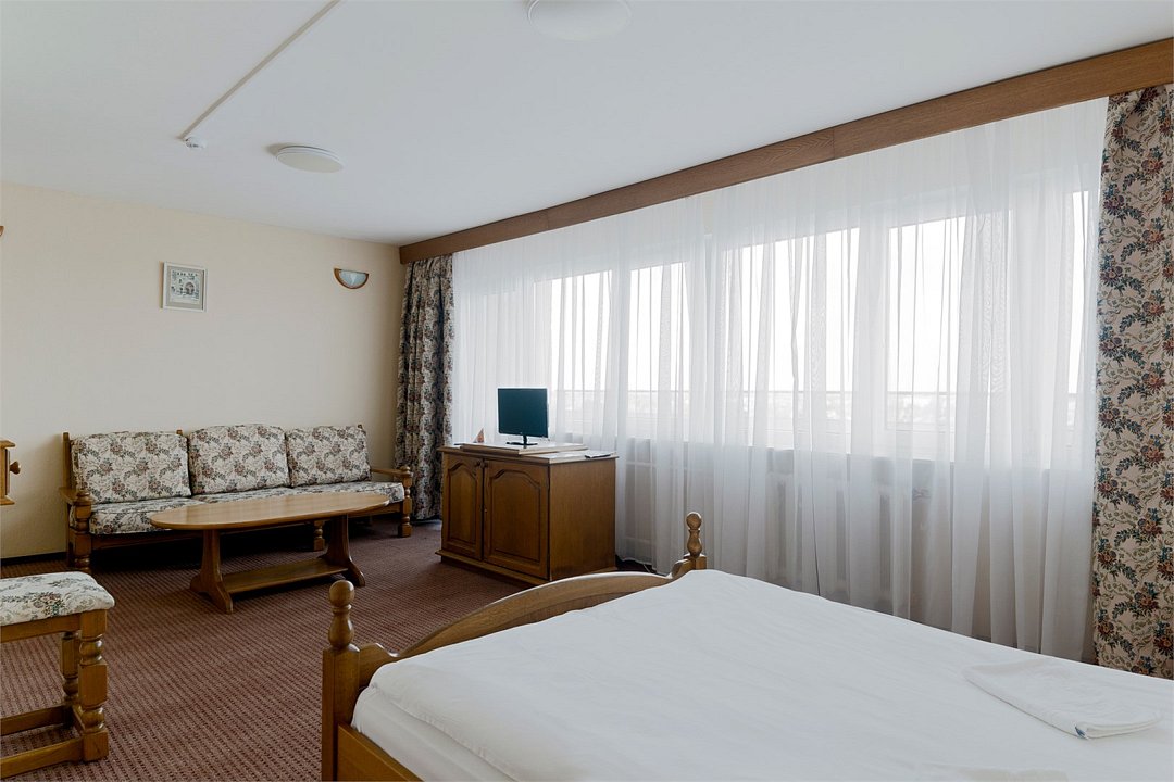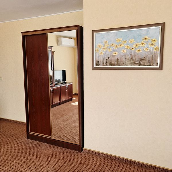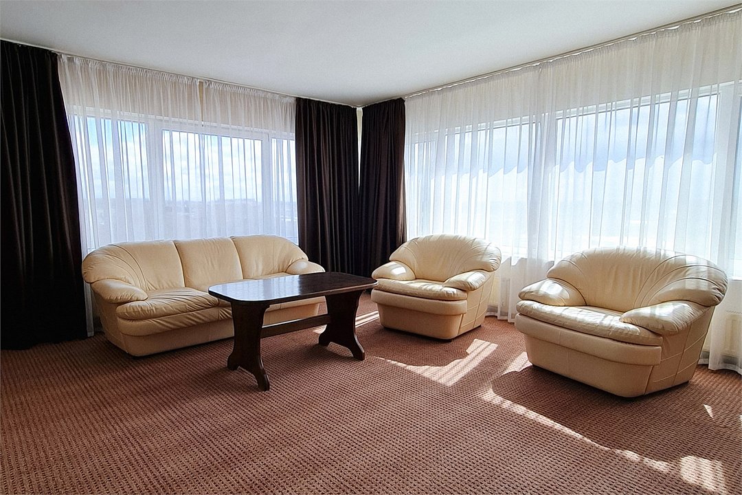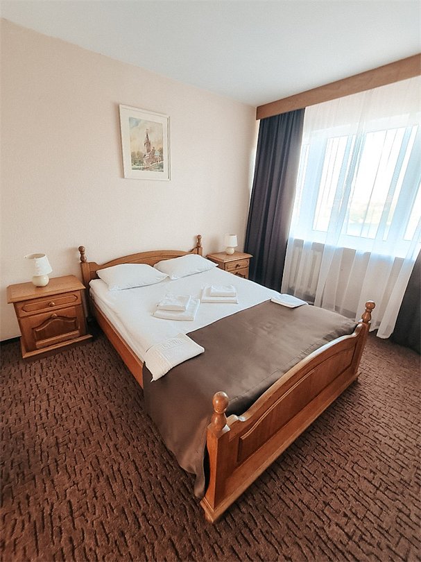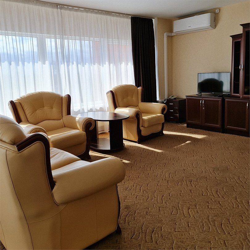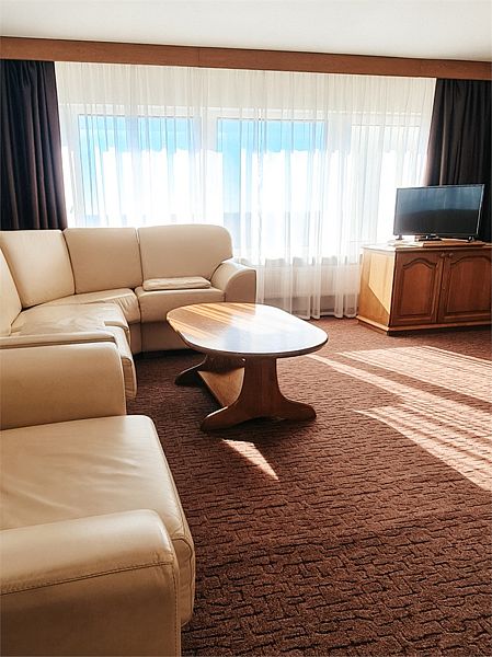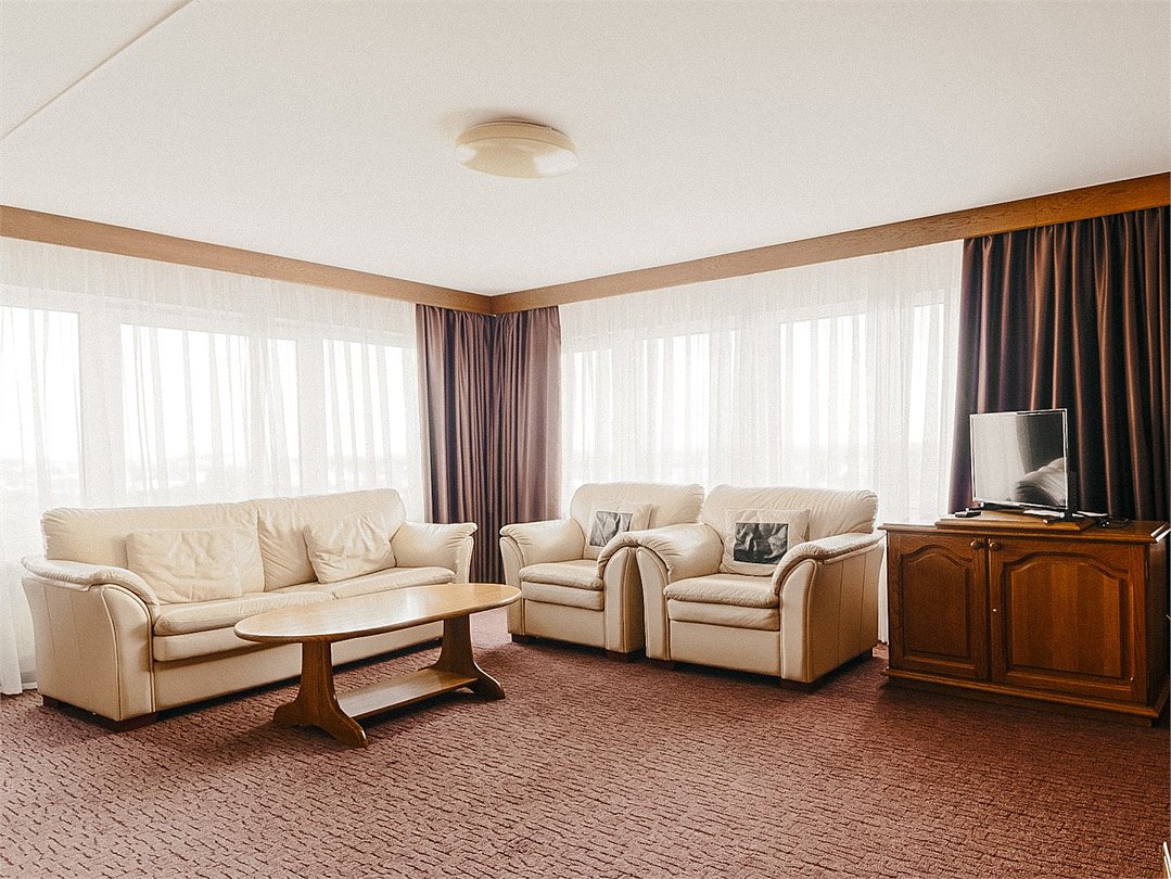 Двухкомнатные панорамные номера - безупречный вариант, если для вас важно иметь много пространства и раздельные зоны для сна, отдыха и работы. Элегантный дизайн и продуманная планировка создают прекрасные возможности для проведения деловых переговоров прямо в номере. Номер так же идеально подойдет, если вы едите семьей. В номере одна спальня и отдельная гостиная комната с раскладывающимся диваном, при необходимости здесь могут разместиться с комфортом 3 гостя. Установленный в номере кондиционер (в гостиной комнате) обеспечит для Вас комфортную температуру. Во всех номерах данной категории из спальни открывается вид на озеро, а из гостиной комнаты – на окрестности города. В номере есть все необходимое для проживания: мини-холодильник, раздельный или совмещенный санузел с бесплатными туалетными принадлежностями, фен, бесплатный Wi Fi, телевизор, телефон. Кулер с горячей\холодной водой и гладильные принадлежности находятся на этаже в свободном доступе. Чайник выдается бесплатно по запросу на рецепции отеля. *стиль оформления номеров аналогичной категории незначительно отличаетсяУслуги и удобства