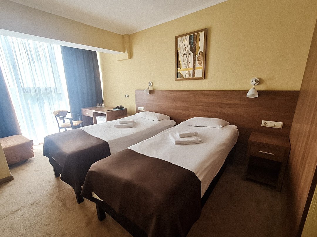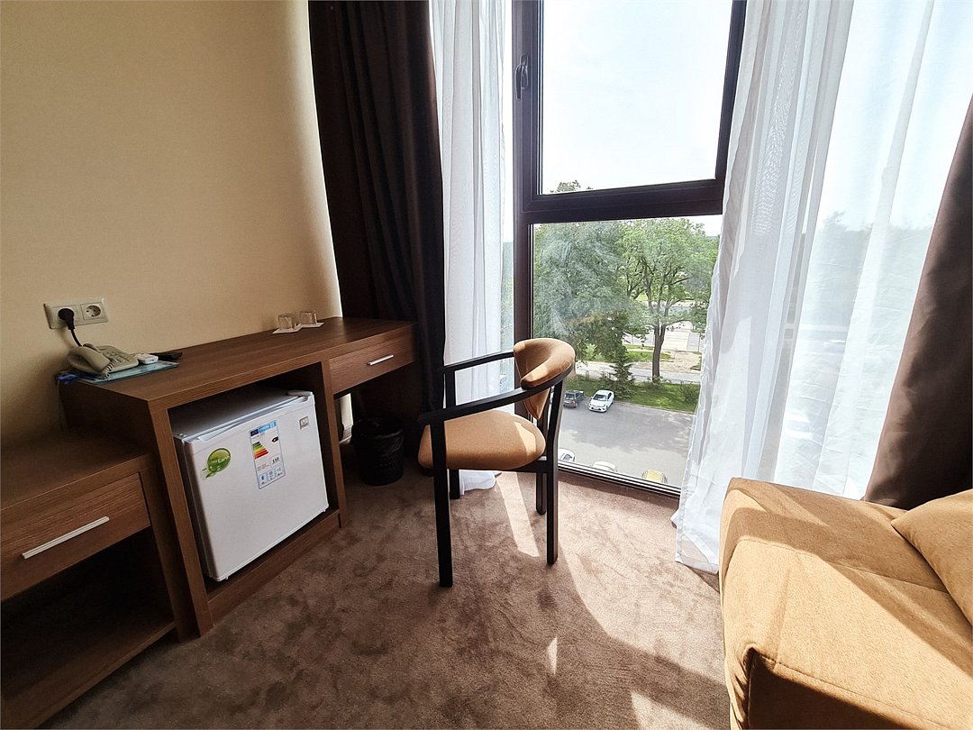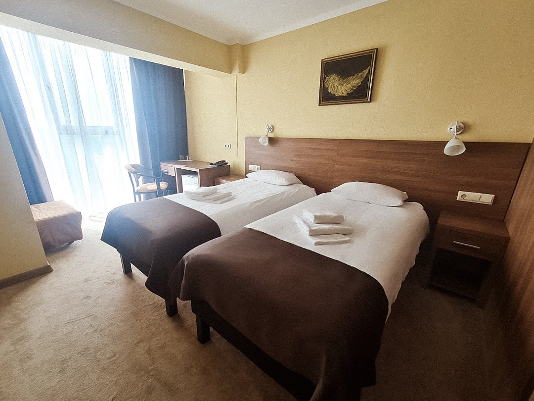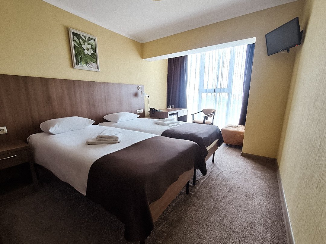 Двухместный номер Комфорт Плюс с раздельными или общей кроватями с видом на город - однокомнатные номера в современном стиле, расположенные с четвертого по пятый этажи отеля, с панорамным видом из окна на окрестности города. Для комфортного пребывания в номерах имеются: ванная комната с ванной или душем и бесплатными туалетными принадлежностями, фен, бесплатный Wi Fi, телевизор, телефон, мини-холодильник. В номере установлены кровати-трансформеры. При бронировании у Вас есть возможность выбрать тип кровати: две раздельные (каждая 90*200 см.) или одна общая (180*200 см.). Установленный в номере кондиционер обеспечит для Вас комфортную температуру. При необходимости здесь могут разместиться с комфортом 3 гостя — для этого в номер устанавливается дополнительное место (кресло системы аккордеон 70*180 см.).Кулер с горячей\холодной водой и гладильные принадлежности находятся на этаже в свободном доступе. Чайник выдается бесплатно по запросу на рецепции отеля.Услуги и удобства
