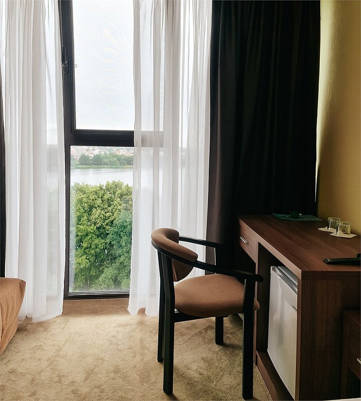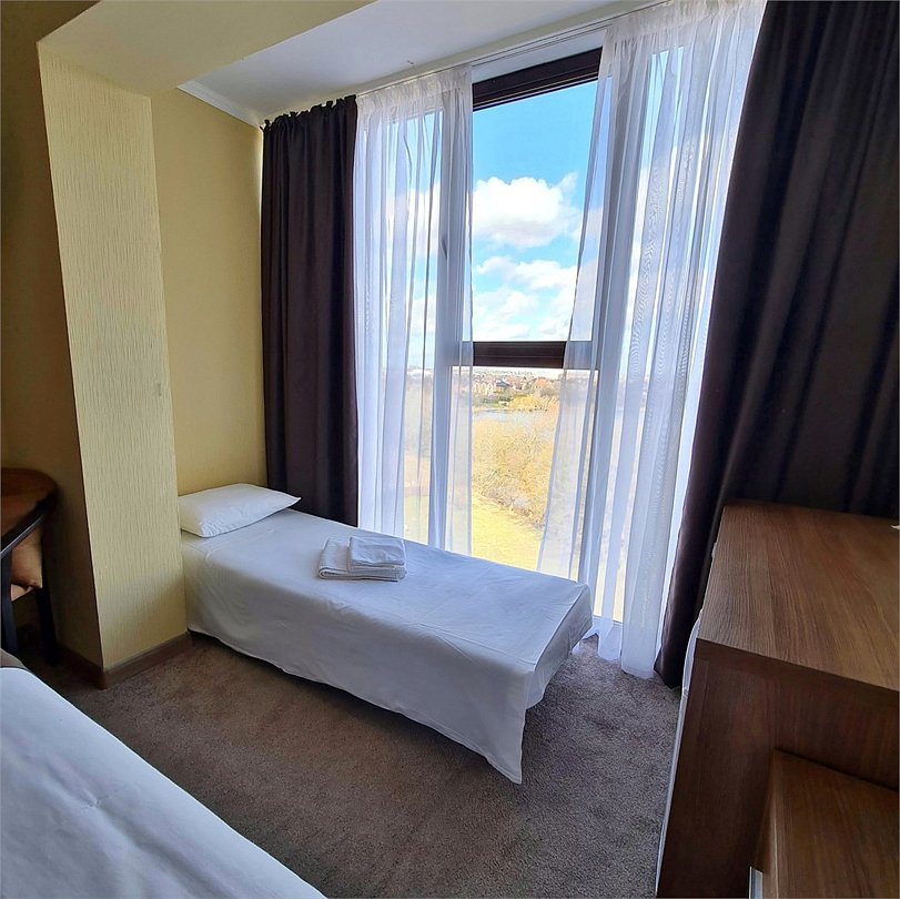 Двухместный номер Комфорт Плюс с раздельными или общей кроватями с видом на озеро - однокомнатные номера в современном стиле, расположенные с четвертого по пятый этажи отеля, с панорамным видом из окна на озеро. Для комфортного пребывания в номерах имеются: ванная комната с ванной или душем и бесплатными туалетными принадлежностями, фен, бесплатный Wi Fi, телевизор, телефон, мини-холодильник. В номере установлены кровати-трансформеры. При бронировании у Вас есть возможность выбрать тип кровати: две раздельные (каждая 90*200 см.) или одна общая (180*200 см.). Установленный в номере кондиционер обеспечит для Вас комфортную температуру. При необходимости здесь могут разместиться с комфортом 3 гостя — для этого в номер устанавливается дополнительное место (кресло системы аккордеон 70*180 см.).Кулер с горячей\холодной водой и гладильные принадлежности находятся на этаже в свободном доступе. Чайник выдается бесплатно по запросу на рецепции отеля.Услуги и удобства