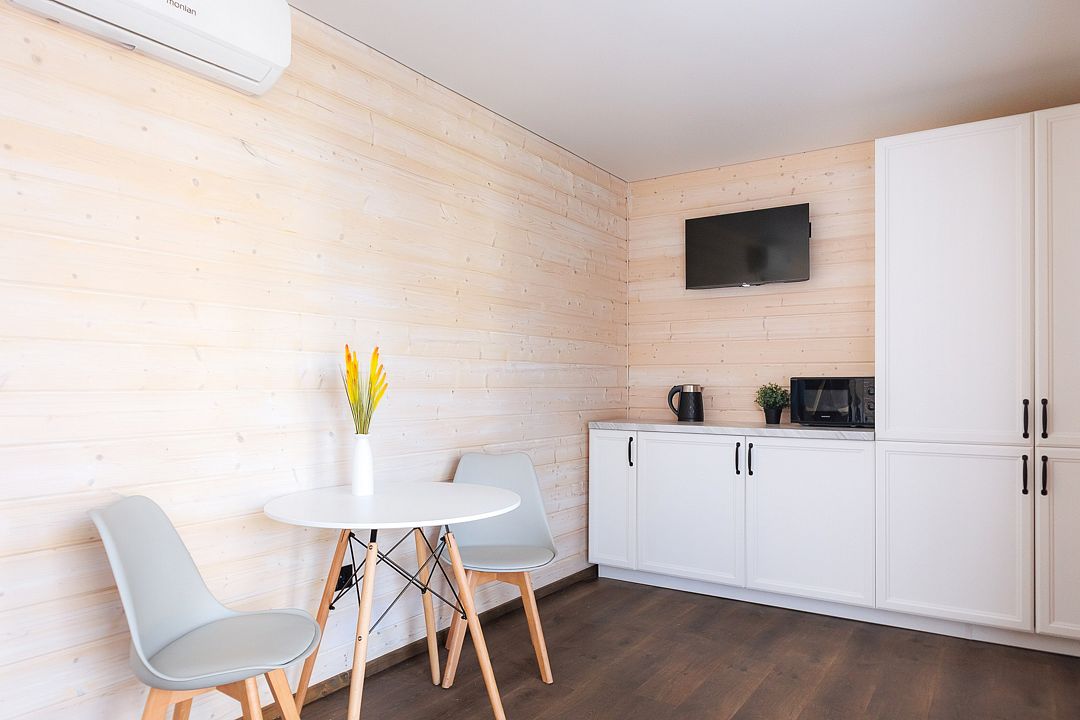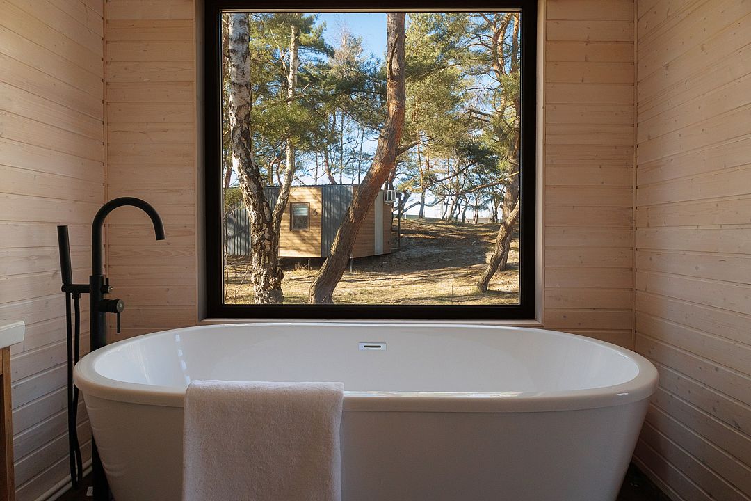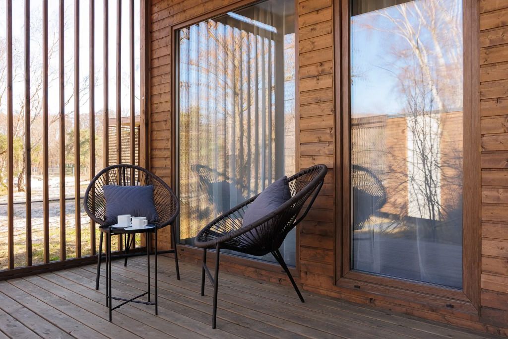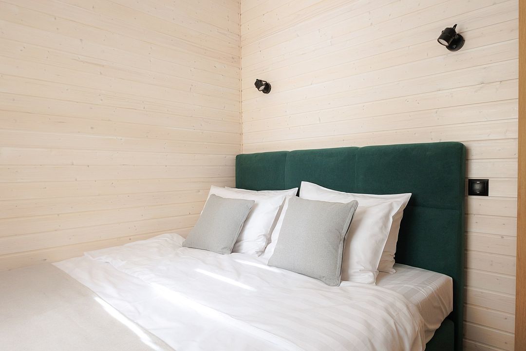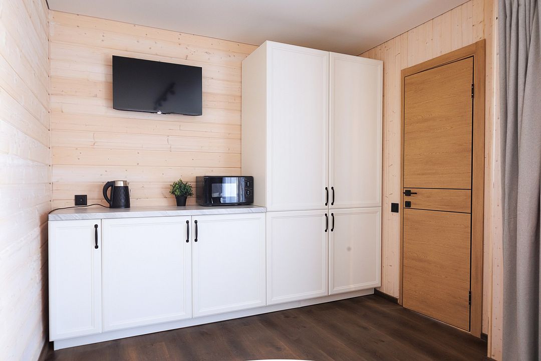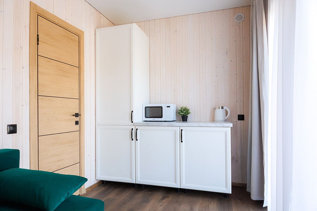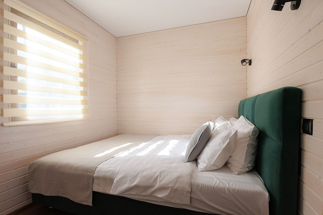 Уютный дом с панорамными окнами и просторной террасой идеально подходит как для романтического отдыха двоих, так и для размещения всей семьёй. Особый шарм — ванная комната с панорамным остеклением, где можно принимать душ, наслаждаясь окружающей тишиной и красотой хвойного леса.