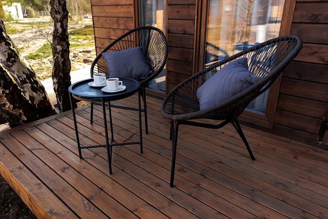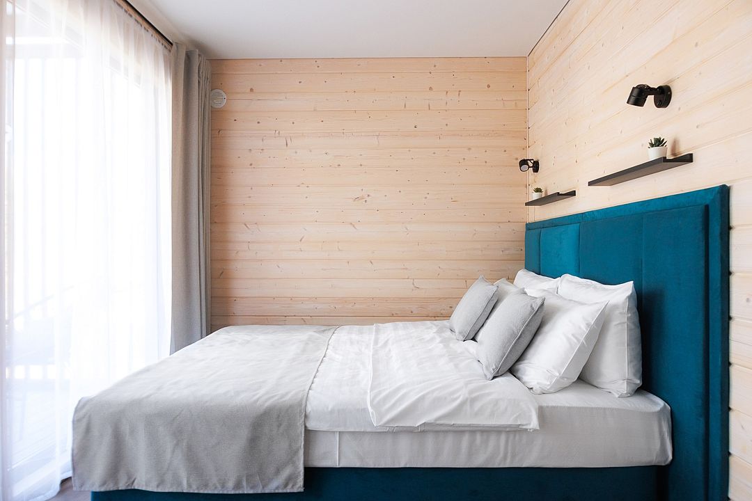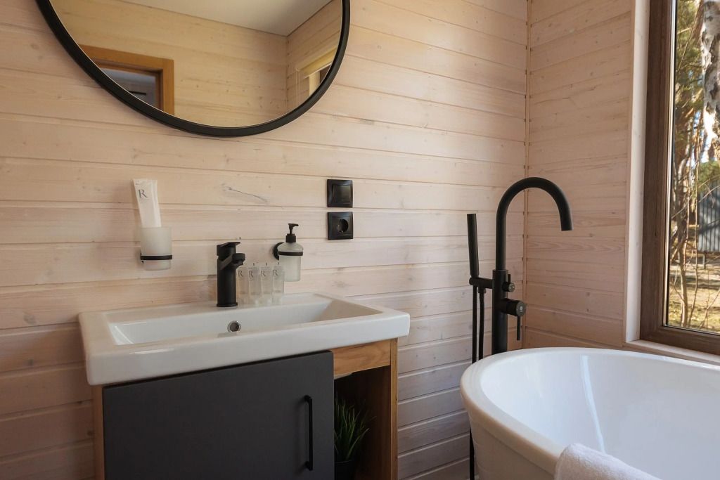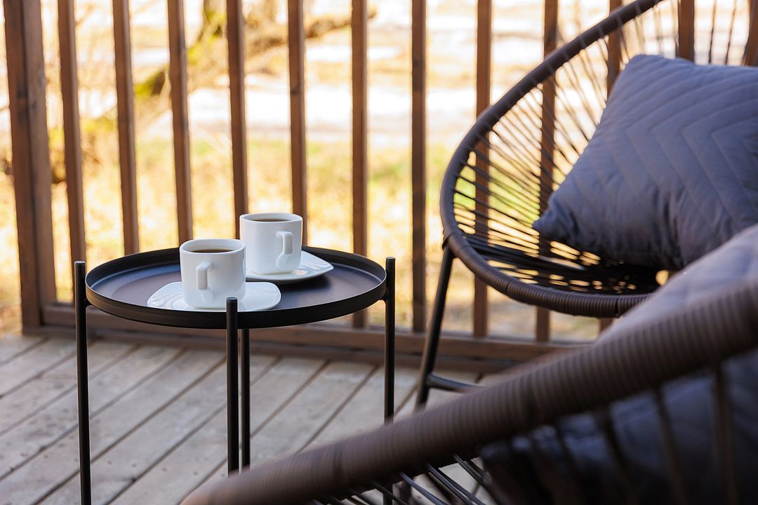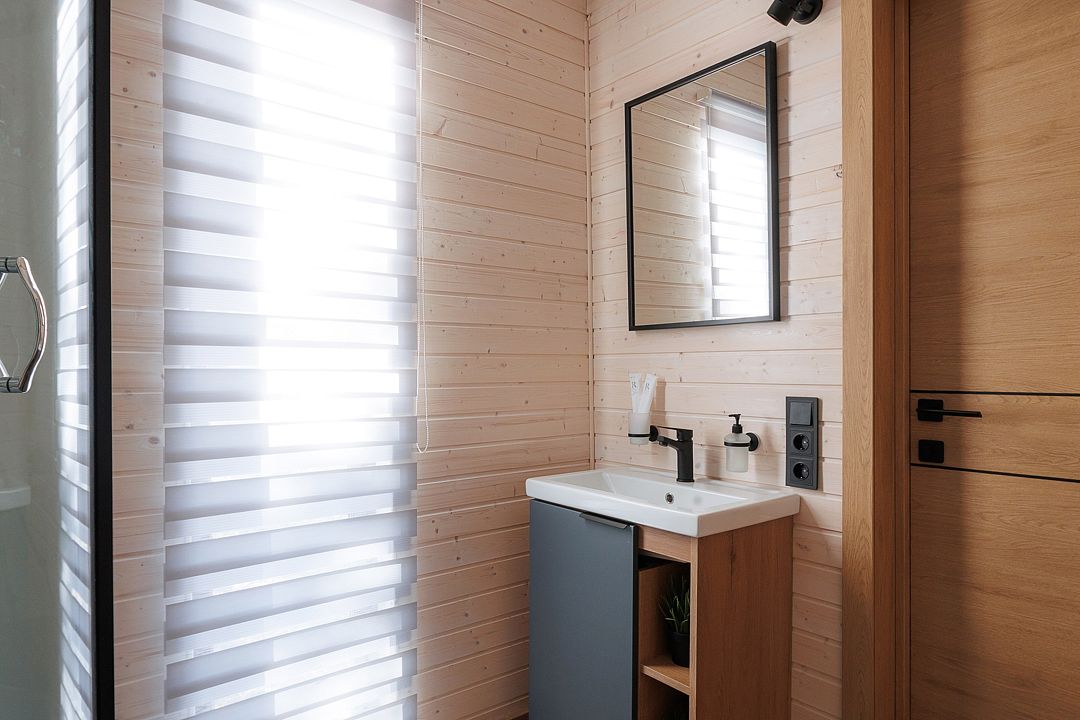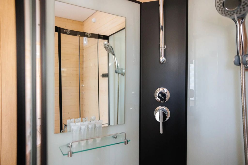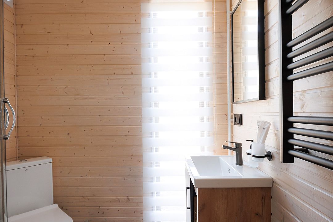 Уютный дом с панорамными окнами и просторной террасой идеально подходит как для романтического отдыха двоих, так и для размещения всей семьёй. Особый шарм — ванная комната с панорамным остеклением, где можно принимать душ, наслаждаясь окружающей тишиной и красотой хвойного леса.