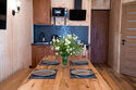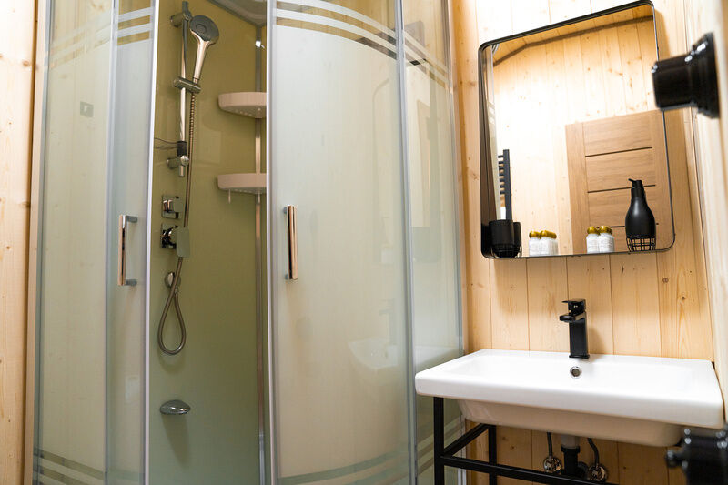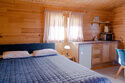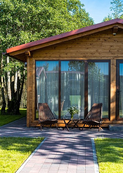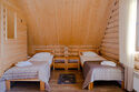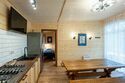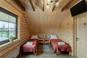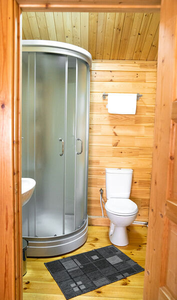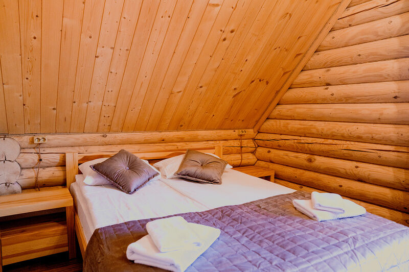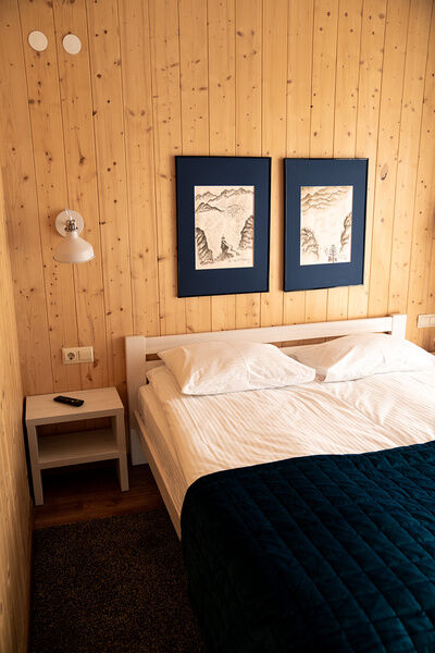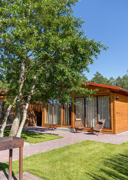 Коттедж с собственной кухней и обеденной зоной на отдельной приватной территории. В шале имеется две спальни, одна с двуспальной кроватью и одна с двумя односпальными кроватями. На территории у коттеджа есть беседка с мангалом, а также собственная баня.